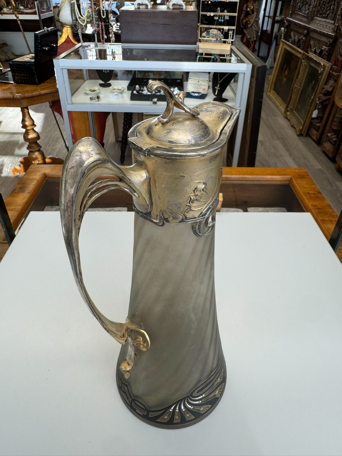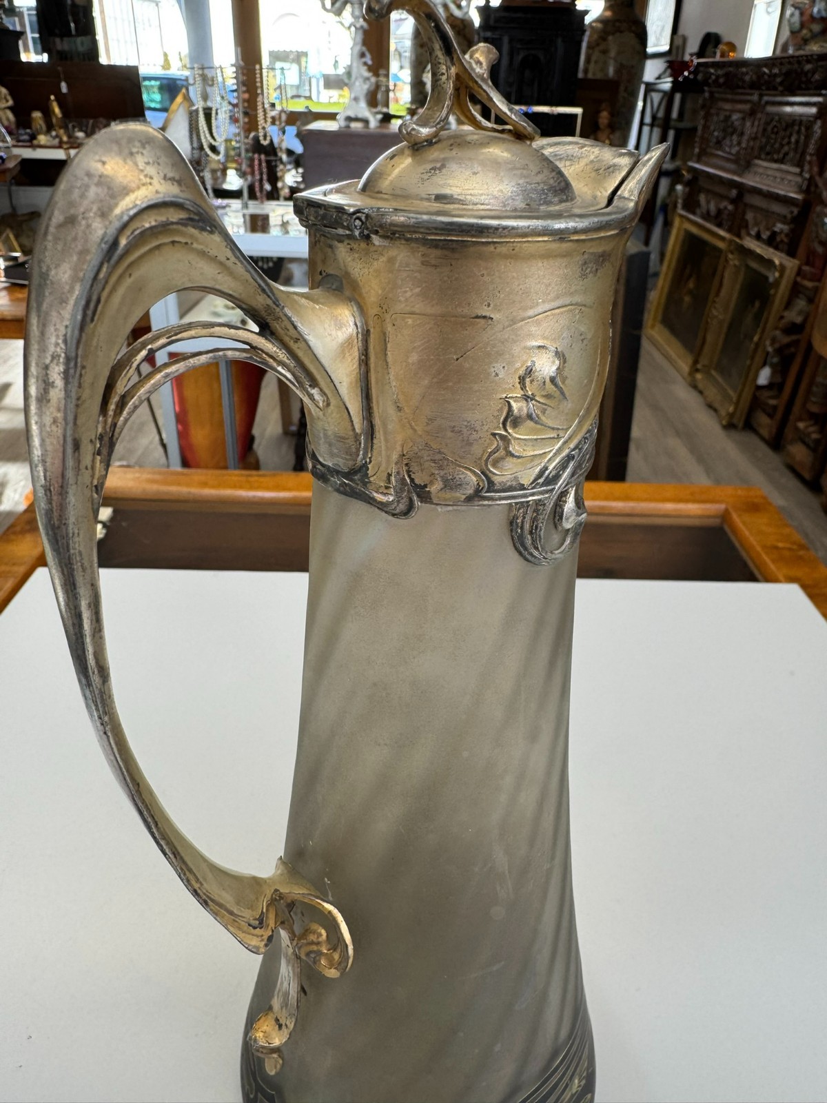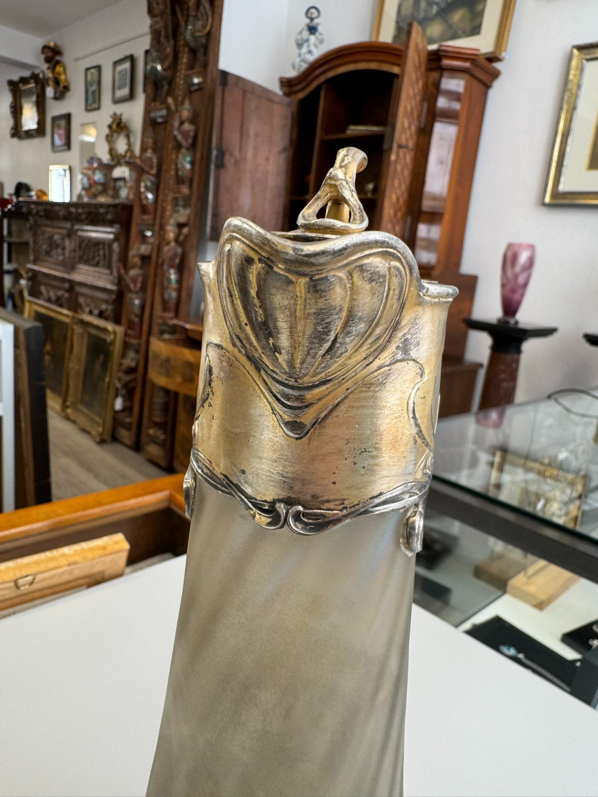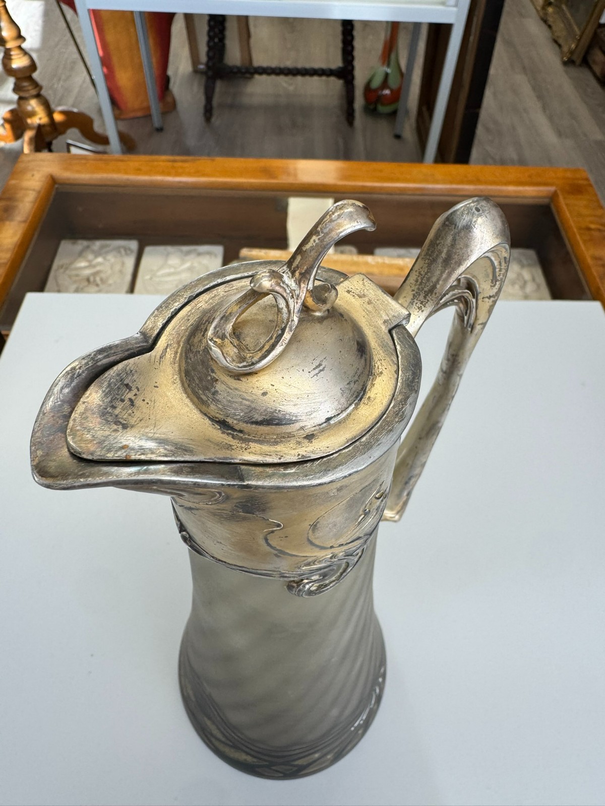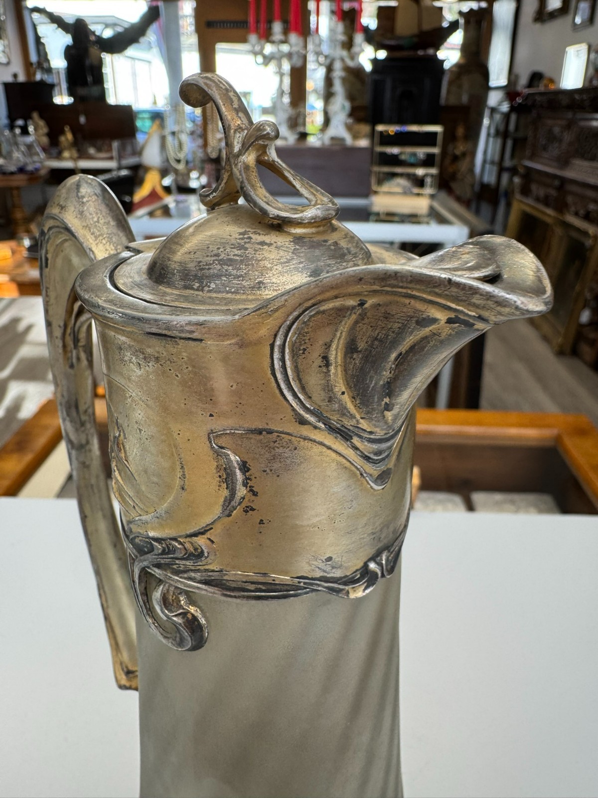 Schöne Jugendstilkaraffe mit satiniertem Effekt im Glas. Die Metallmontur ehemals versilbert / vergoldet, die Beschichtung weitestgehend abgenutzt, am Glas kleinere Kratzer. Höhe/ Durchmesser: 31x12cm.
