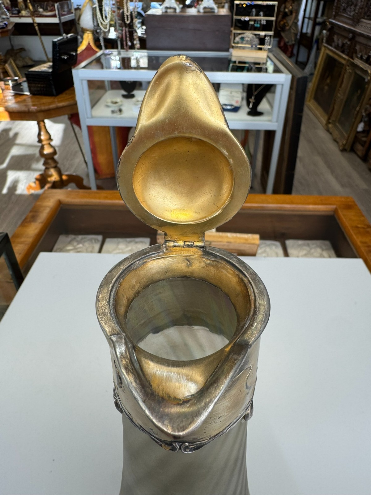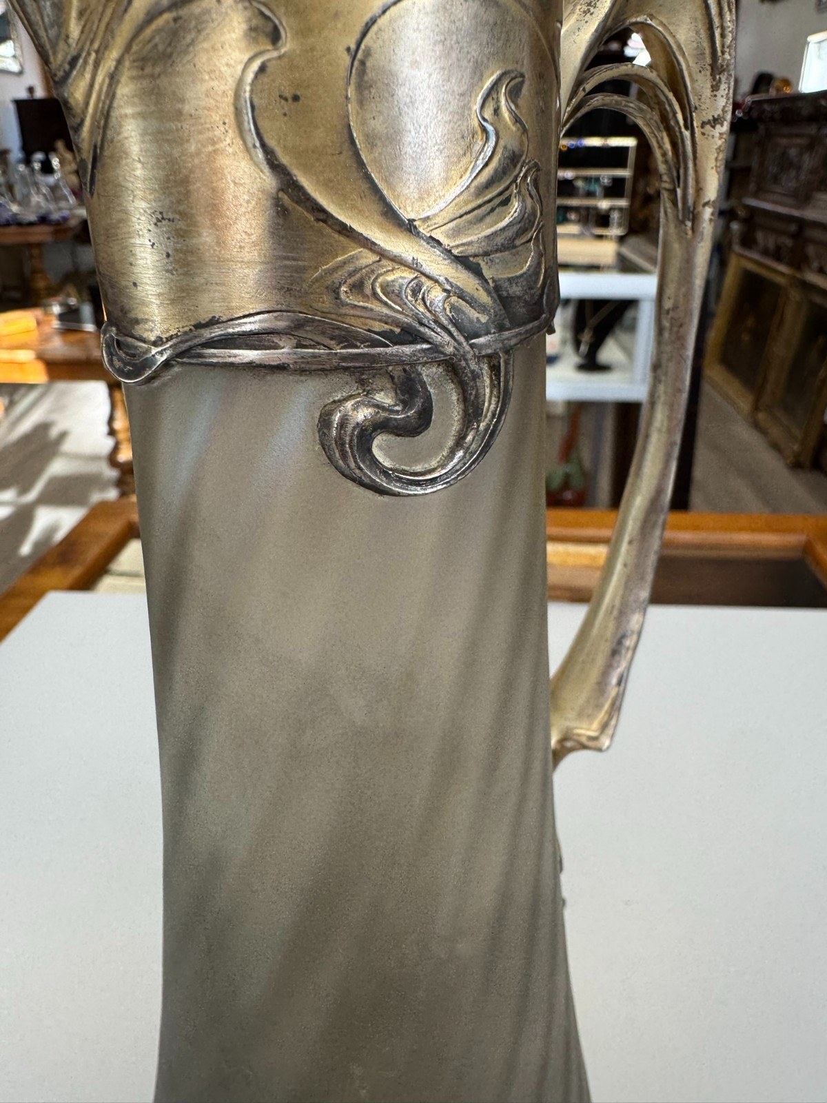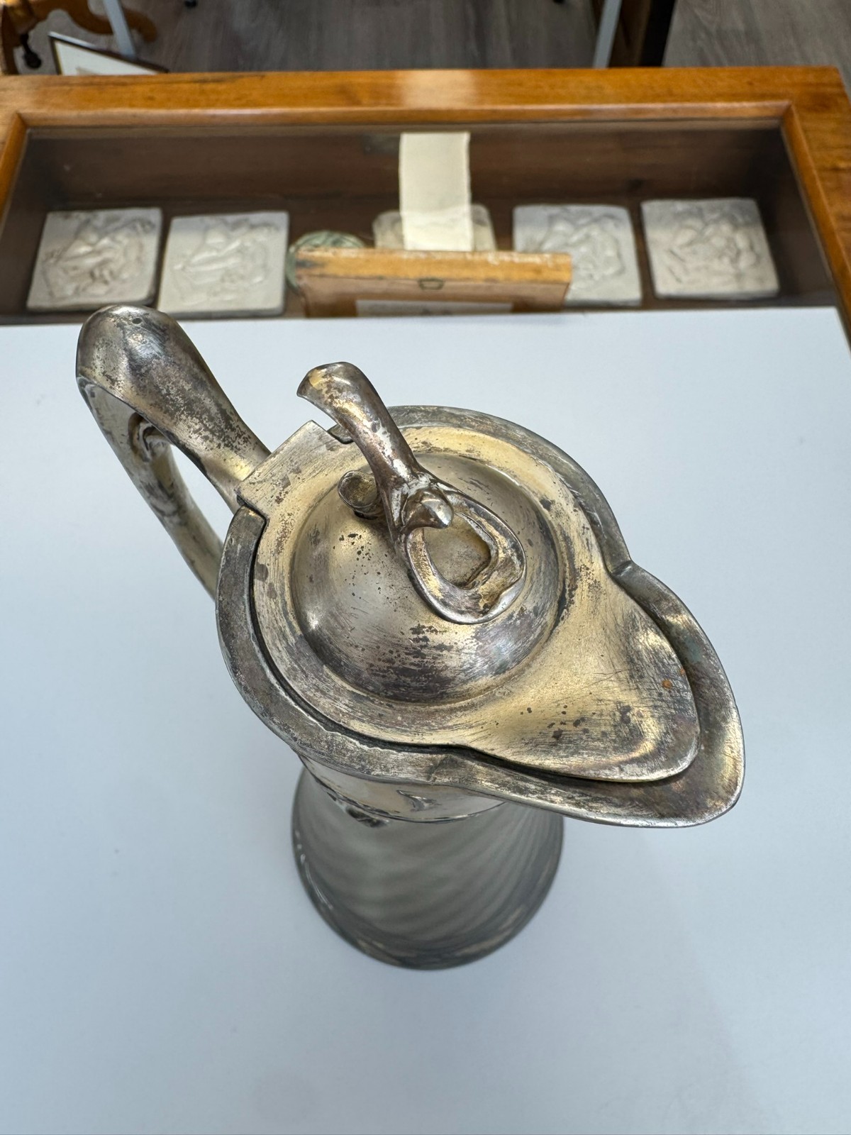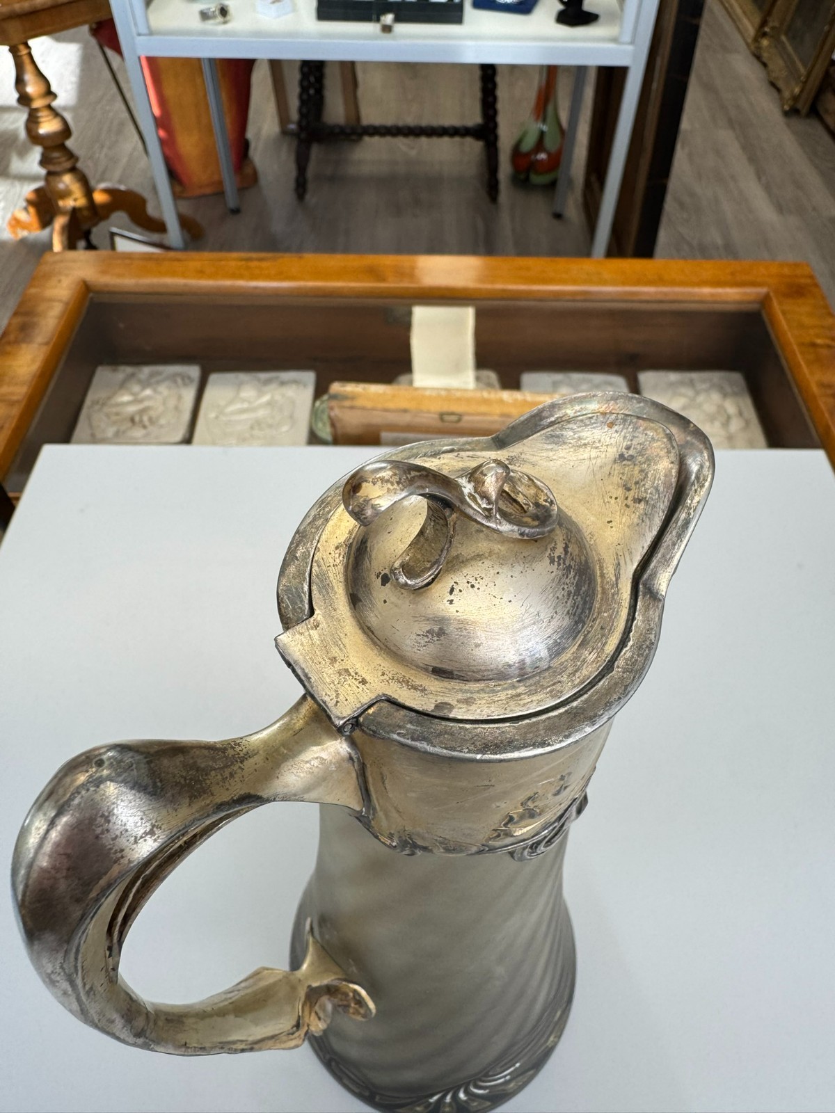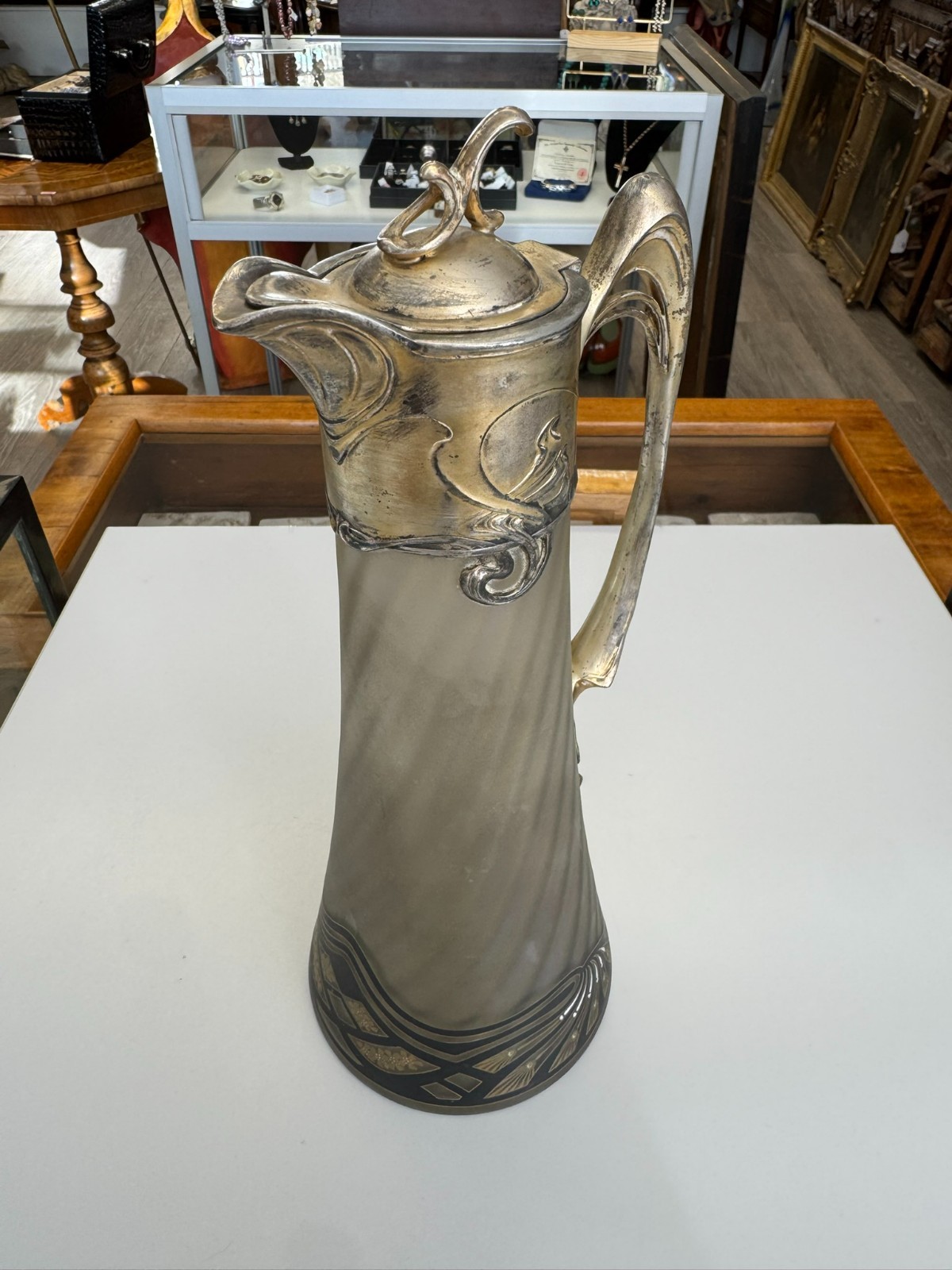 Schöne Jugendstilkaraffe mit satiniertem Effekt im Glas. Die Metallmontur ehemals versilbert / vergoldet, die Beschichtung weitestgehend abgenutzt, am Glas kleinere Kratzer. Höhe/ Durchmesser: 31x12cm.