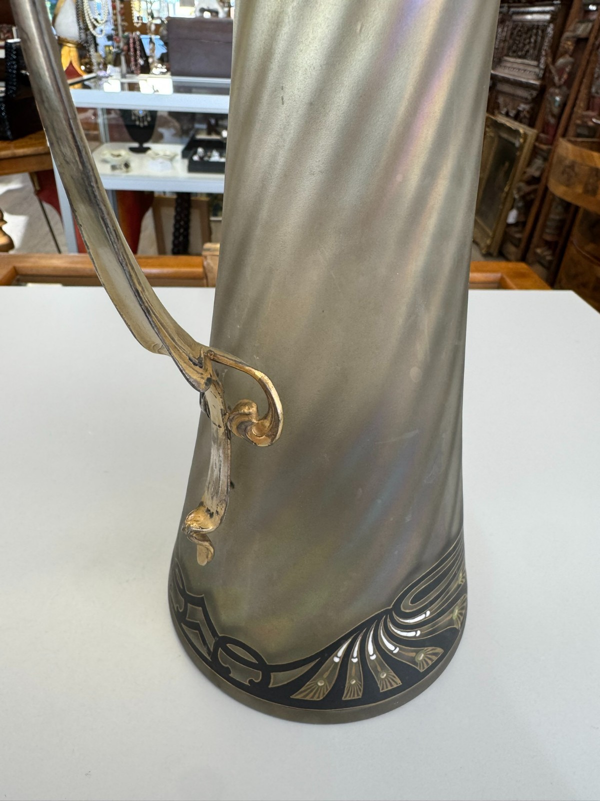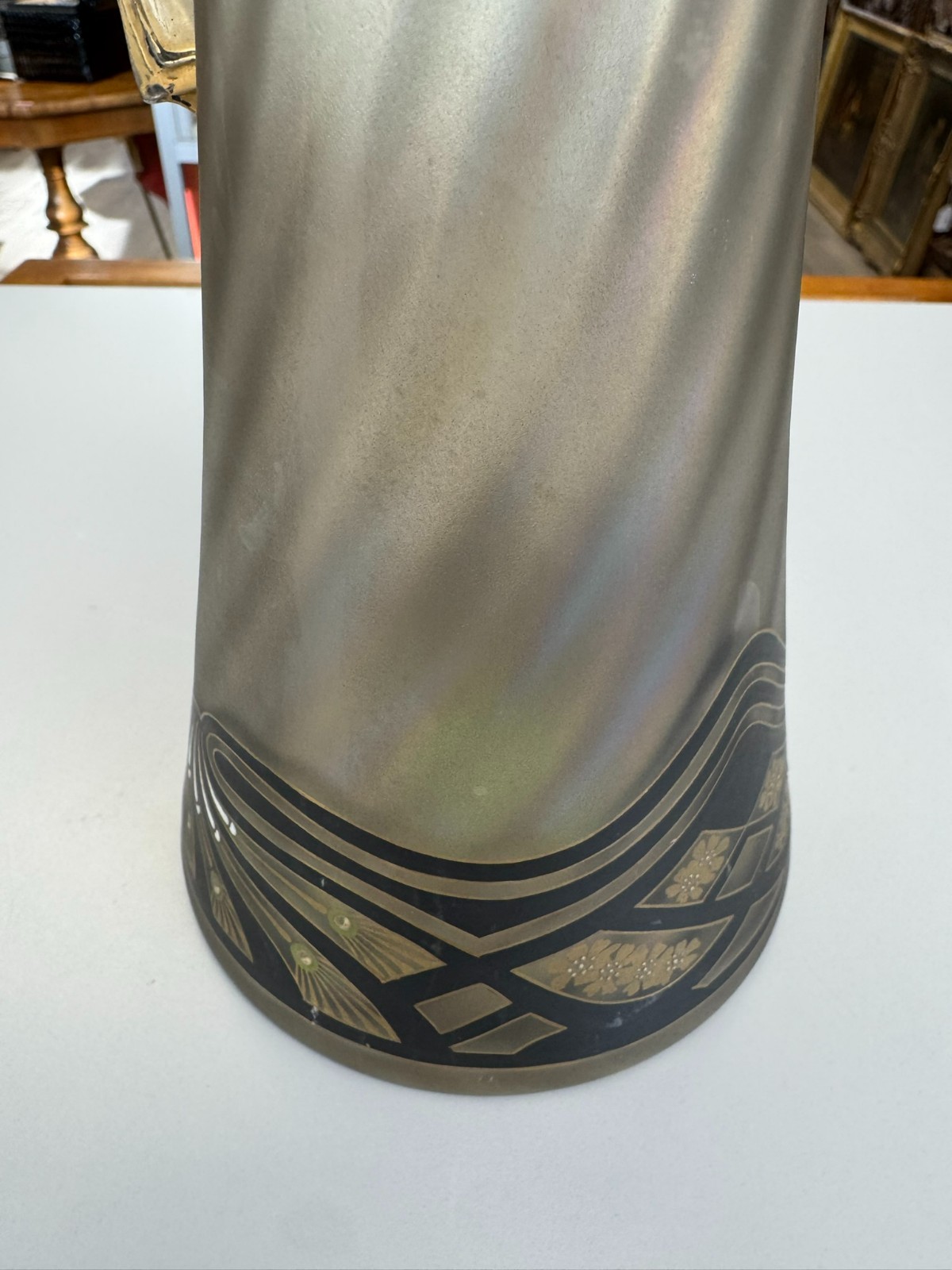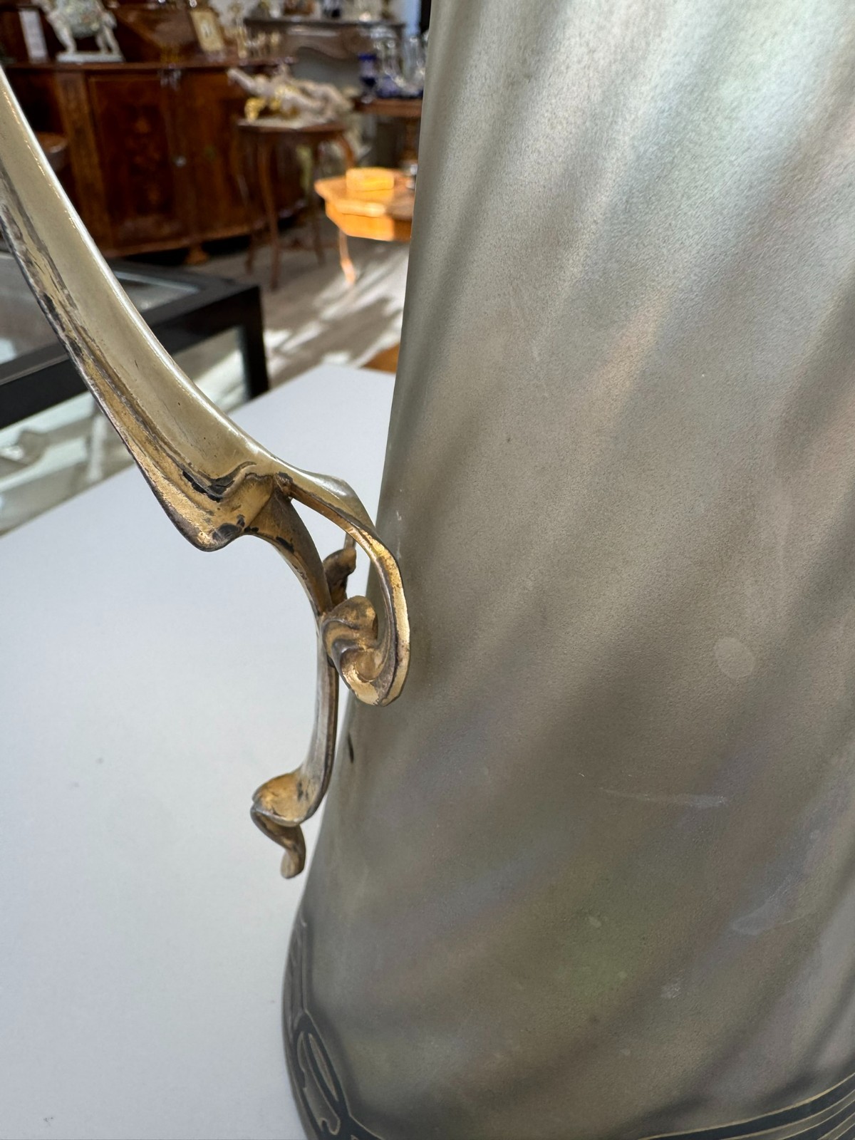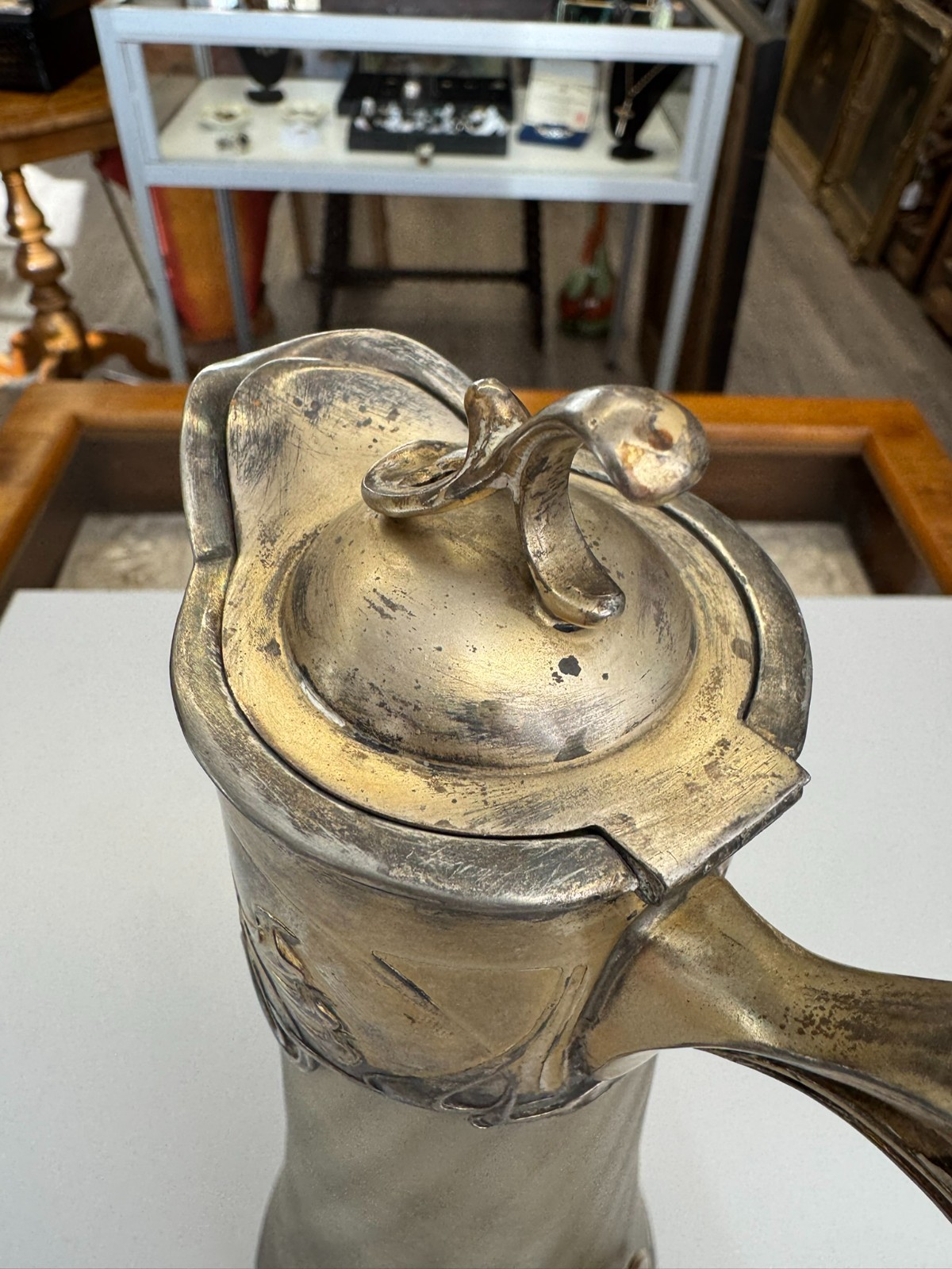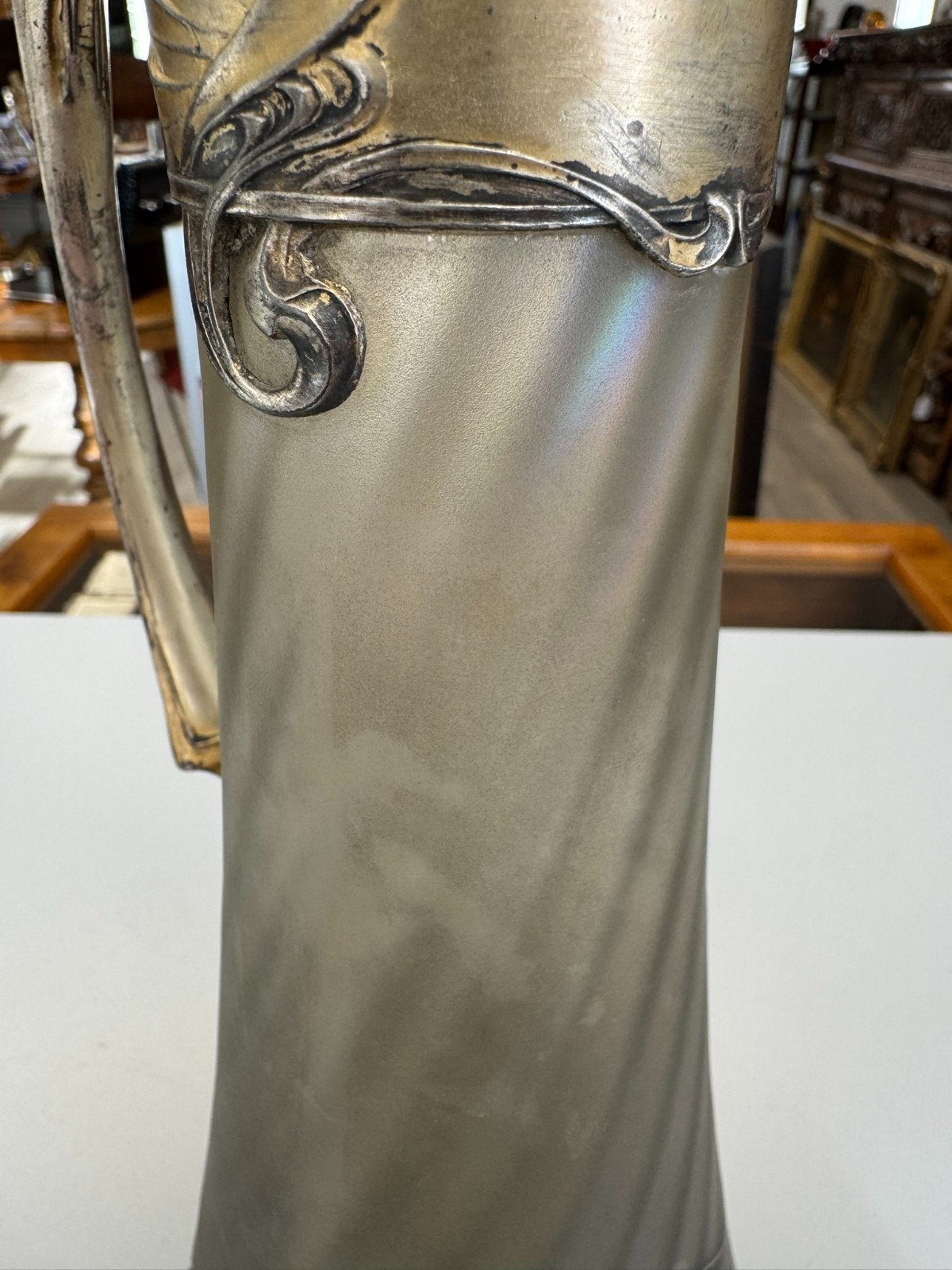 Schöne Jugendstilkaraffe mit satiniertem Effekt im Glas. Die Metallmontur ehemals versilbert / vergoldet, die Beschichtung weitestgehend abgenutzt, am Glas kleinere Kratzer. Höhe/ Durchmesser: 31x12cm.