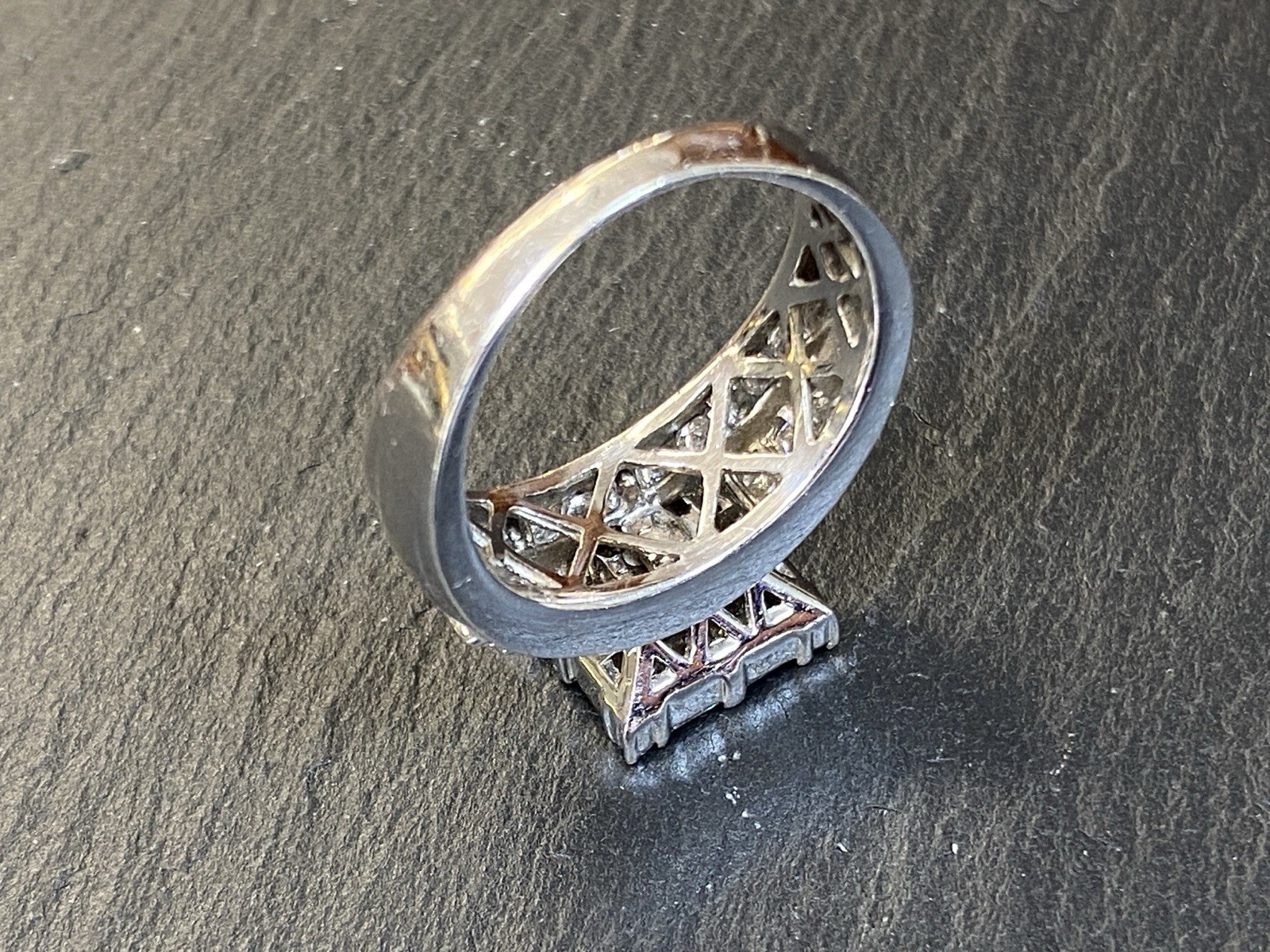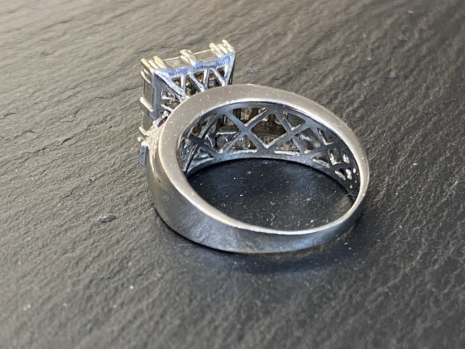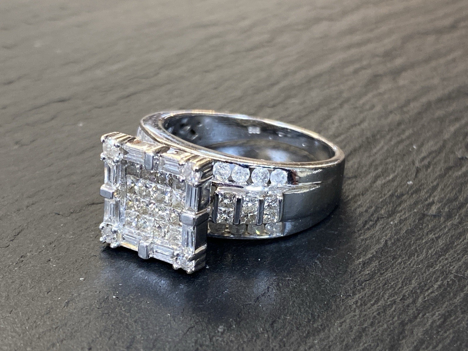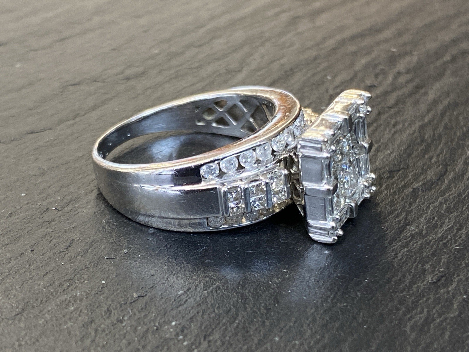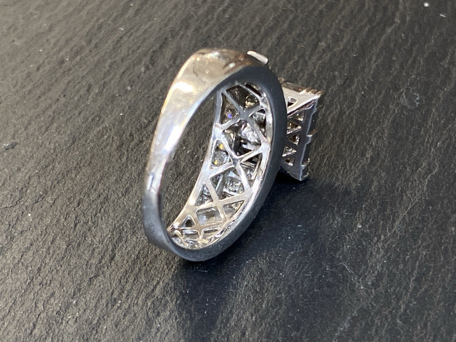 Herausragender Ring aus Weissgold, punziert 585. Diamantbesatz von ca. 1,94 ct. in SI/P1, Farbe F. Gesamtgewicht 9,29g. Kopfbreite 12x12mm, Kopfhöhe 12mm. Schienenbreite oben/unten 9/2,5mm. Alle Angaben soweit Sie in der Fassung messbar sind. Die Lieferung erfolgt mit personalisierter Rechnung, ohne Zertifikat.