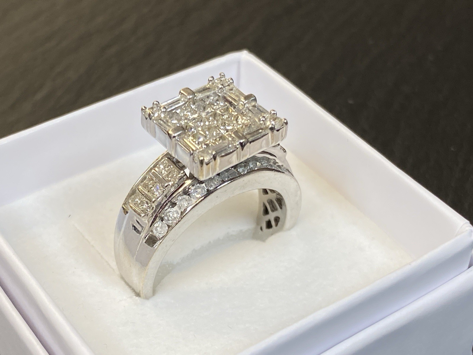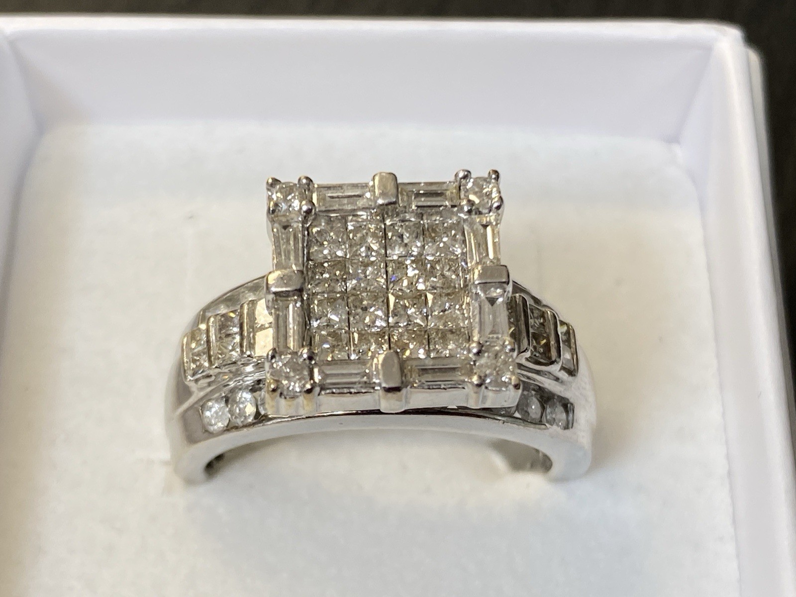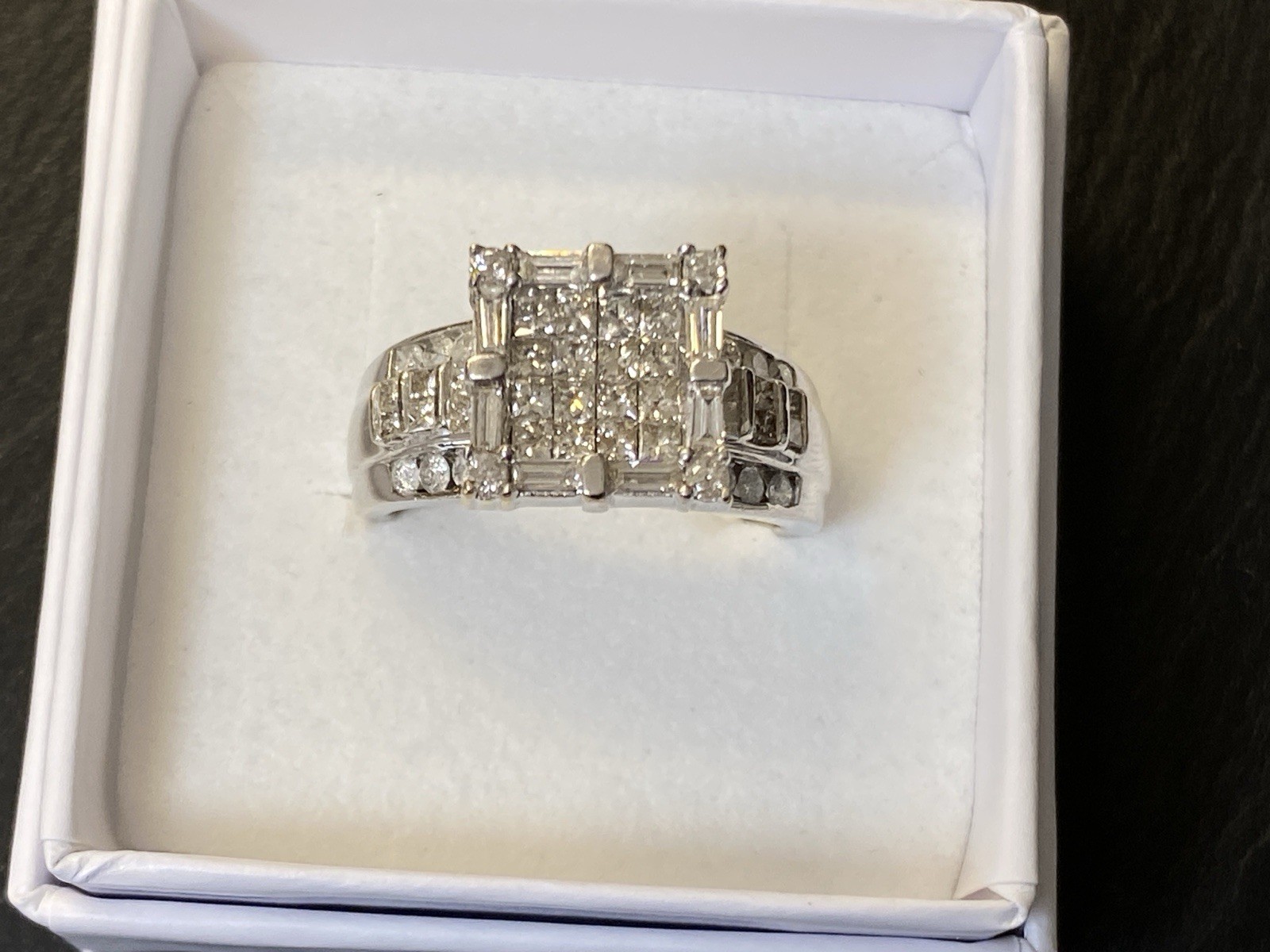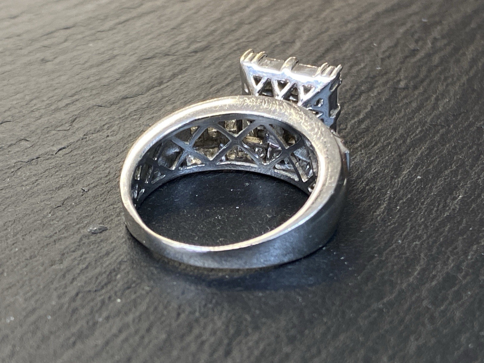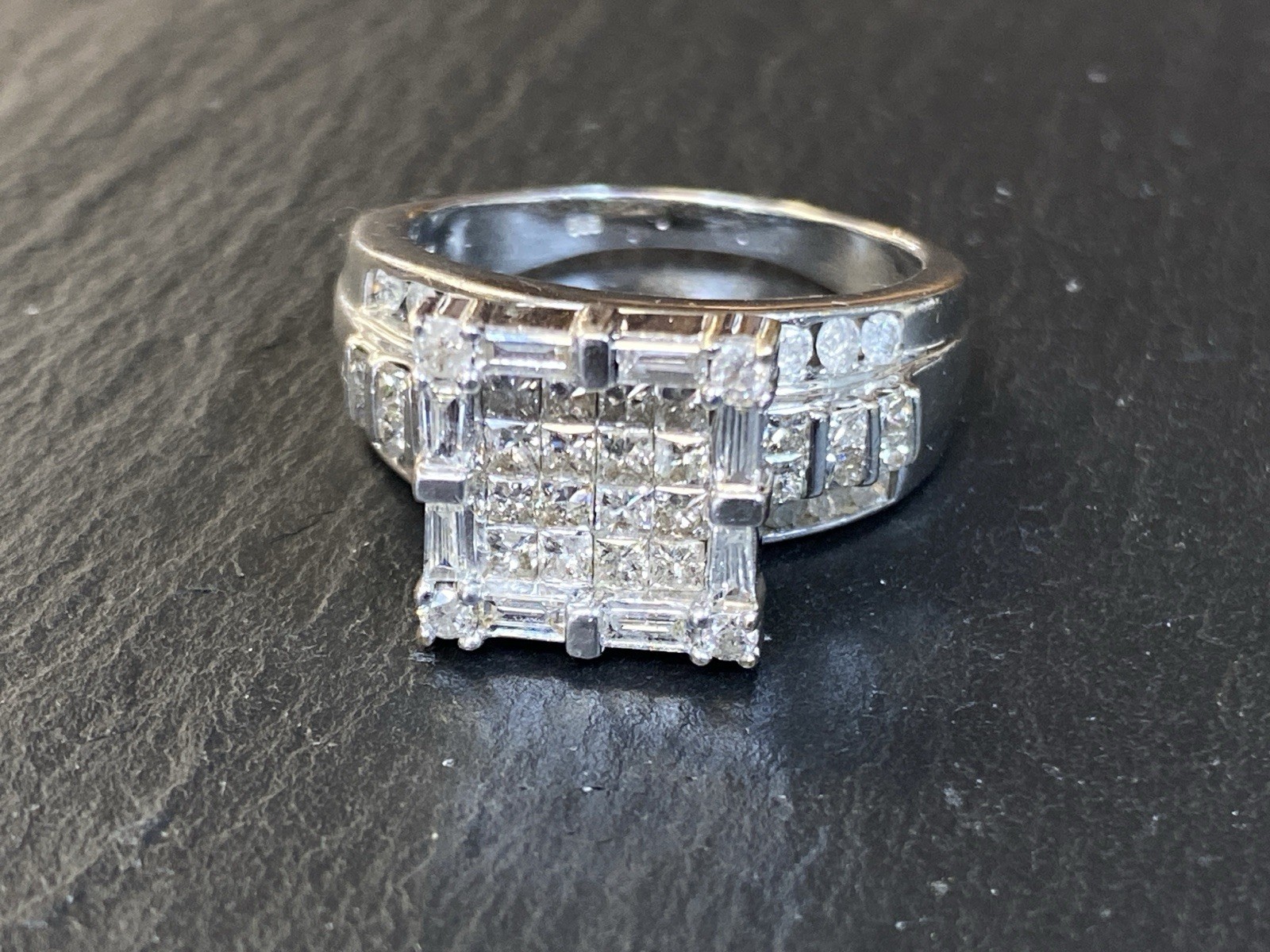 Herausragender Ring aus Weissgold, punziert 585. Diamantbesatz von ca. 1,94 ct. in SI/P1, Farbe F. Gesamtgewicht 9,29g. Kopfbreite 12x12mm, Kopfhöhe 12mm. Schienenbreite oben/unten 9/2,5mm. Alle Angaben soweit Sie in der Fassung messbar sind. Die Lieferung erfolgt mit personalisierter Rechnung, ohne Zertifikat.