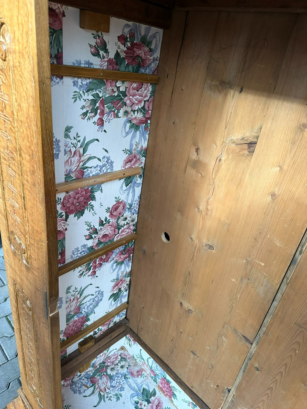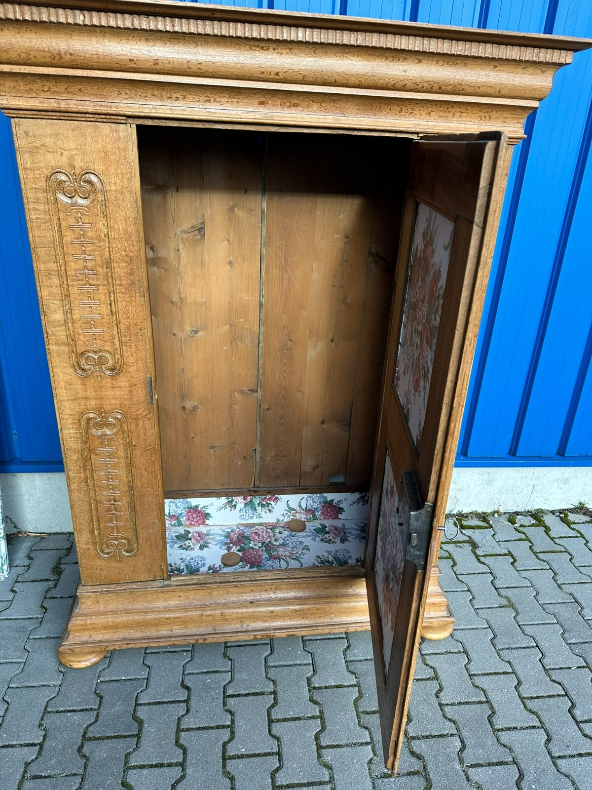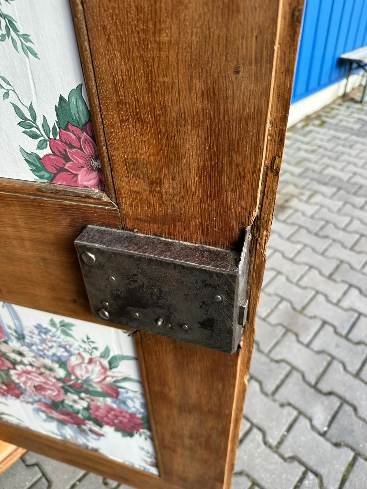 Sehr schöner herrschaftlicher Barockschrank um 1740, aus massiver Eiche, an den Türen und an den seiten Intarsien, an der Front mit nachgeahnten Schwertern. Ein Schlüssel vorhanden, Schloss funktionsfähig. Der Innenraum zum Teil beklebt, Innenleben nicht original, vier Ablagebretter vorhanden, ebenfalls ist eine schöne Blende für die Rückwand vorhanden. Linke Seitenwand zur Türaufnahme ergänzt. Leisten zum Teil berieben und bestoßen, im unteren Bereich teils gekittet. Füße nicht original. Ebenfalls im unteren Bereich leichter, inaktiver Wurmfraß. In der Rückwand zwei Löcher zur Kabeldurchführung. Türkante mit kleineren Bestoßungen. Der Schrank ist komplett zerlegbar. Die Oberfläche war mal zum Teil gefasst, minimale Spuren von Farbe noch erkenntlich. Abmessungen BTH: 148x68x192cm. Zum Teil gefüllte Dehnungsrisse.