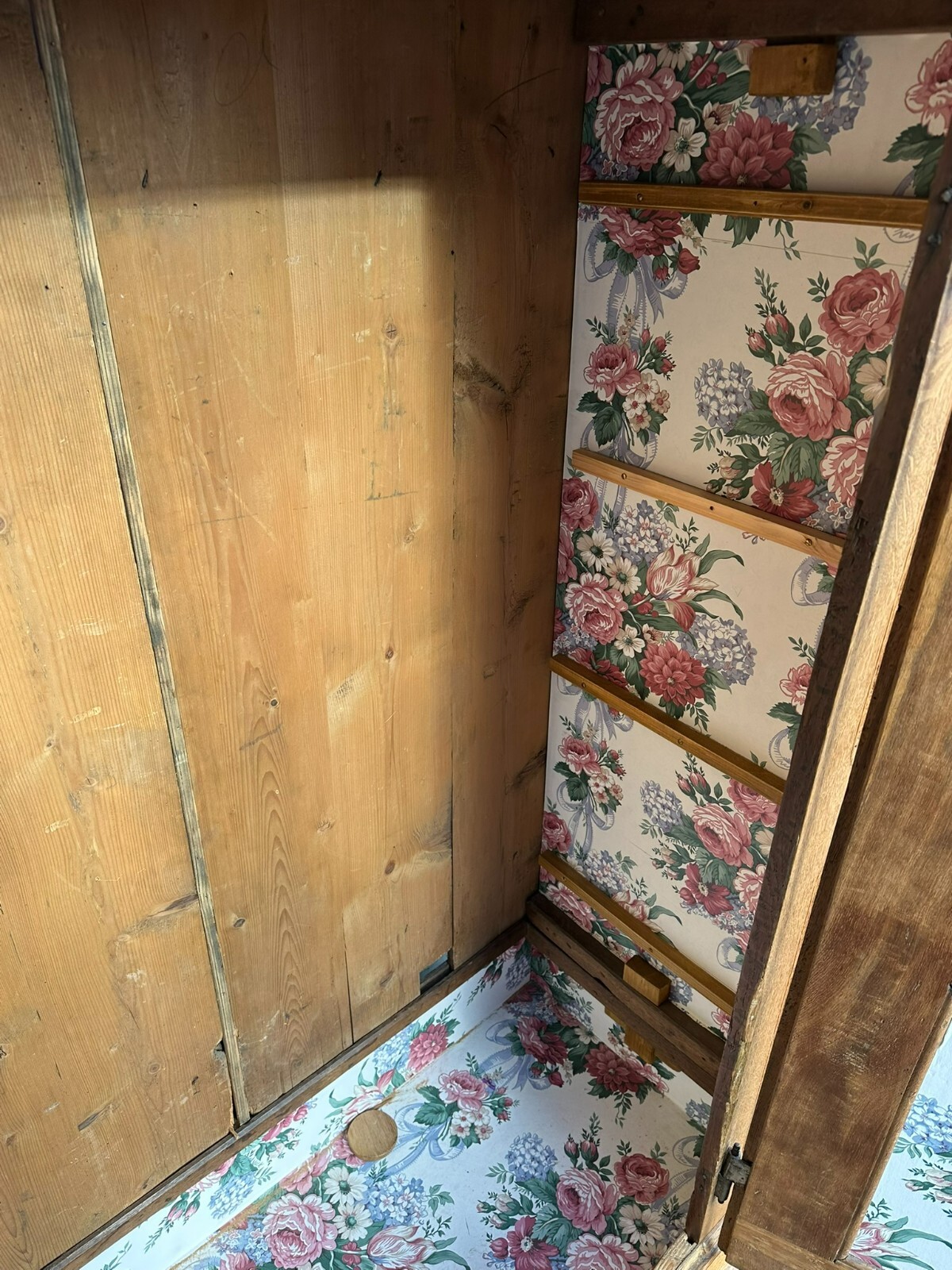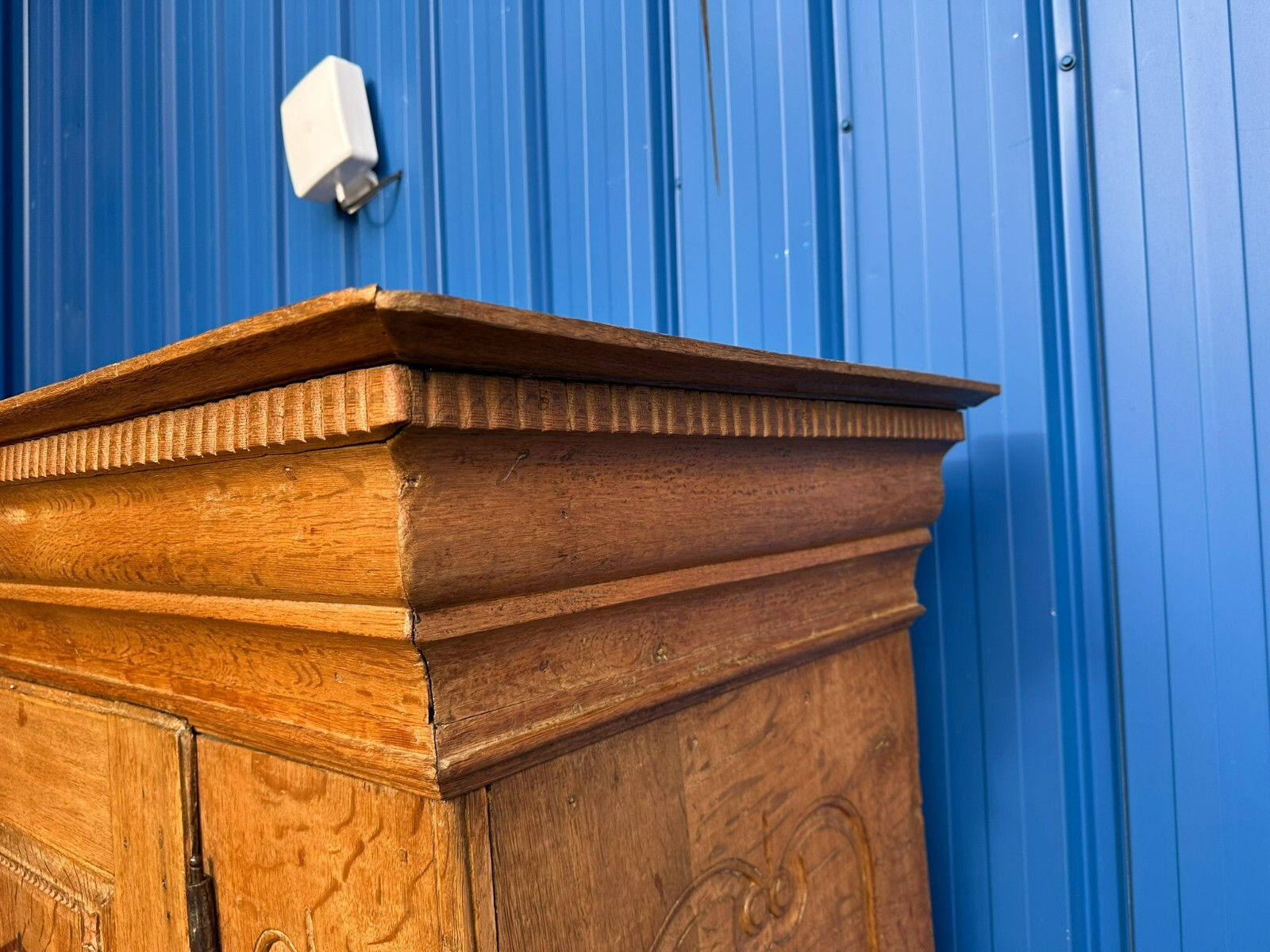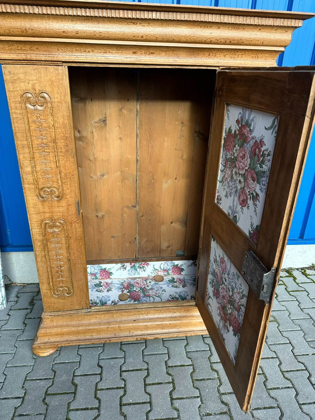 Sehr schöner herrschaftlicher Barockschrank um 1740, aus massiver Eiche, an den Türen und an den seiten Intarsien, an der Front mit nachgeahnten Schwertern. Ein Schlüssel vorhanden, Schloss funktionsfähig. Der Innenraum zum Teil beklebt, Innenleben nicht original, vier Ablagebretter vorhanden, ebenfalls ist eine schöne Blende für die Rückwand vorhanden. Linke Seitenwand zur Türaufnahme ergänzt. Leisten zum Teil berieben und bestoßen, im unteren Bereich teils gekittet. Füße nicht original. Ebenfalls im unteren Bereich leichter, inaktiver Wurmfraß. In der Rückwand zwei Löcher zur Kabeldurchführung. Türkante mit kleineren Bestoßungen. Der Schrank ist komplett zerlegbar. Die Oberfläche war mal zum Teil gefasst, minimale Spuren von Farbe noch erkenntlich. Abmessungen BTH: 148x68x192cm. Zum Teil gefüllte Dehnungsrisse.