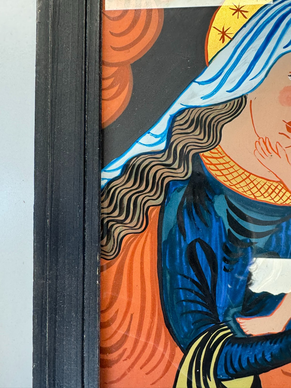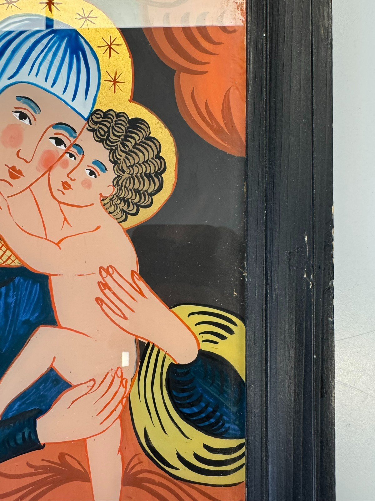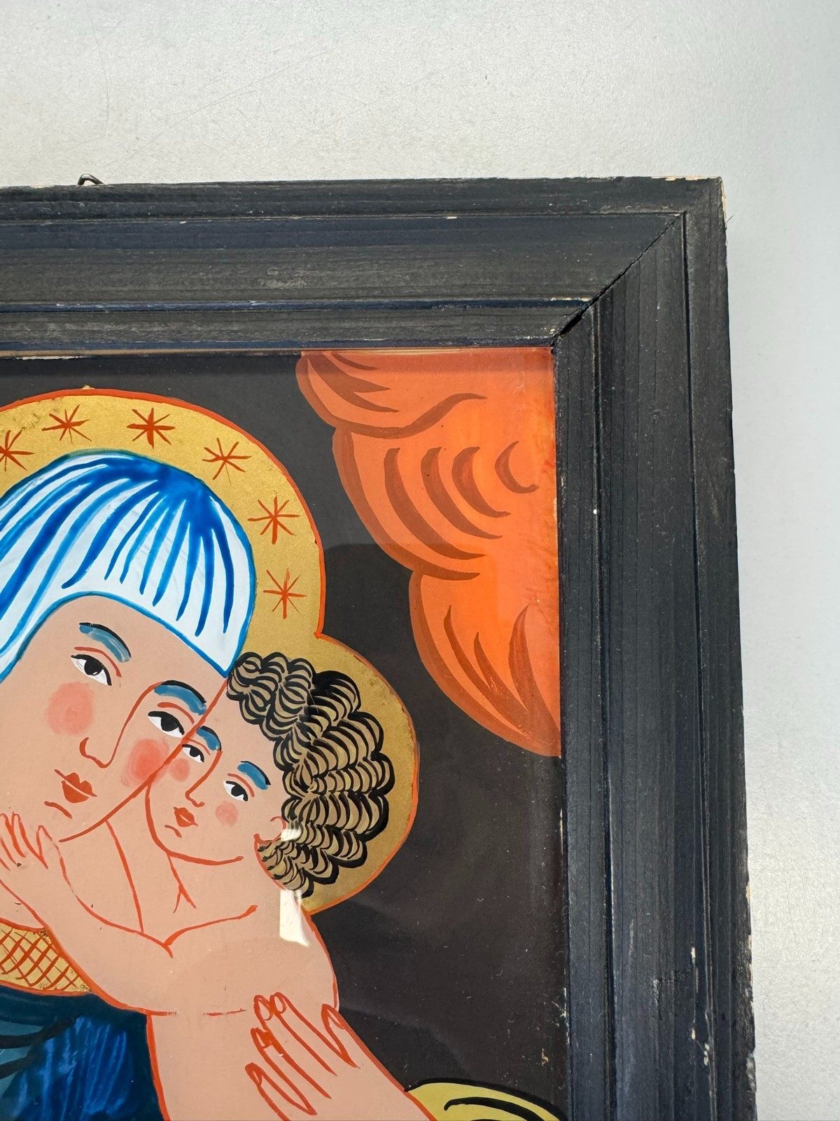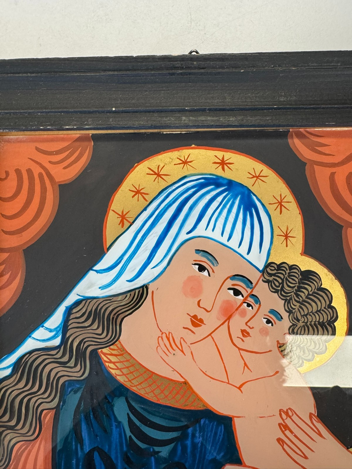 Sehr schönes Hinterglasbild m it dem Abbild der heiligen Maria mit dem Jesuskind, der Rahmen ist etwas bestoßen und an der unteren Leiste ist eine Verschmutzung auf dem Rahmen. Abmessungen gesamt: 24x30cm ohne Rahmen: 19x25cm.
