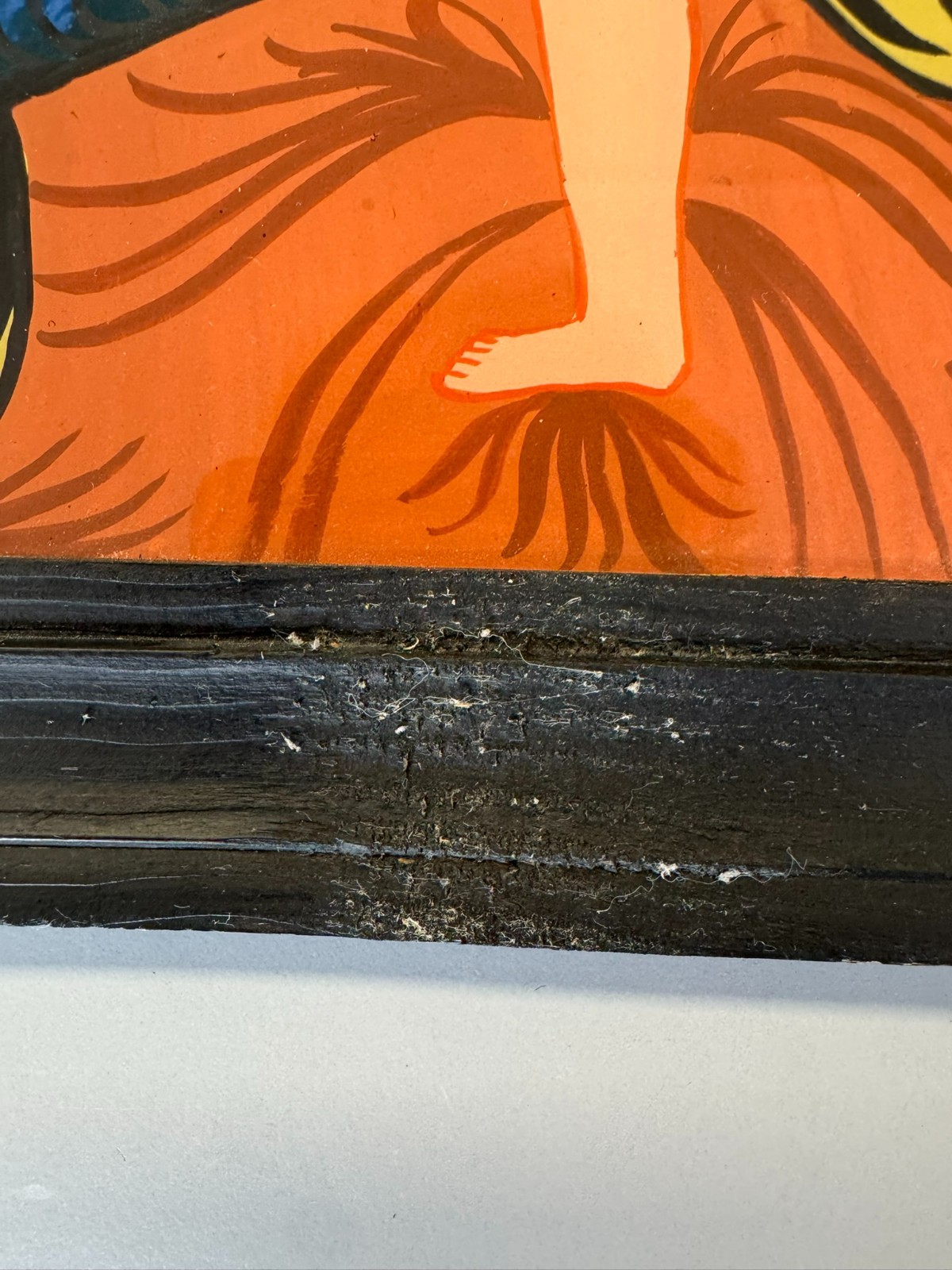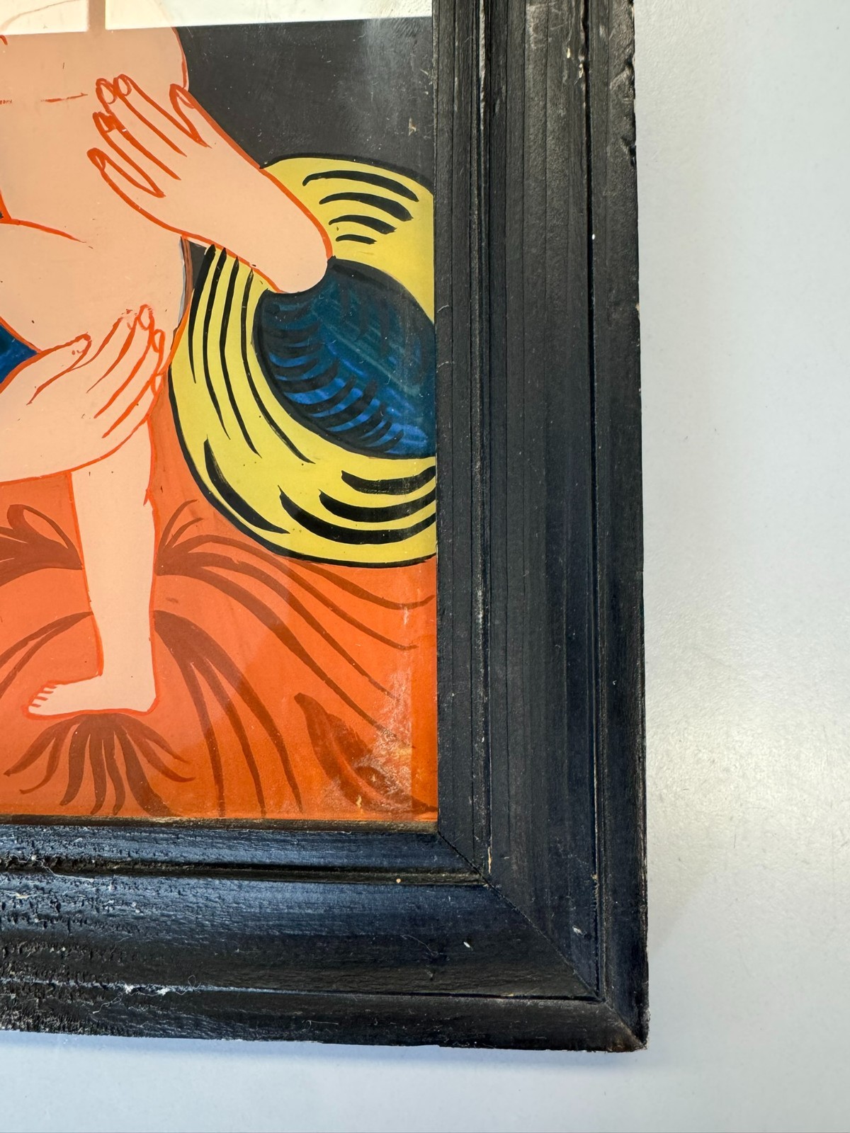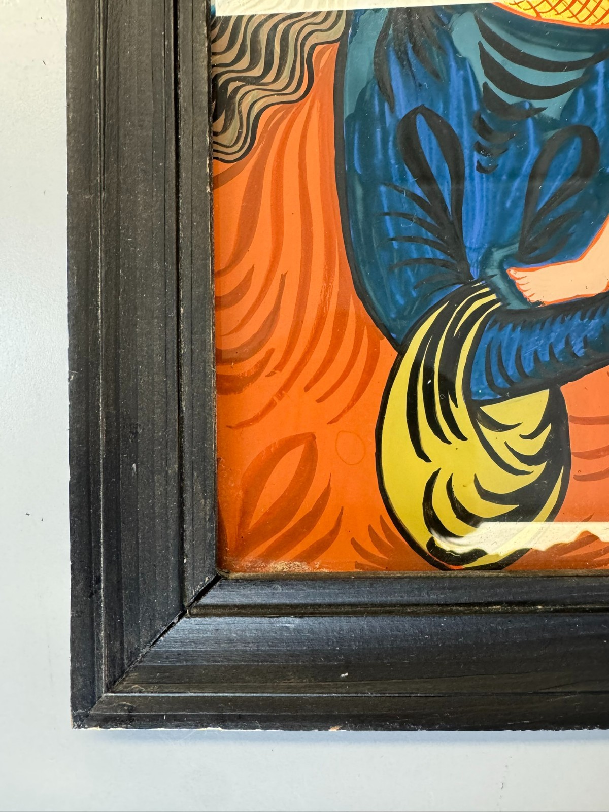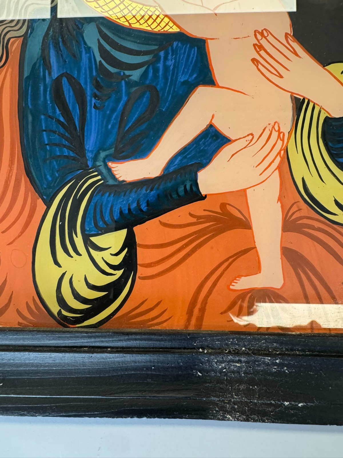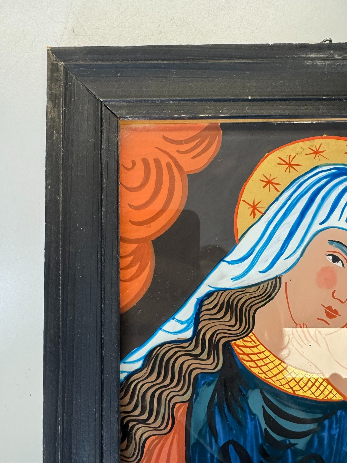 Sehr schönes Hinterglasbild m it dem Abbild der heiligen Maria mit dem Jesuskind, der Rahmen ist etwas bestoßen und an der unteren Leiste ist eine Verschmutzung auf dem Rahmen. Abmessungen gesamt: 24x30cm ohne Rahmen: 19x25cm.