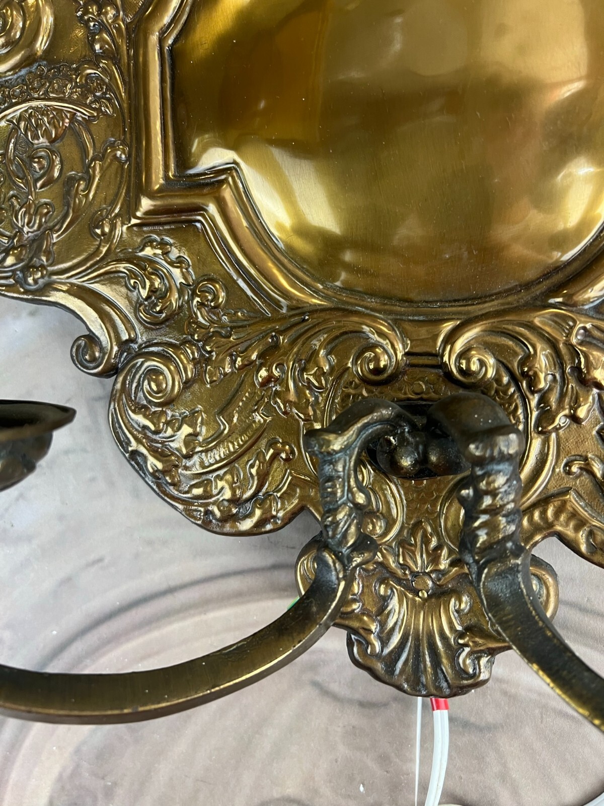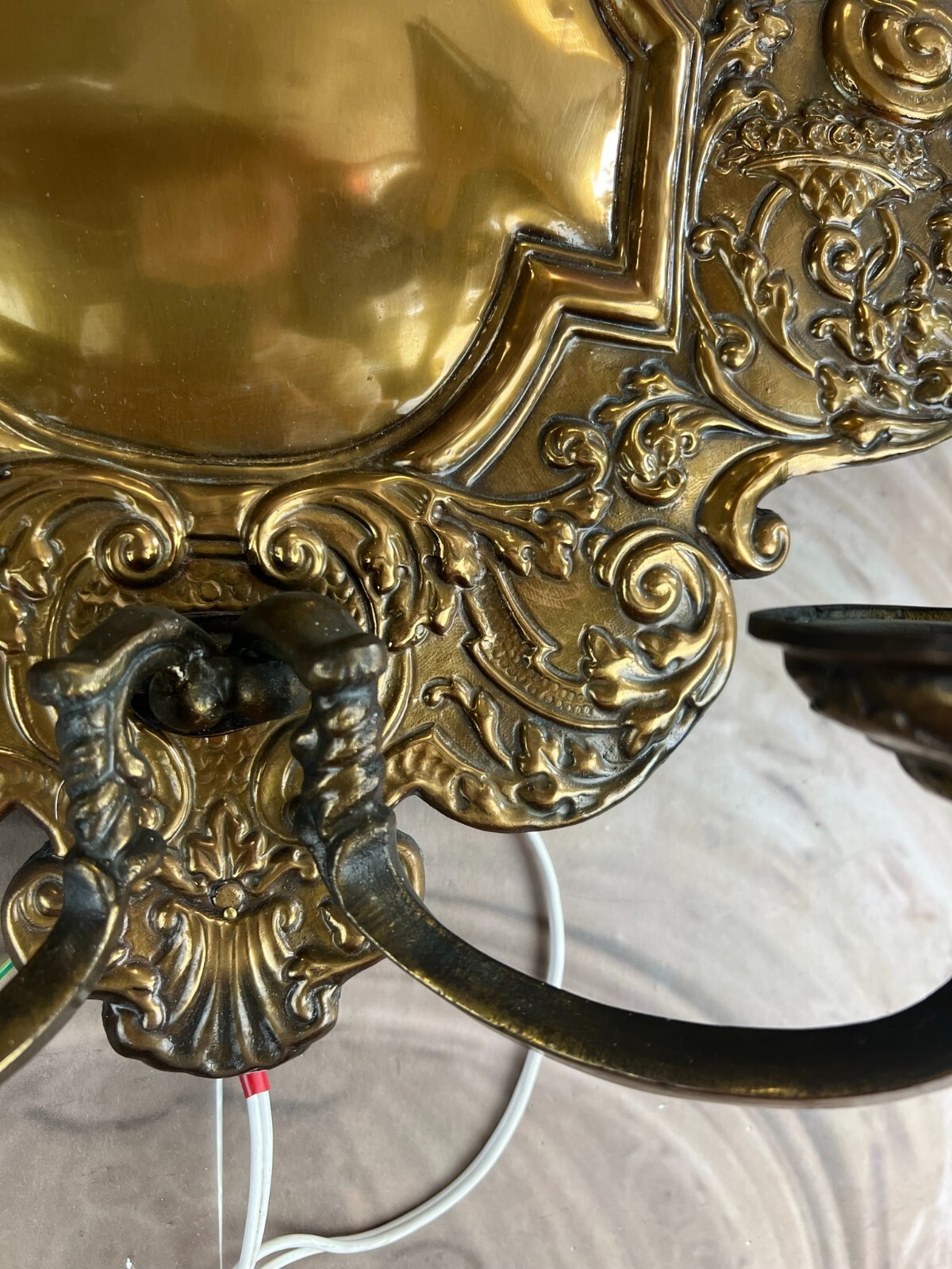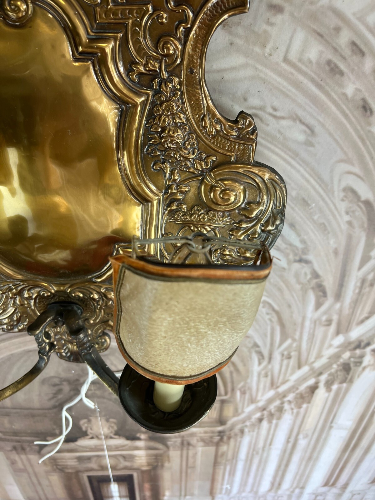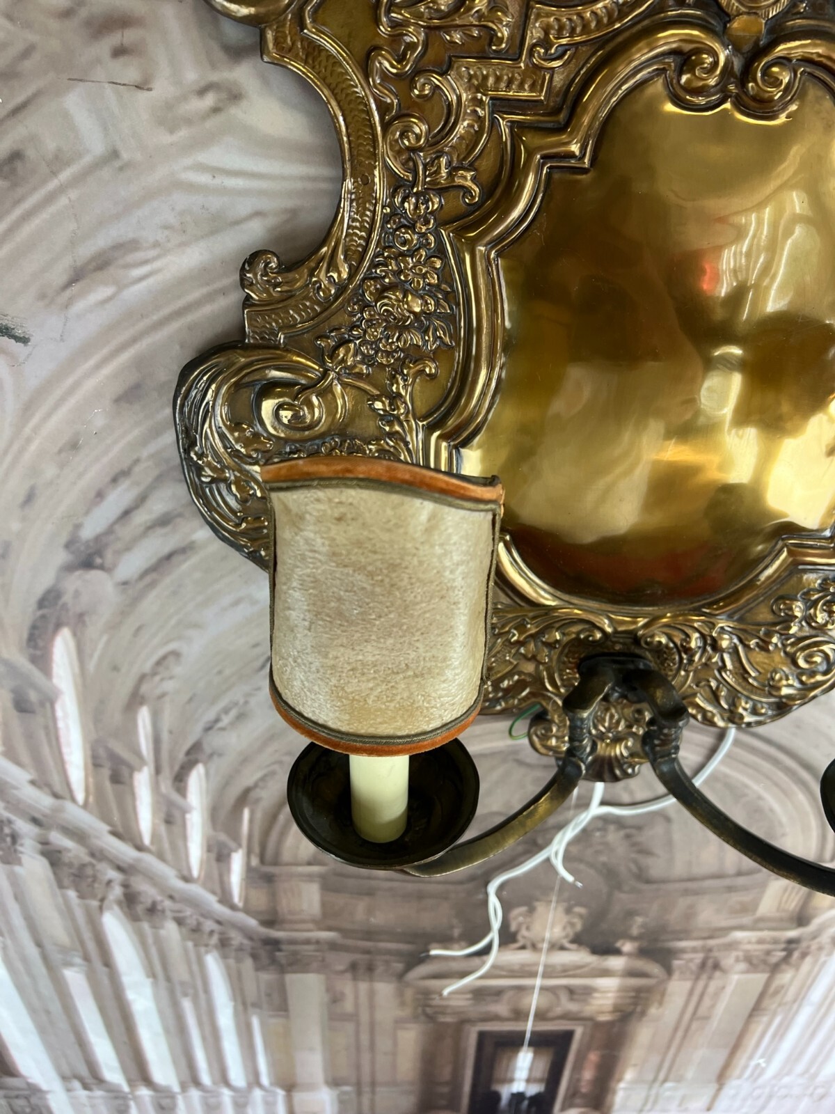 Große Wandleuchte aus Kupfer, in Historismusstil angefertigt. Die Schirmchen verbogen und fleckig, das Metall absichtlich dellig verarbeitet um antike Patina zu erzeugen, Funktion ungeprüft. Im großen Medaillon leichte Kratzer. Abmessungen BTH: 45x17x6,5cm.