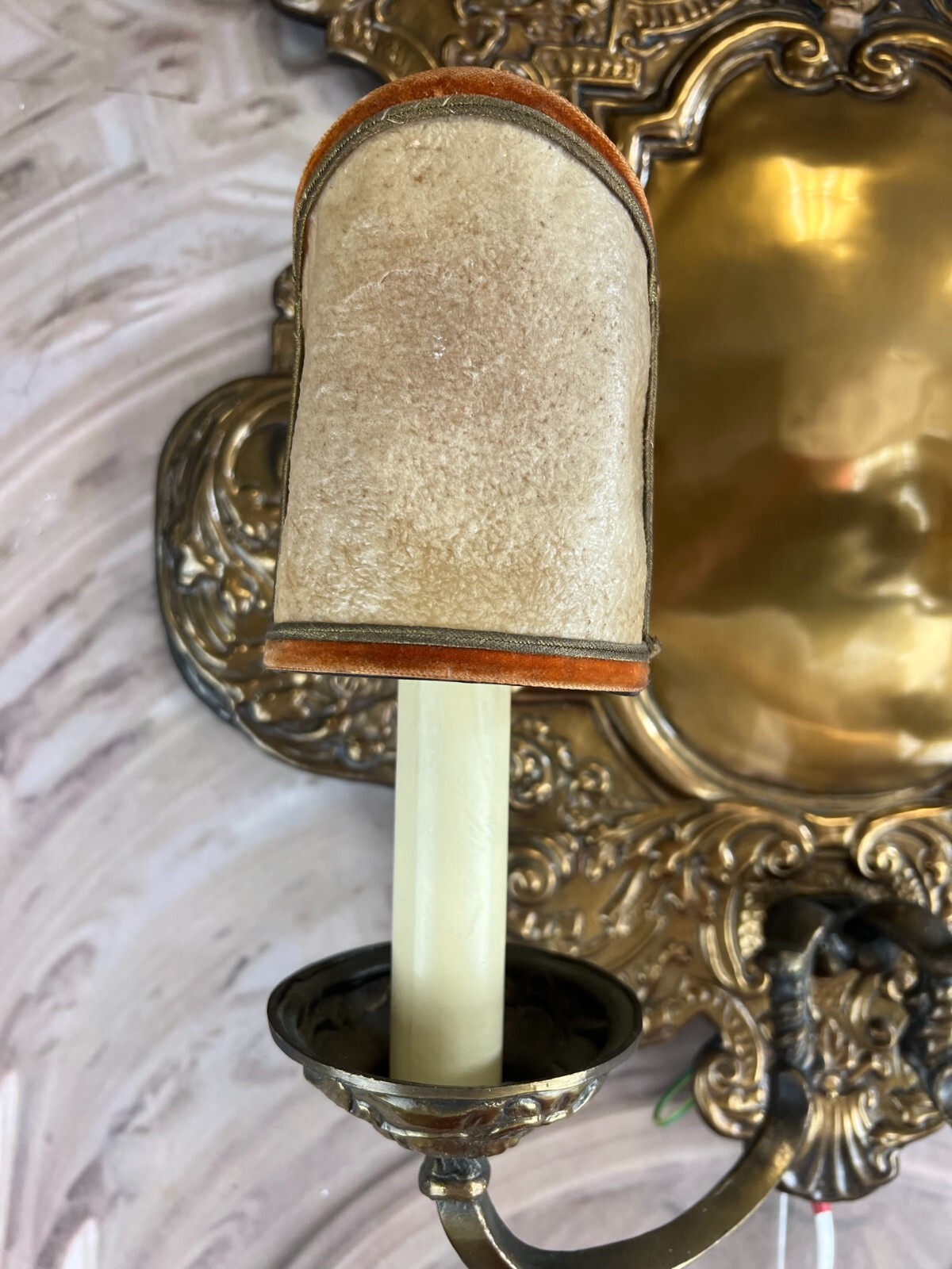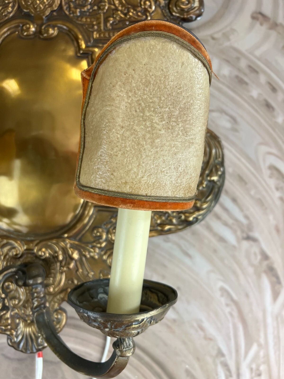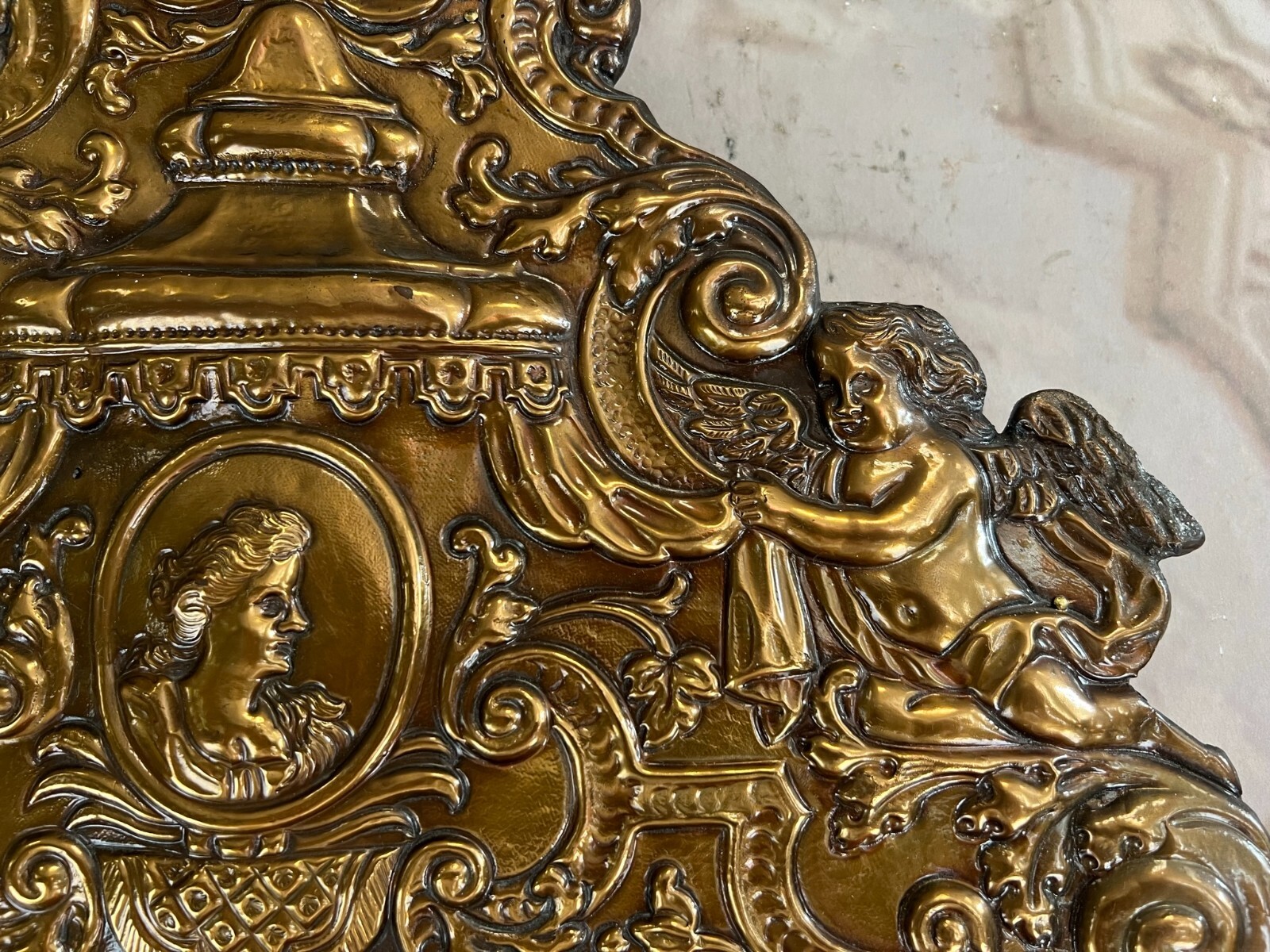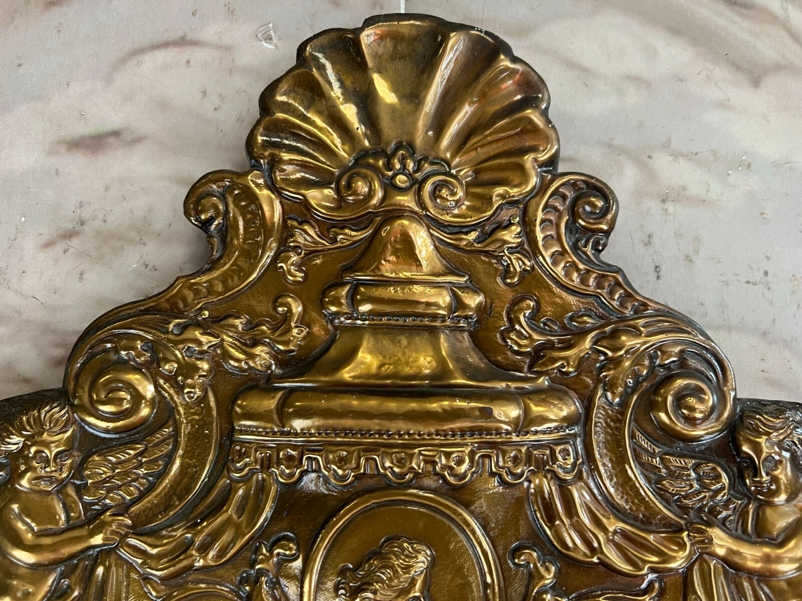 Große Wandleuchte aus Kupfer, in Historismusstil angefertigt. Die Schirmchen verbogen und fleckig, das Metall absichtlich dellig verarbeitet um antike Patina zu erzeugen, Funktion ungeprüft. Im großen Medaillon leichte Kratzer. Abmessungen BTH: 45x17x6,5cm.