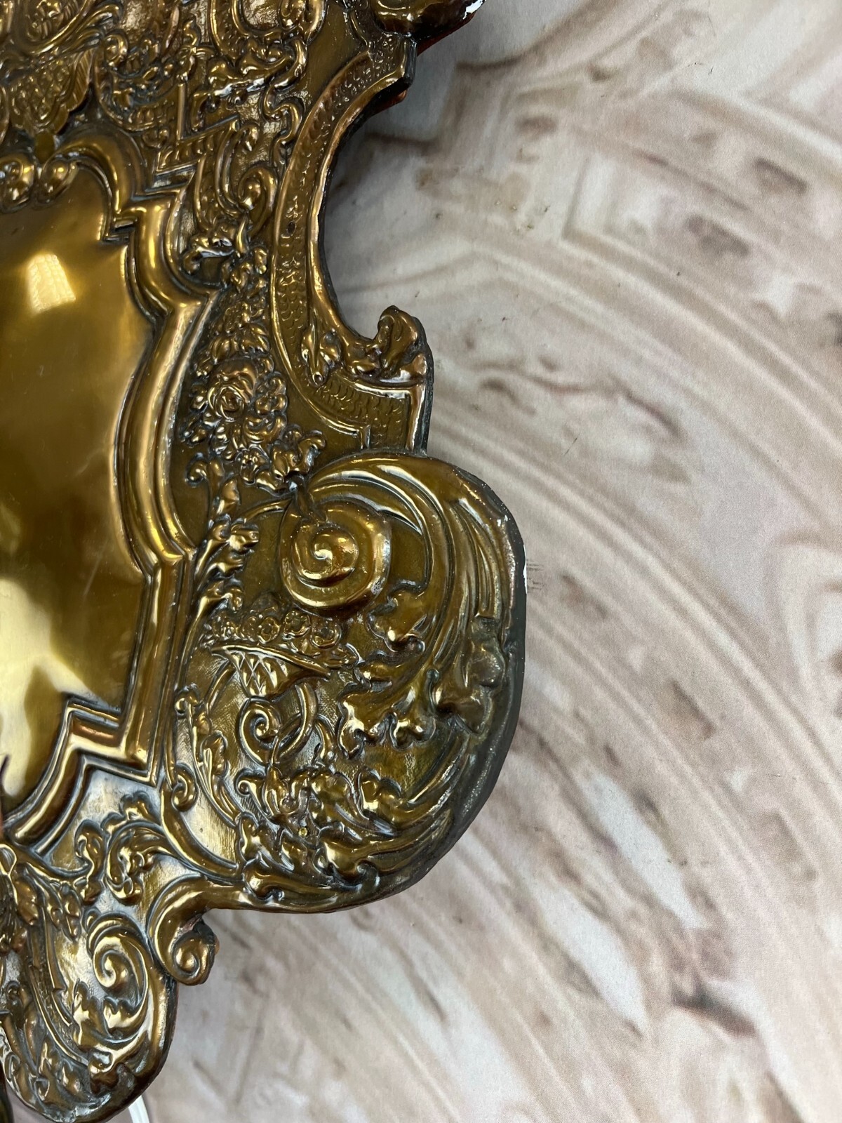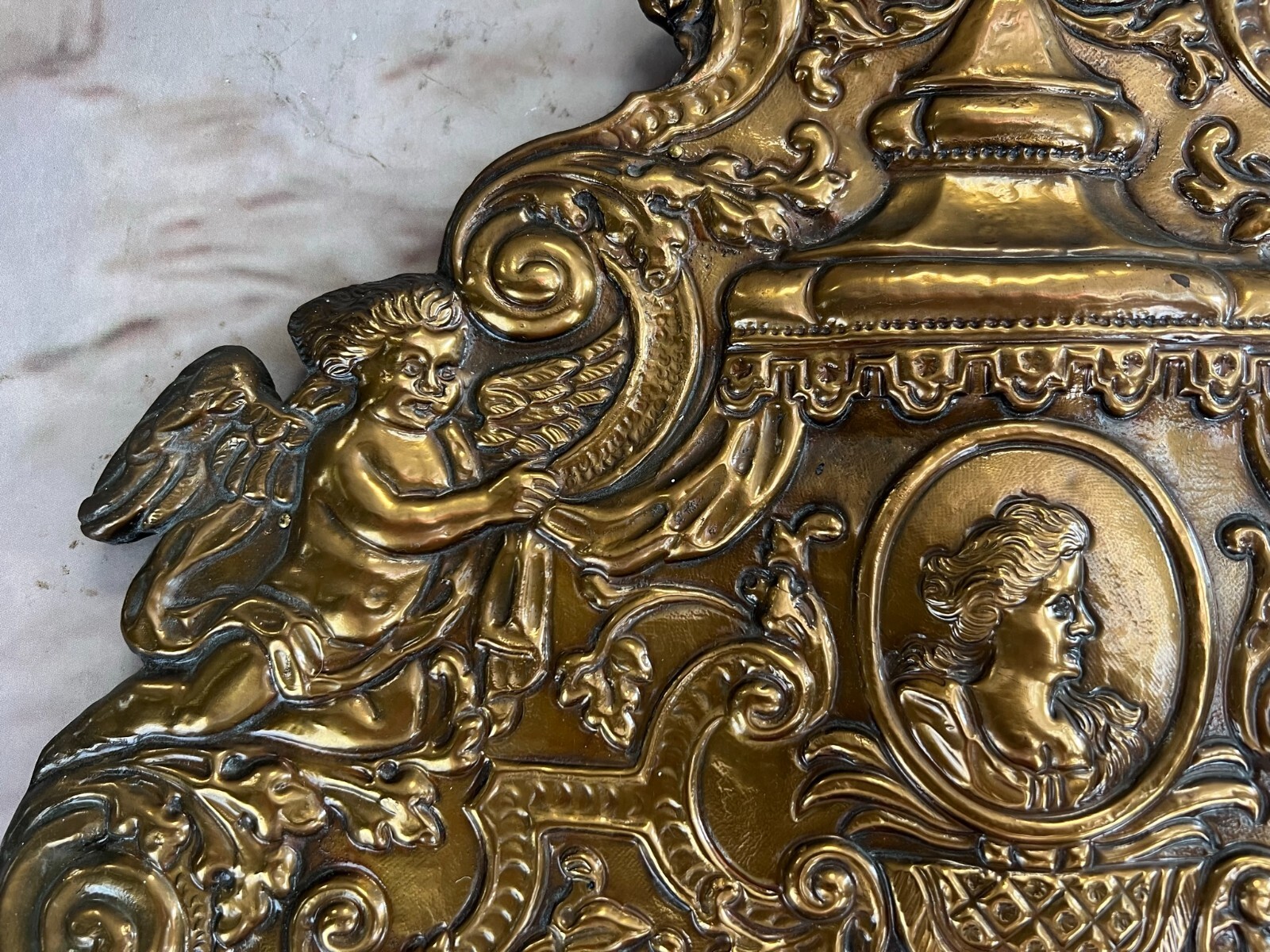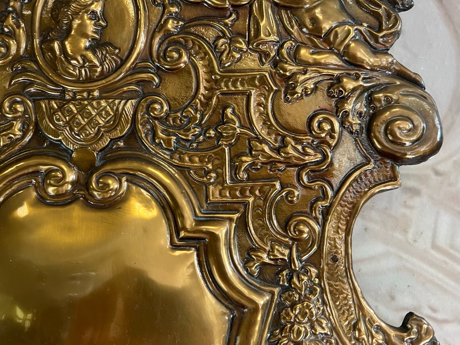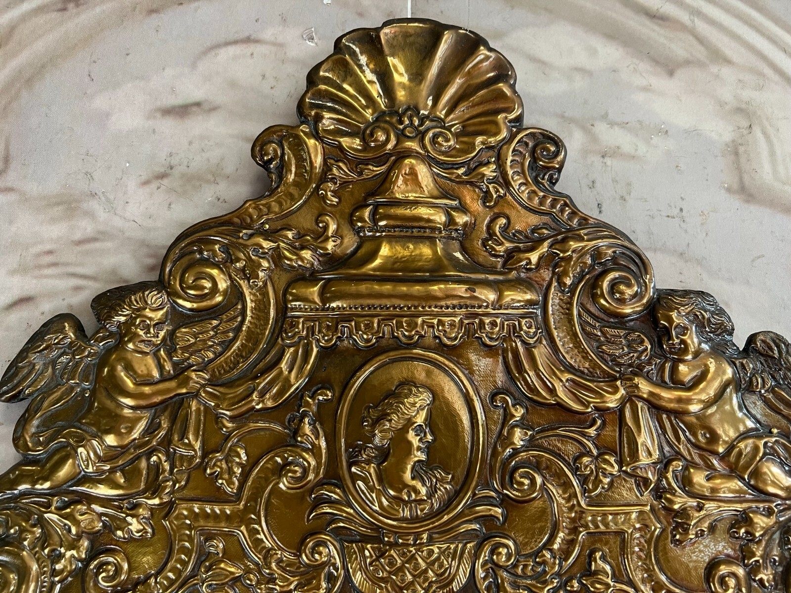 Große Wandleuchte aus Kupfer, in Historismusstil angefertigt. Die Schirmchen verbogen und fleckig, das Metall absichtlich dellig verarbeitet um antike Patina zu erzeugen, Funktion ungeprüft. Im großen Medaillon leichte Kratzer. Abmessungen BTH: 45x17x6,5cm.
