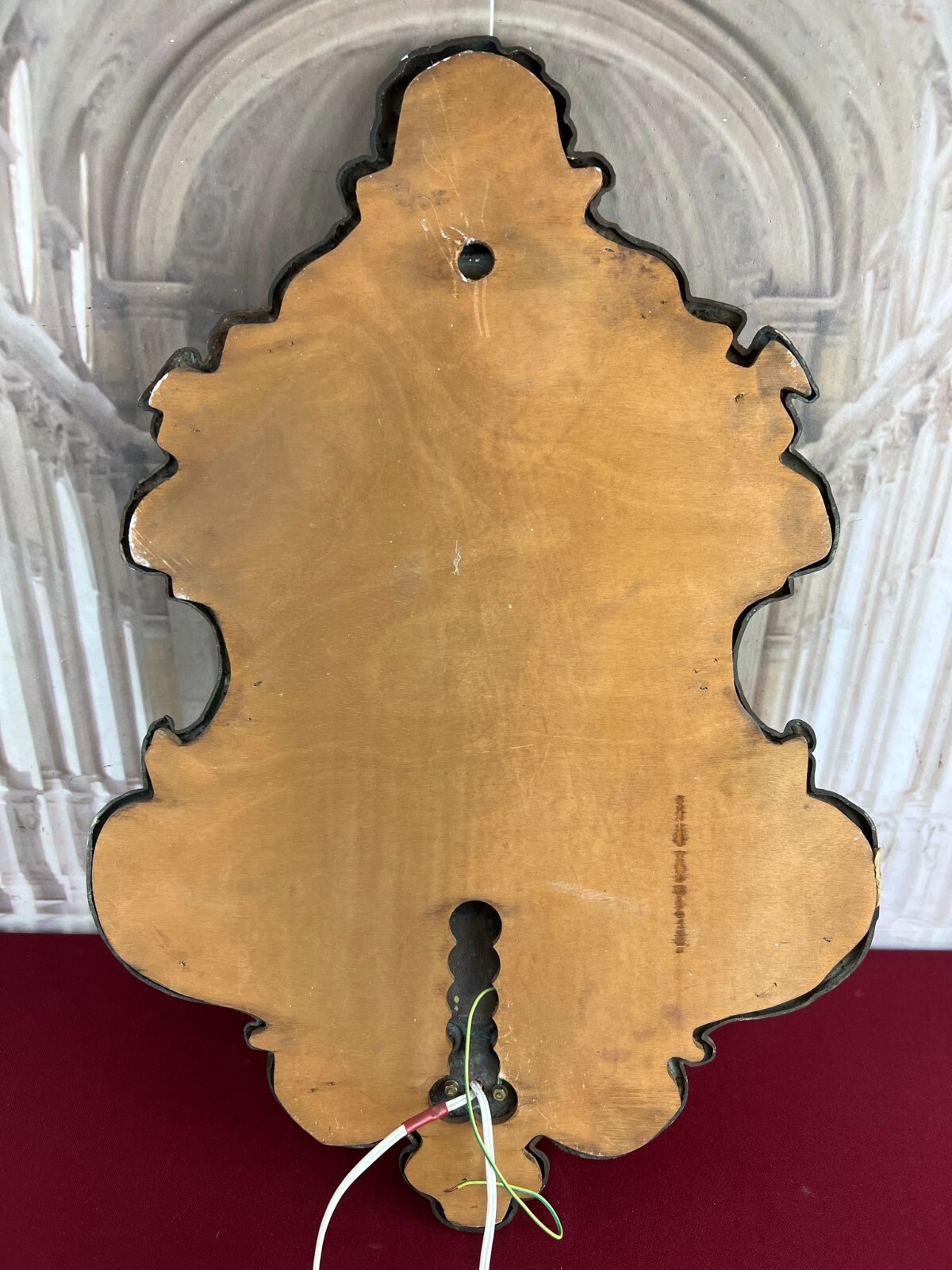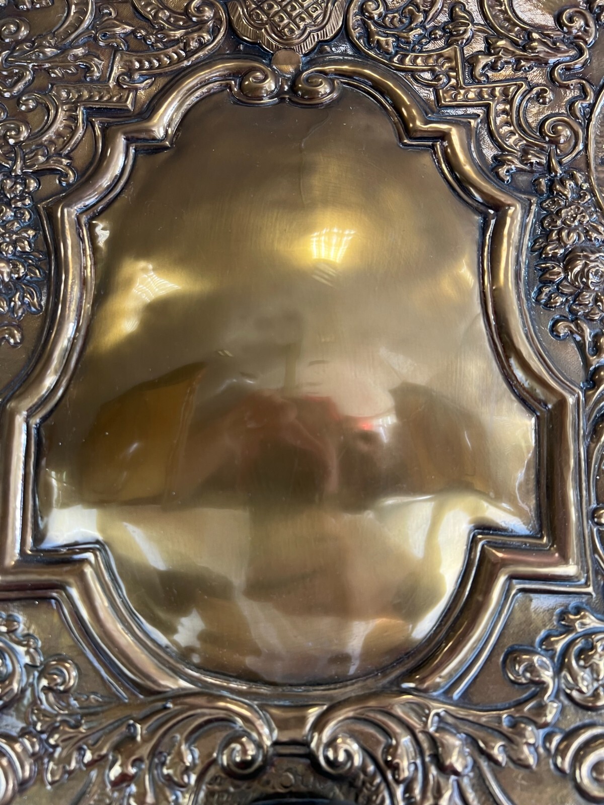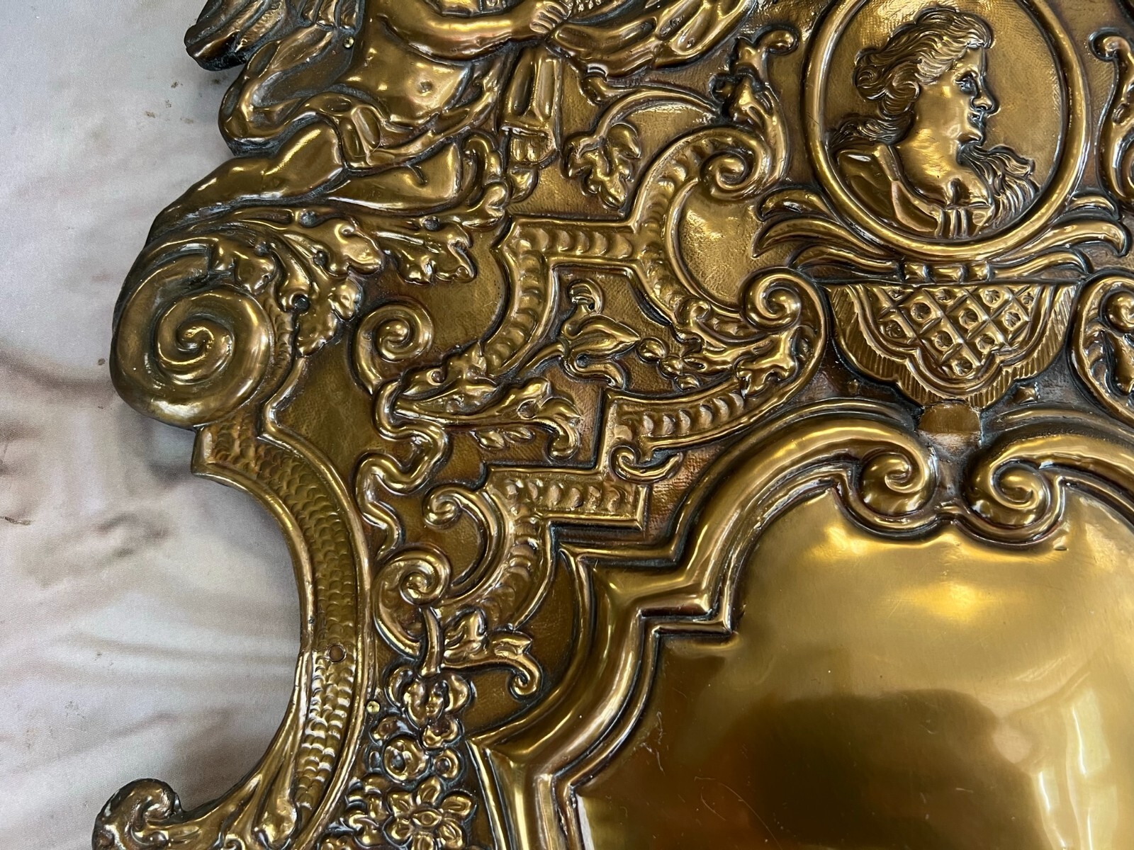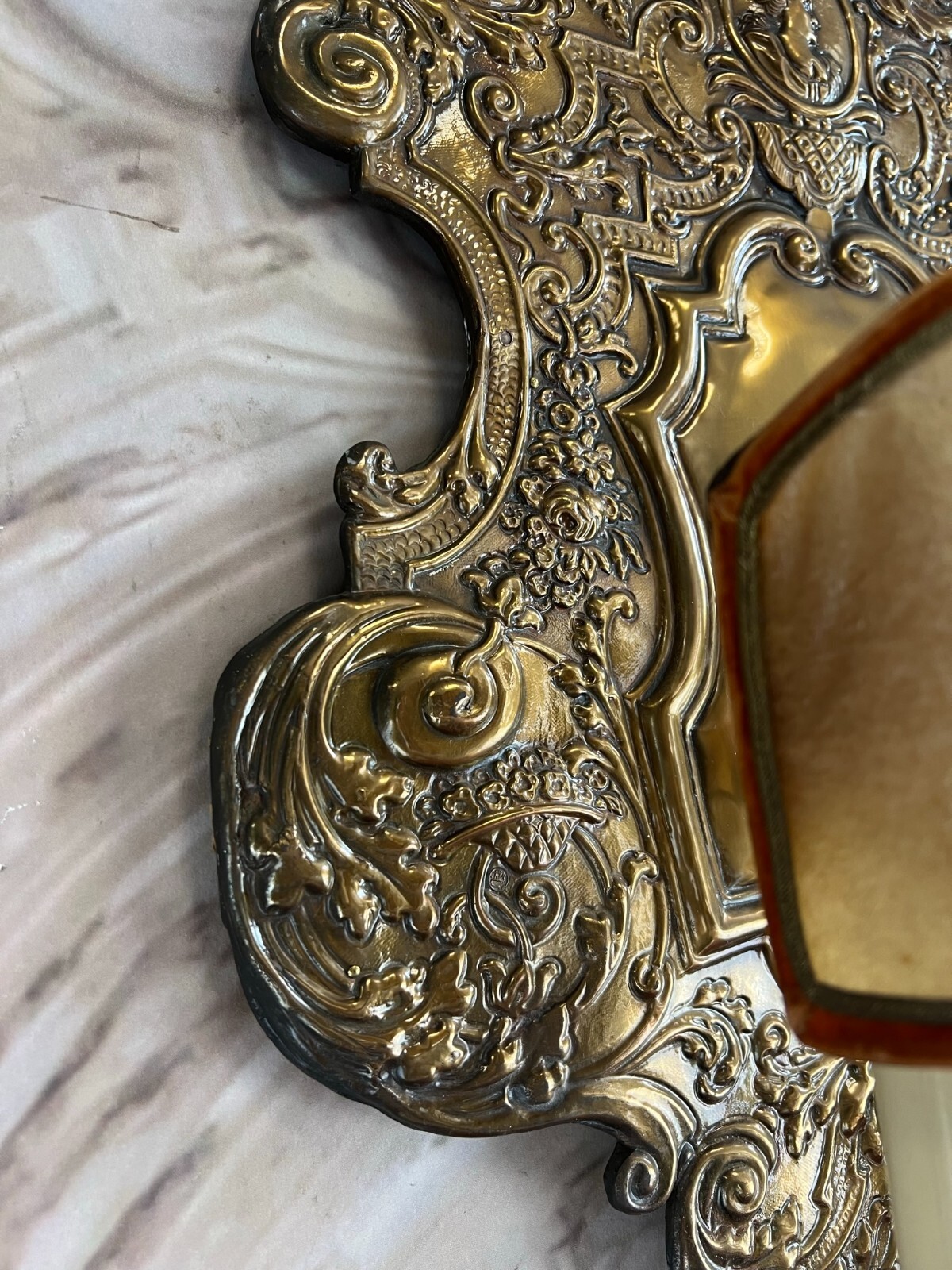 Große Wandleuchte aus Kupfer, in Historismusstil angefertigt. Die Schirmchen verbogen und fleckig, das Metall absichtlich dellig verarbeitet um antike Patina zu erzeugen, Funktion ungeprüft. Im großen Medaillon leichte Kratzer. Abmessungen BTH: 45x17x6,5cm.