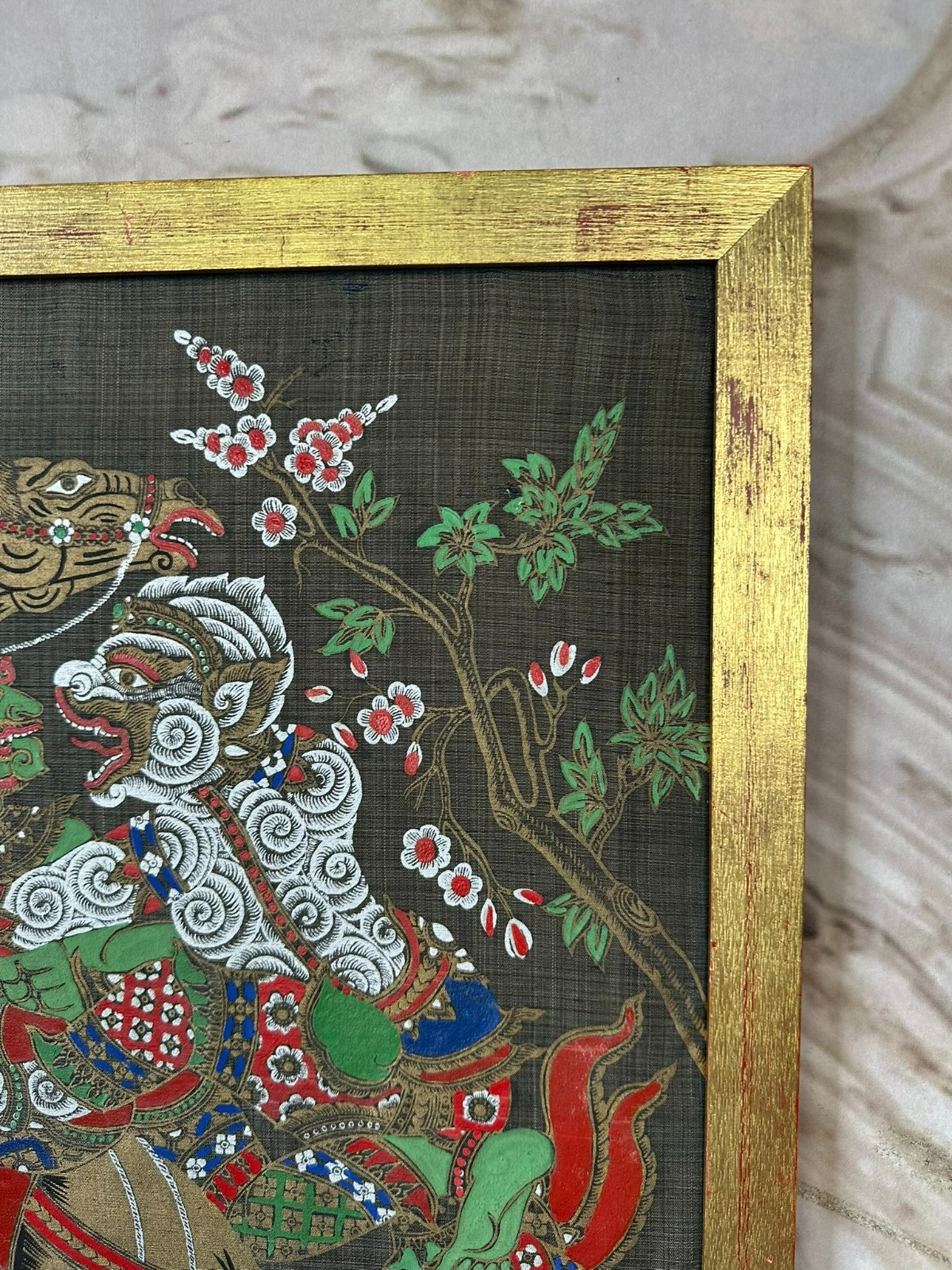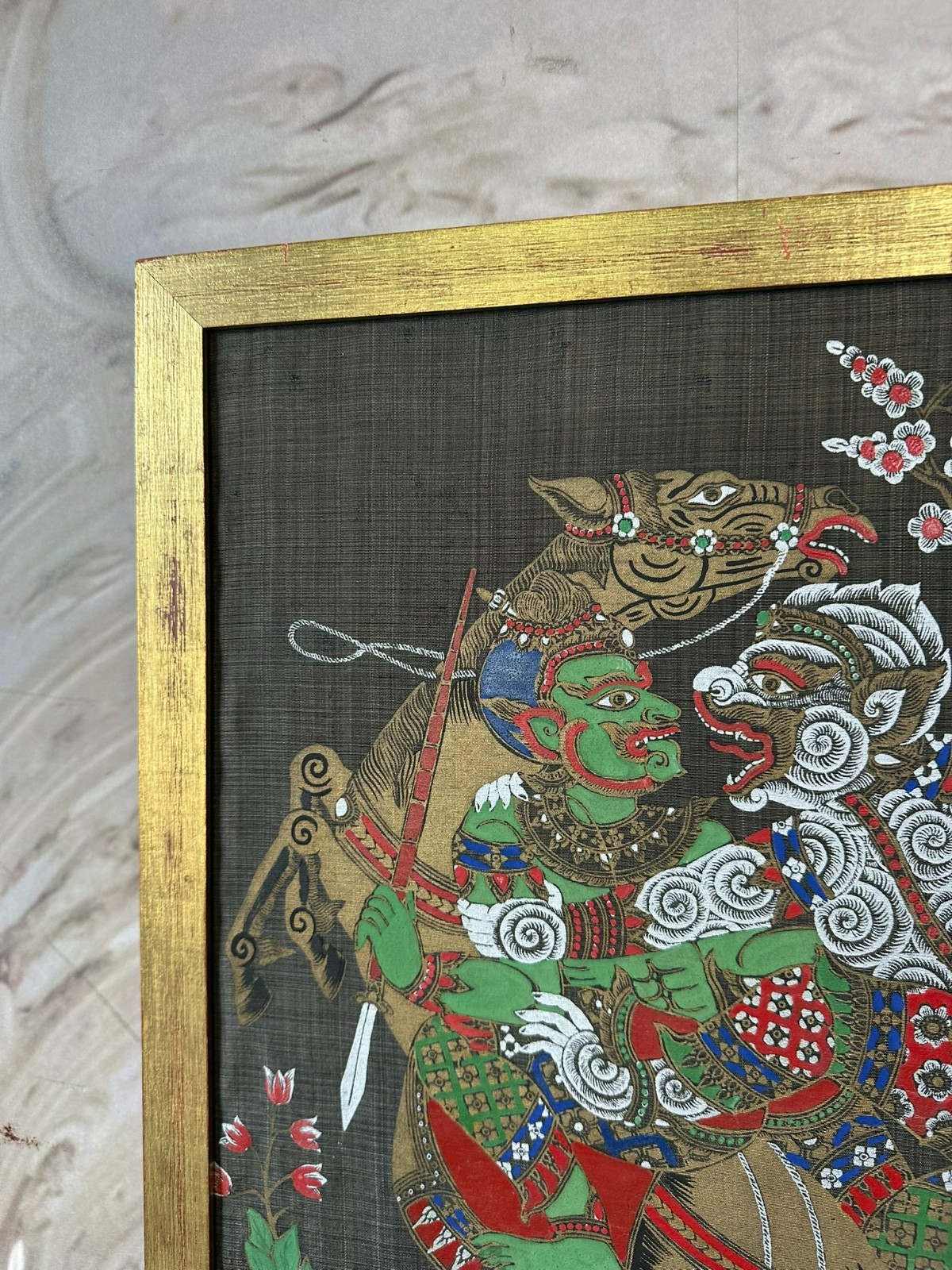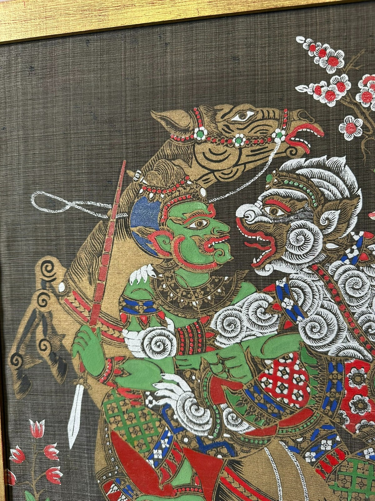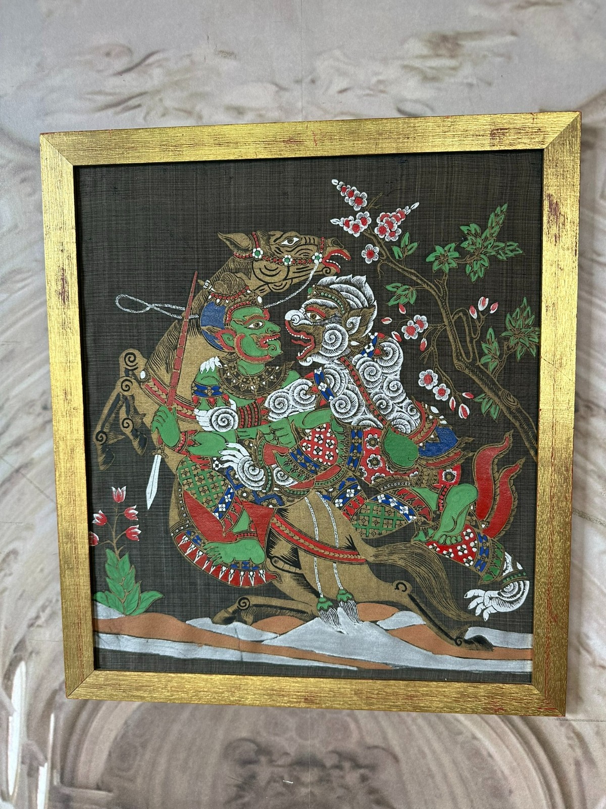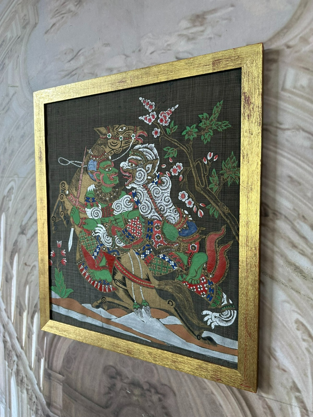 Indonesische Malerei auf Stoff, sehr schön gerahmt. Im unteren Bereich leichter Abrieb. Gesamtabmessungen 47x53cm.