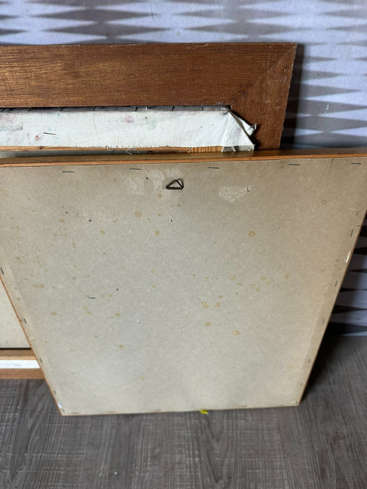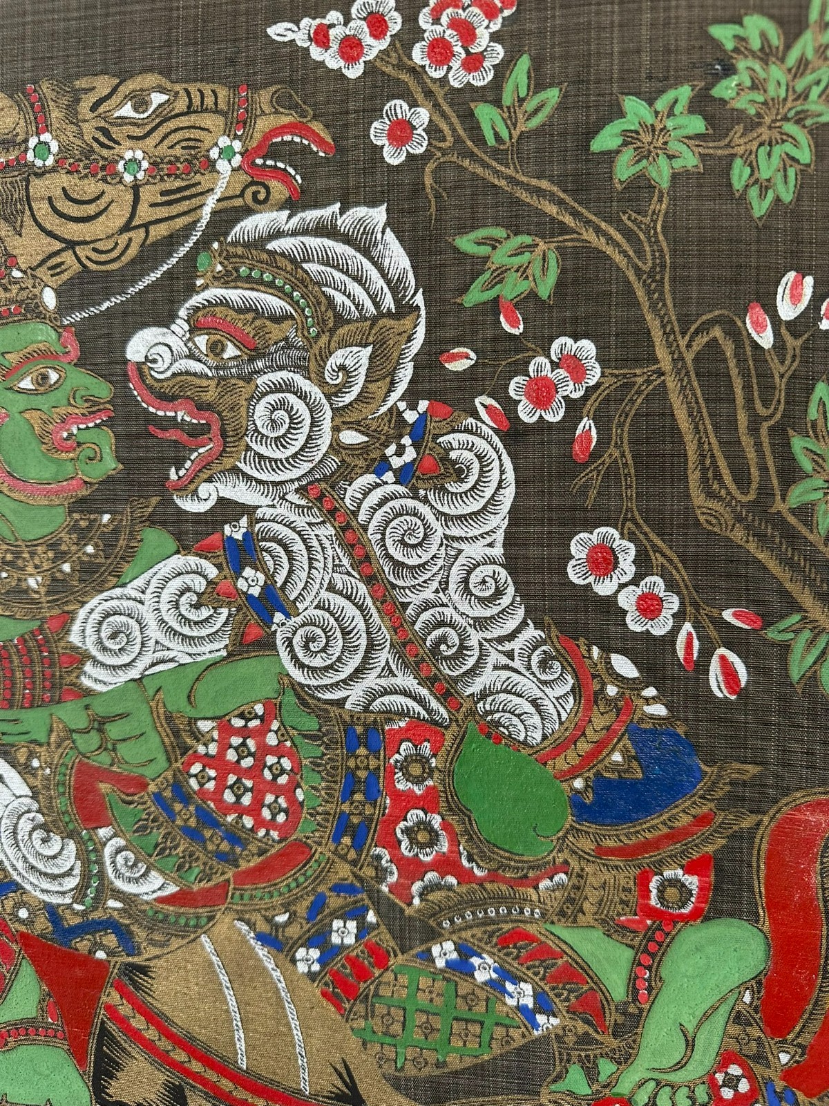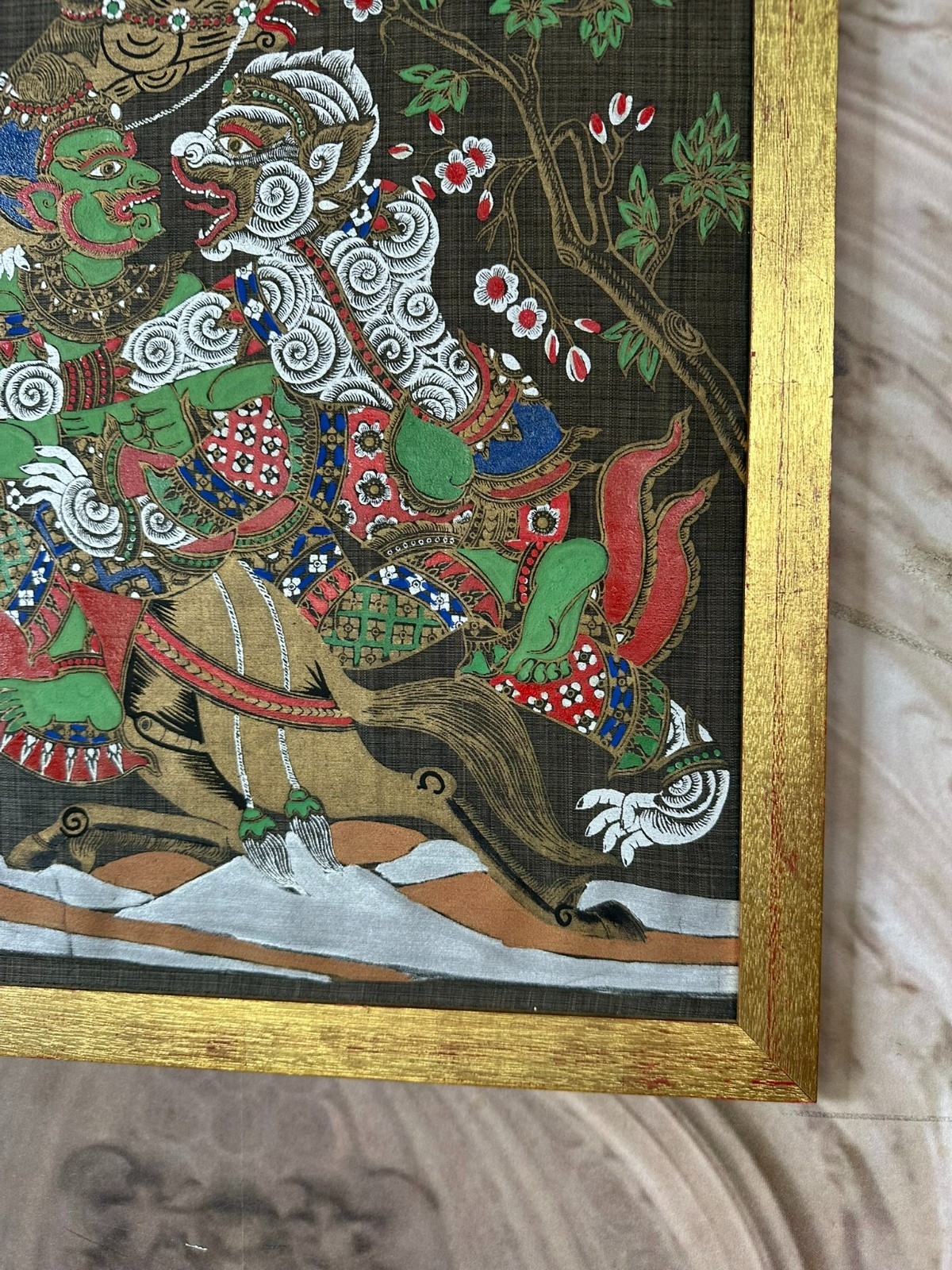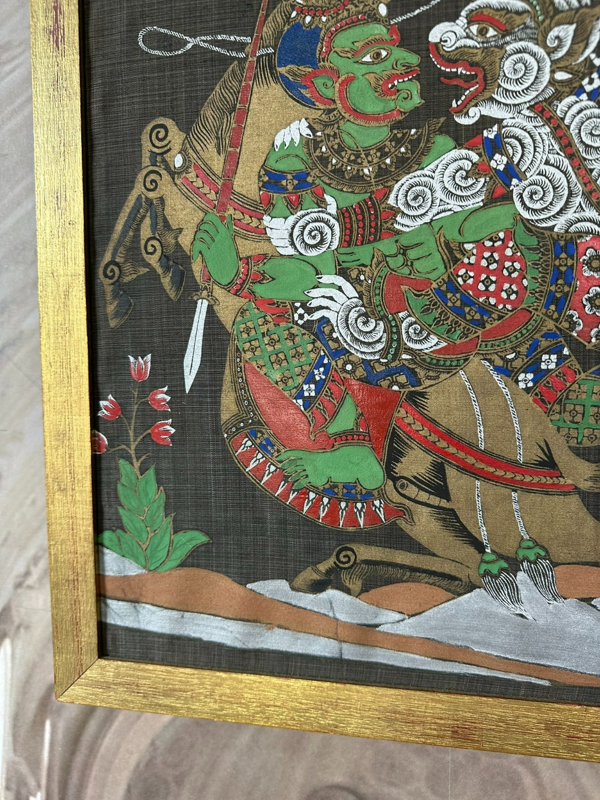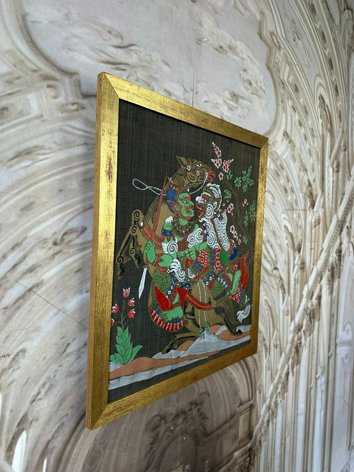 Indonesische Malerei auf Stoff, sehr schön gerahmt. Im unteren Bereich leichter Abrieb. Gesamtabmessungen 47x53cm.