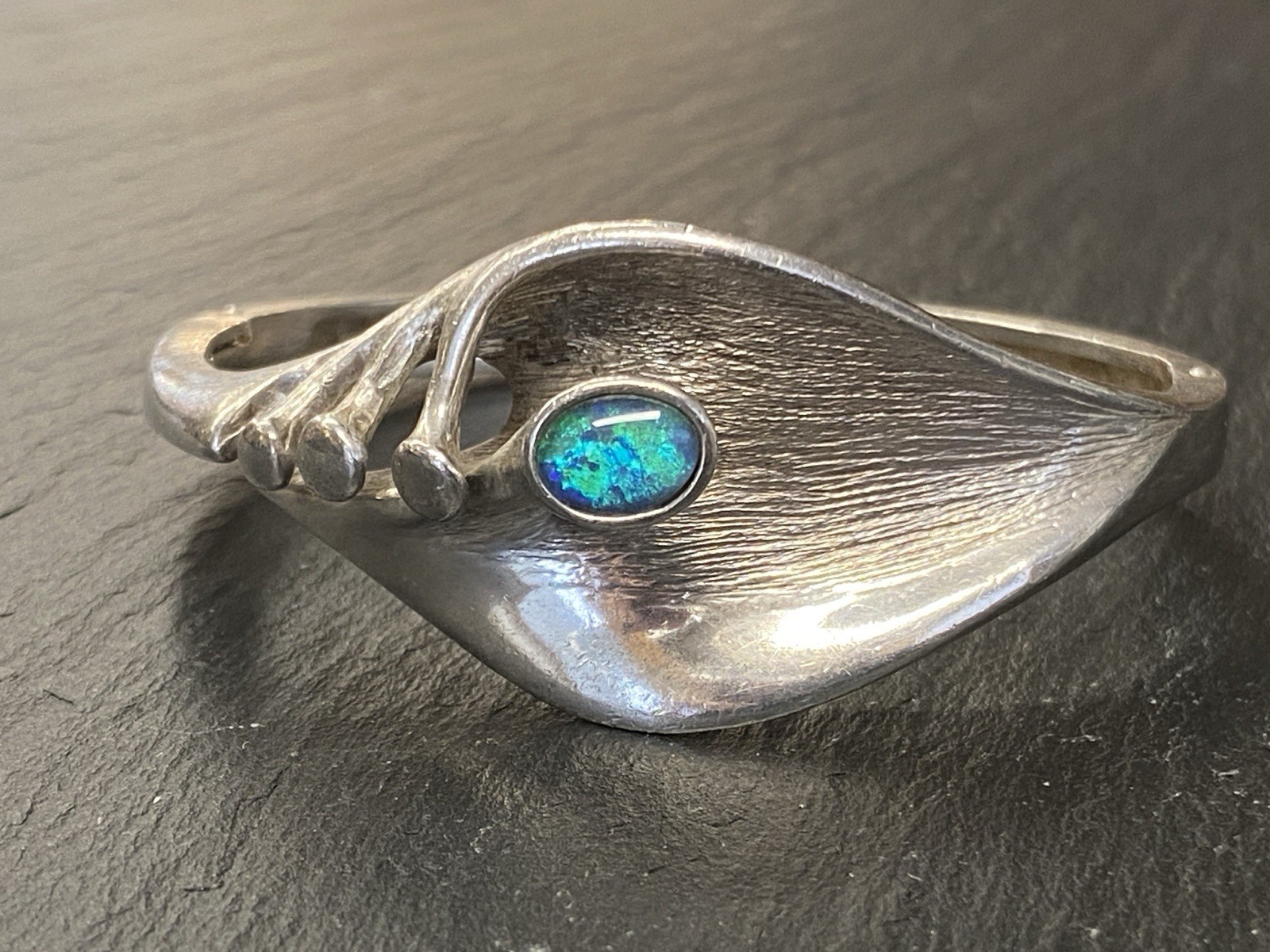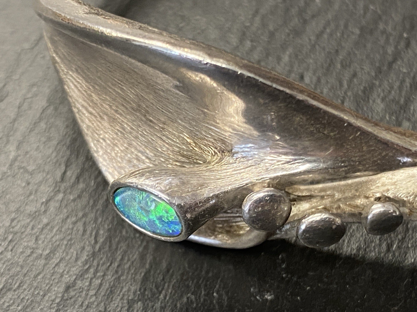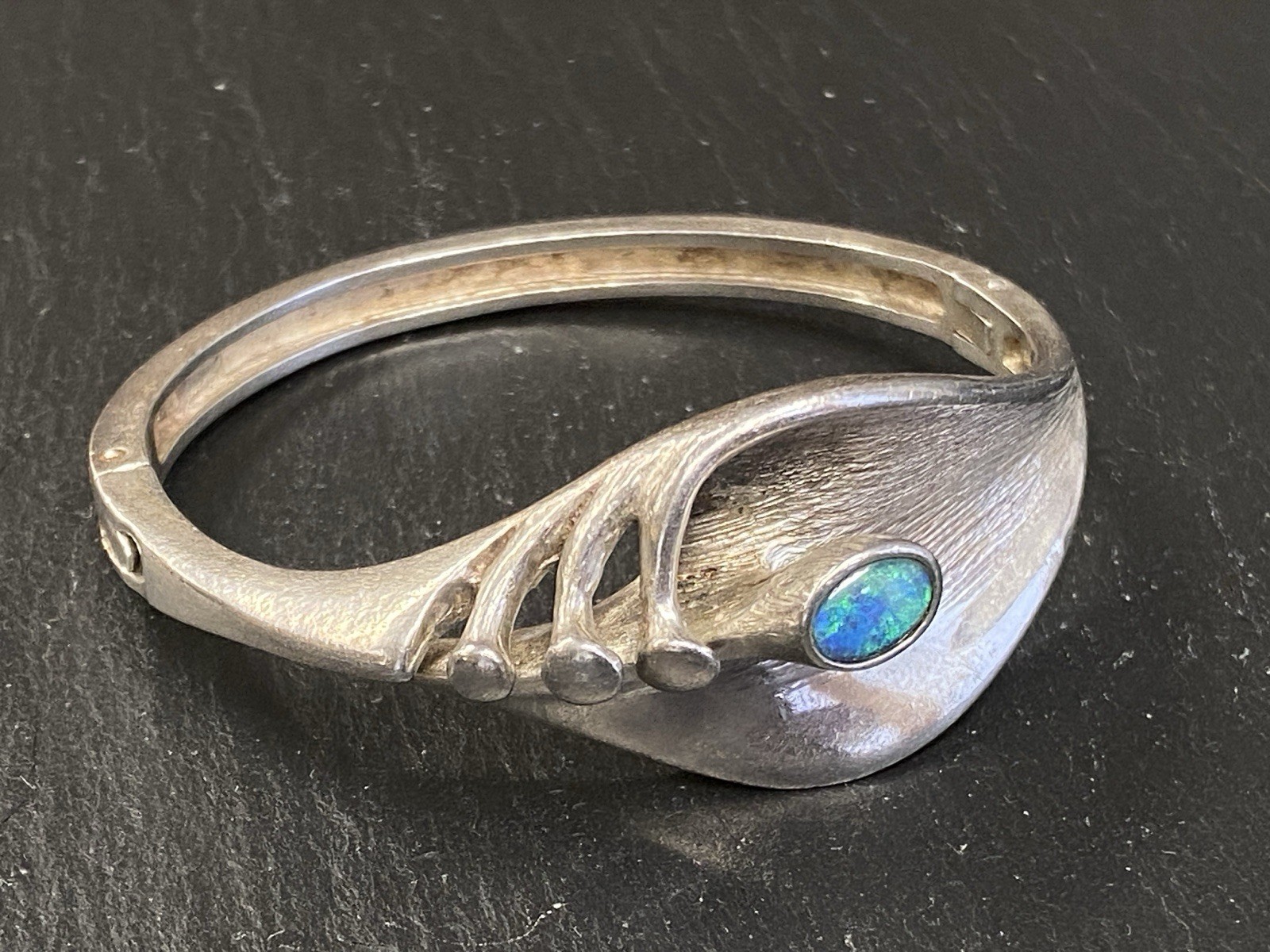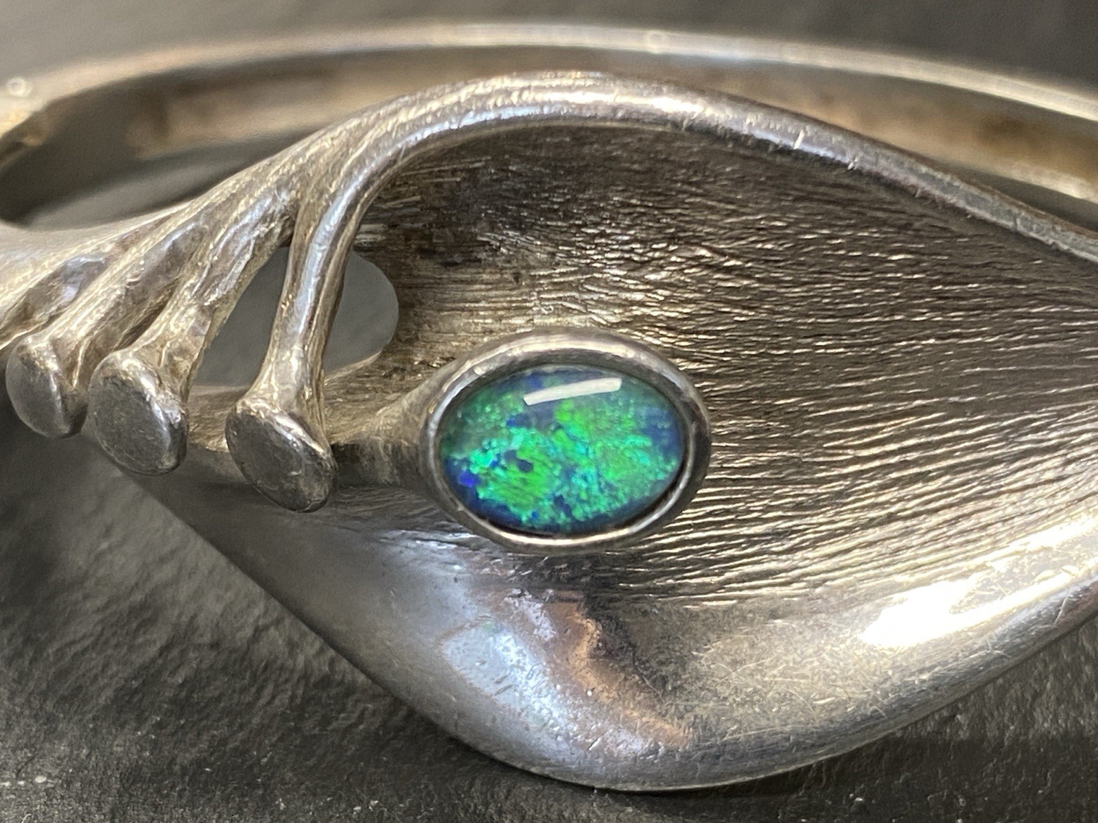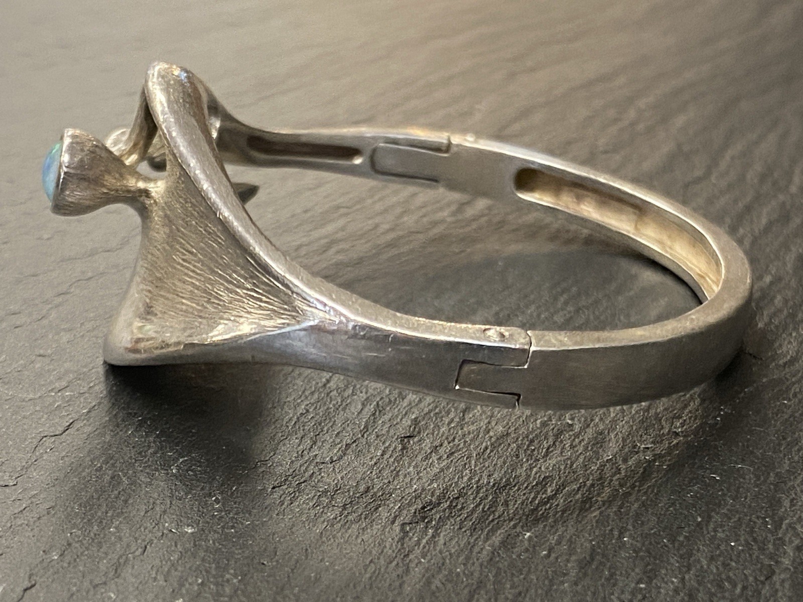 Eleganter Armreif aus 925 Sterling Silber, gestempelt, ebenso mit Herstellerpunze „Jeunesse“. Geziert wird der Armreif von einem strahlend blau-grünen Opal mit H/B ca. 8,1/6cm, soweit in der Fassung messbar, die genaue Tiefe ist leider nicht messbar. Die Oberfläche ist gewollt uneben, minimale Abnutzungsspuren sichtbar. Der Armreif lässt sich mittig an der Seite öffnen, der Verschluss funktioniert. Insbesondere dort Oxydationsspuren, diese sind aber am gesamten Armreif möglich. Kanten teils leicht bestoßen. BTH des Mittelteils 5/1,3/2,6cm, B/H der Schiene unten 0,5/0,3cm, H/B des gesamten Armreifs 6,3/6,5cm, Gewicht ca. 36,16g.