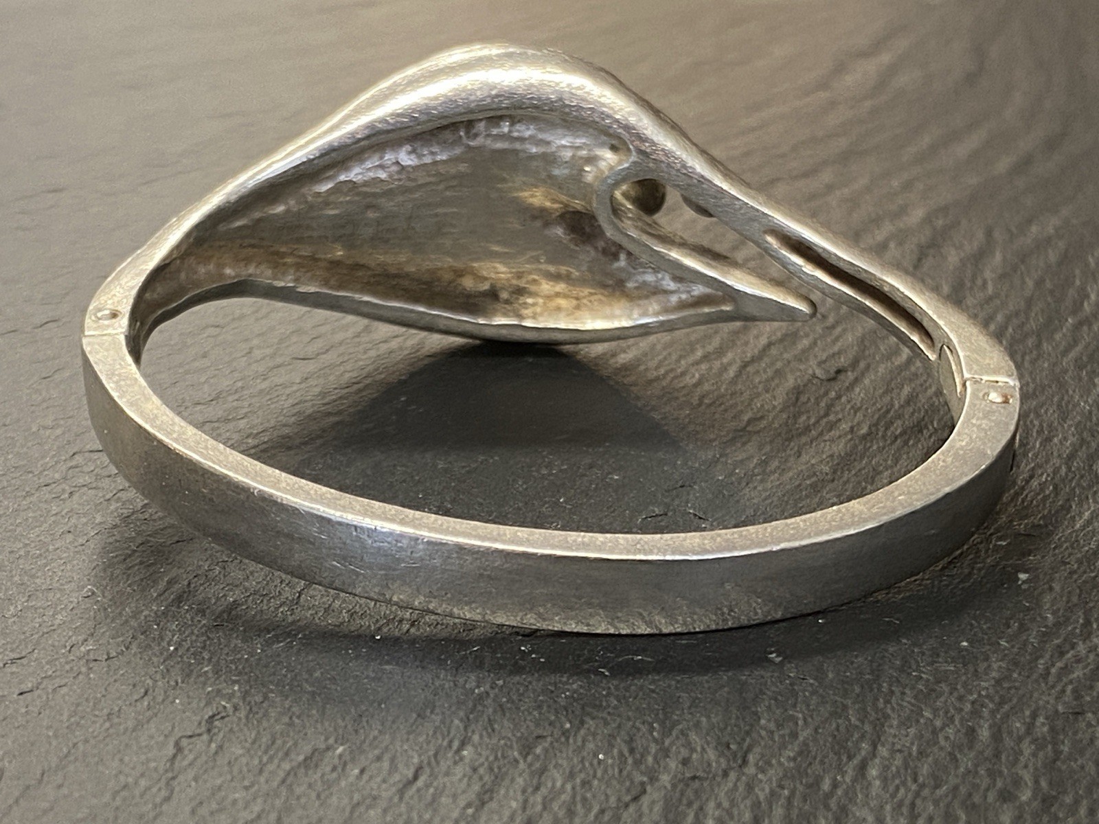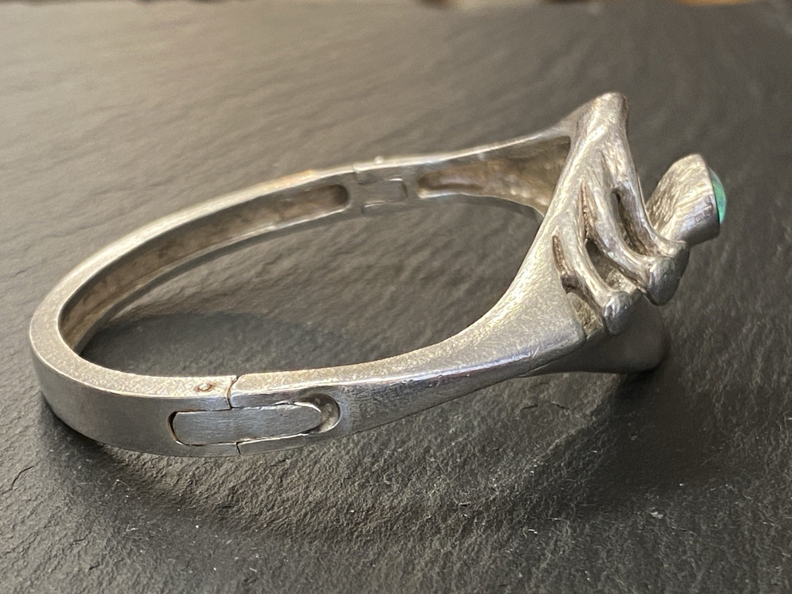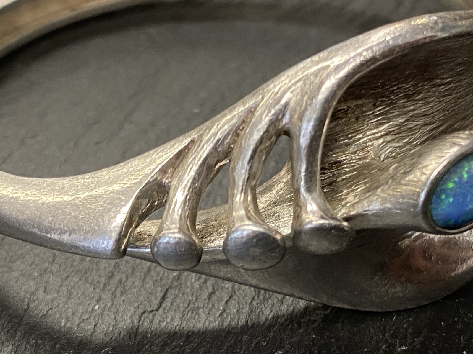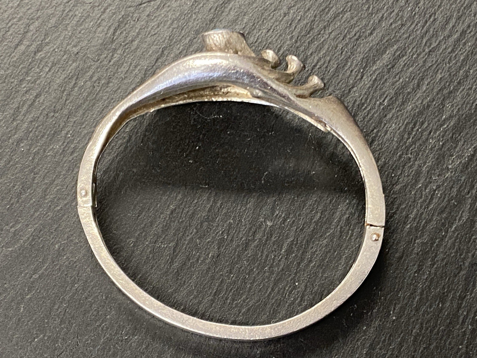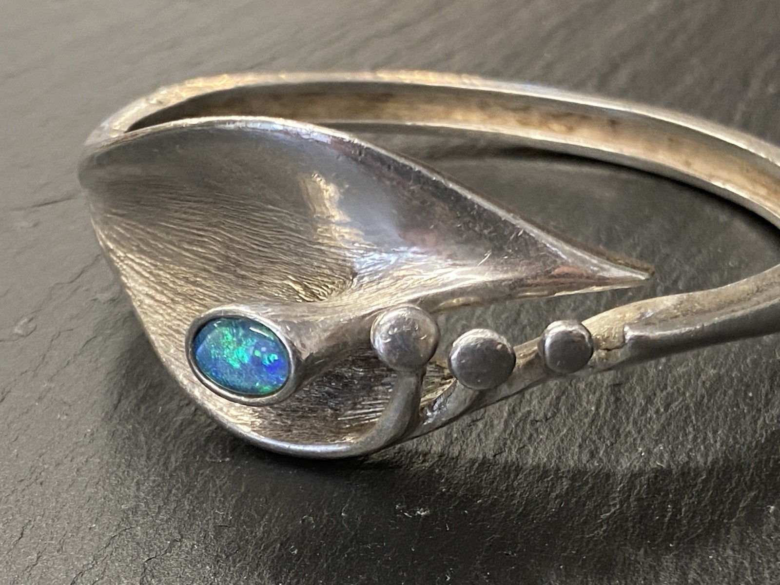 Eleganter Armreif aus 925 Sterling Silber, gestempelt, ebenso mit Herstellerpunze „Jeunesse“. Geziert wird der Armreif von einem strahlend blau-grünen Opal mit H/B ca. 8,1/6cm, soweit in der Fassung messbar, die genaue Tiefe ist leider nicht messbar. Die Oberfläche ist gewollt uneben, minimale Abnutzungsspuren sichtbar. Der Armreif lässt sich mittig an der Seite öffnen, der Verschluss funktioniert. Insbesondere dort Oxydationsspuren, diese sind aber am gesamten Armreif möglich. Kanten teils leicht bestoßen. BTH des Mittelteils 5/1,3/2,6cm, B/H der Schiene unten 0,5/0,3cm, H/B des gesamten Armreifs 6,3/6,5cm, Gewicht ca. 36,16g.