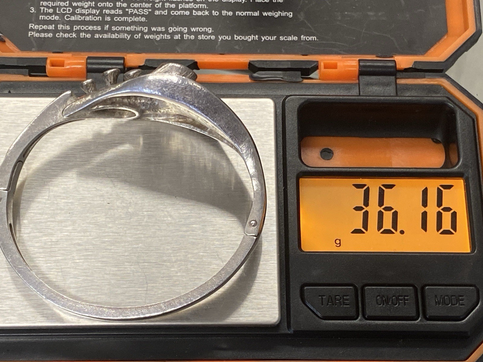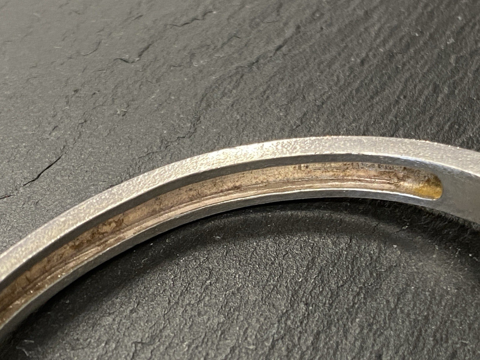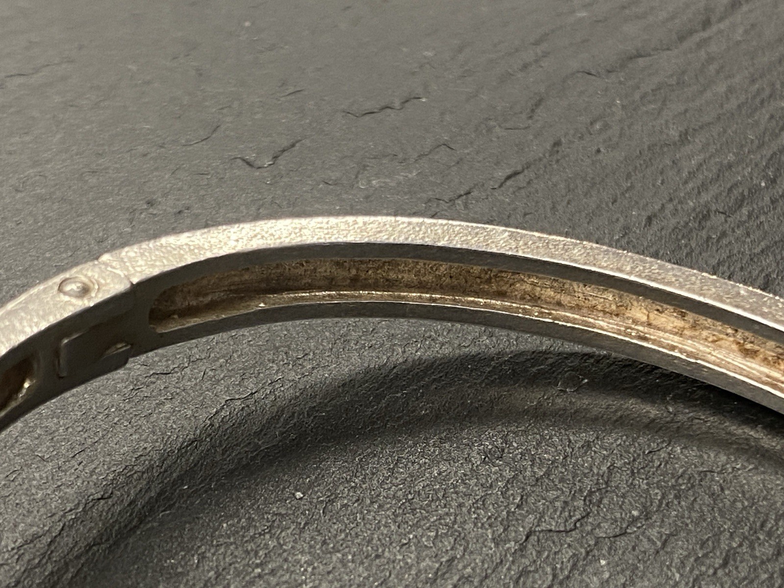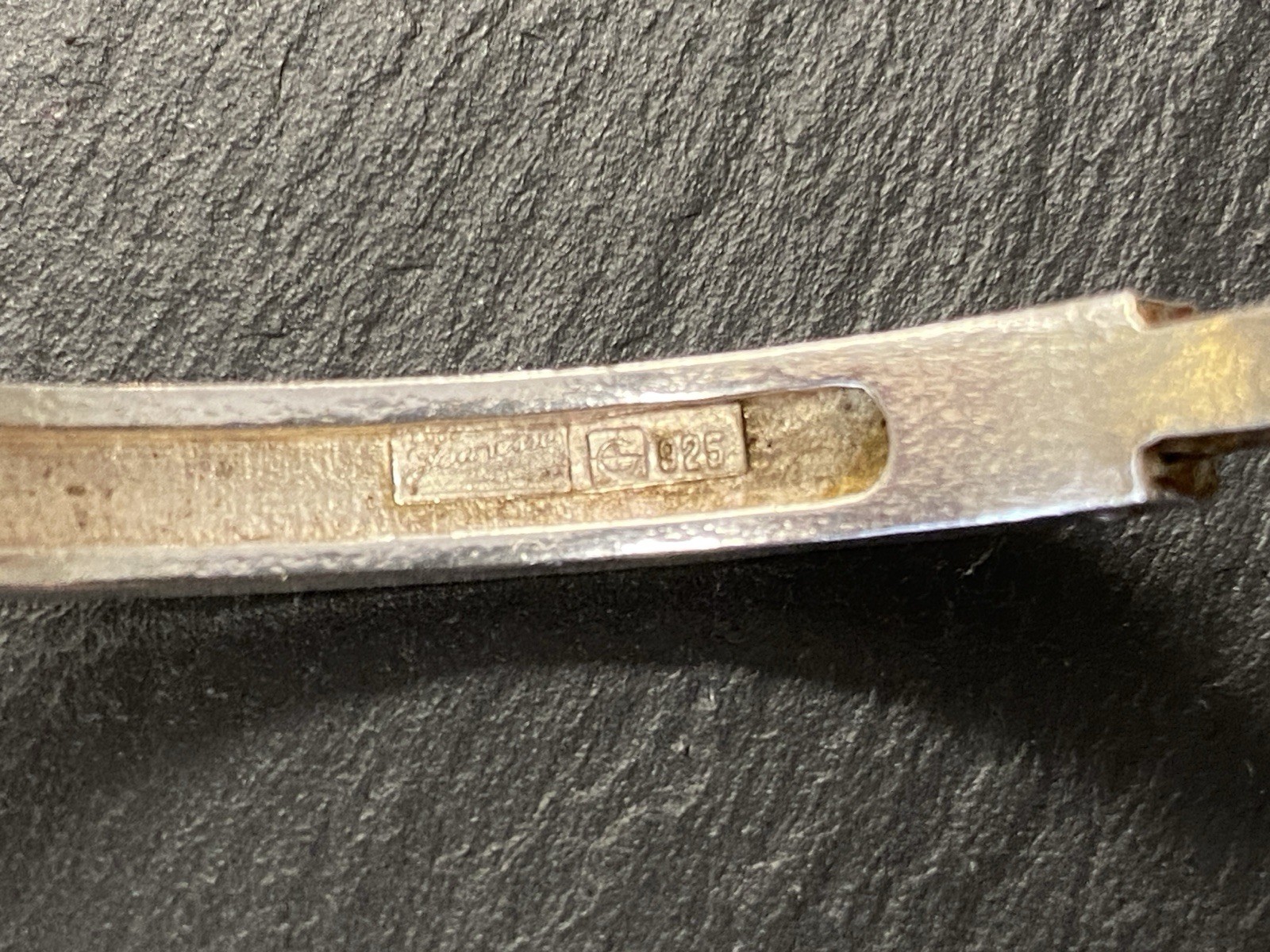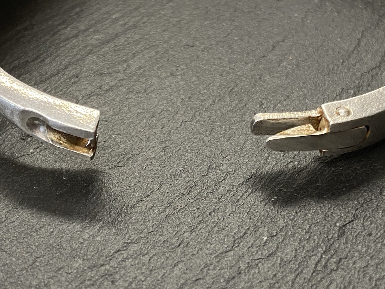 Eleganter Armreif aus 925 Sterling Silber, gestempelt, ebenso mit Herstellerpunze „Jeunesse“. Geziert wird der Armreif von einem strahlend blau-grünen Opal mit H/B ca. 8,1/6cm, soweit in der Fassung messbar, die genaue Tiefe ist leider nicht messbar. Die Oberfläche ist gewollt uneben, minimale Abnutzungsspuren sichtbar. Der Armreif lässt sich mittig an der Seite öffnen, der Verschluss funktioniert. Insbesondere dort Oxydationsspuren, diese sind aber am gesamten Armreif möglich. Kanten teils leicht bestoßen. BTH des Mittelteils 5/1,3/2,6cm, B/H der Schiene unten 0,5/0,3cm, H/B des gesamten Armreifs 6,3/6,5cm, Gewicht ca. 36,16g.