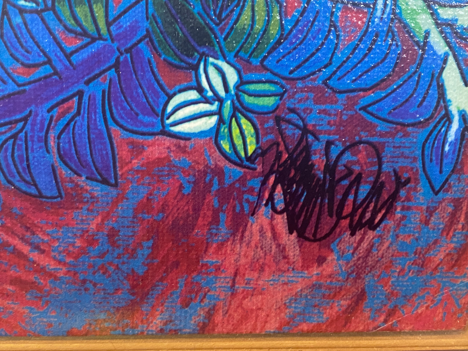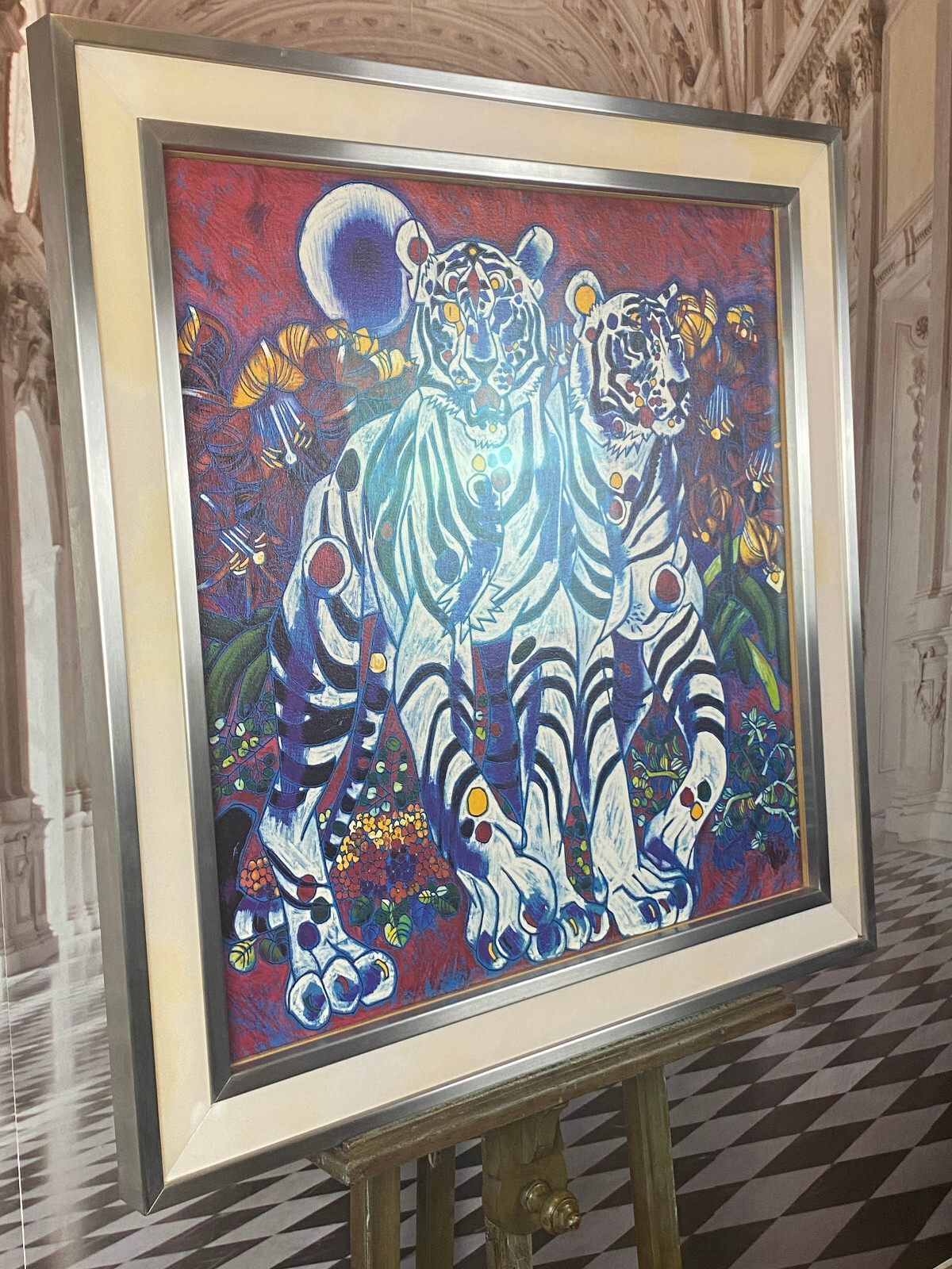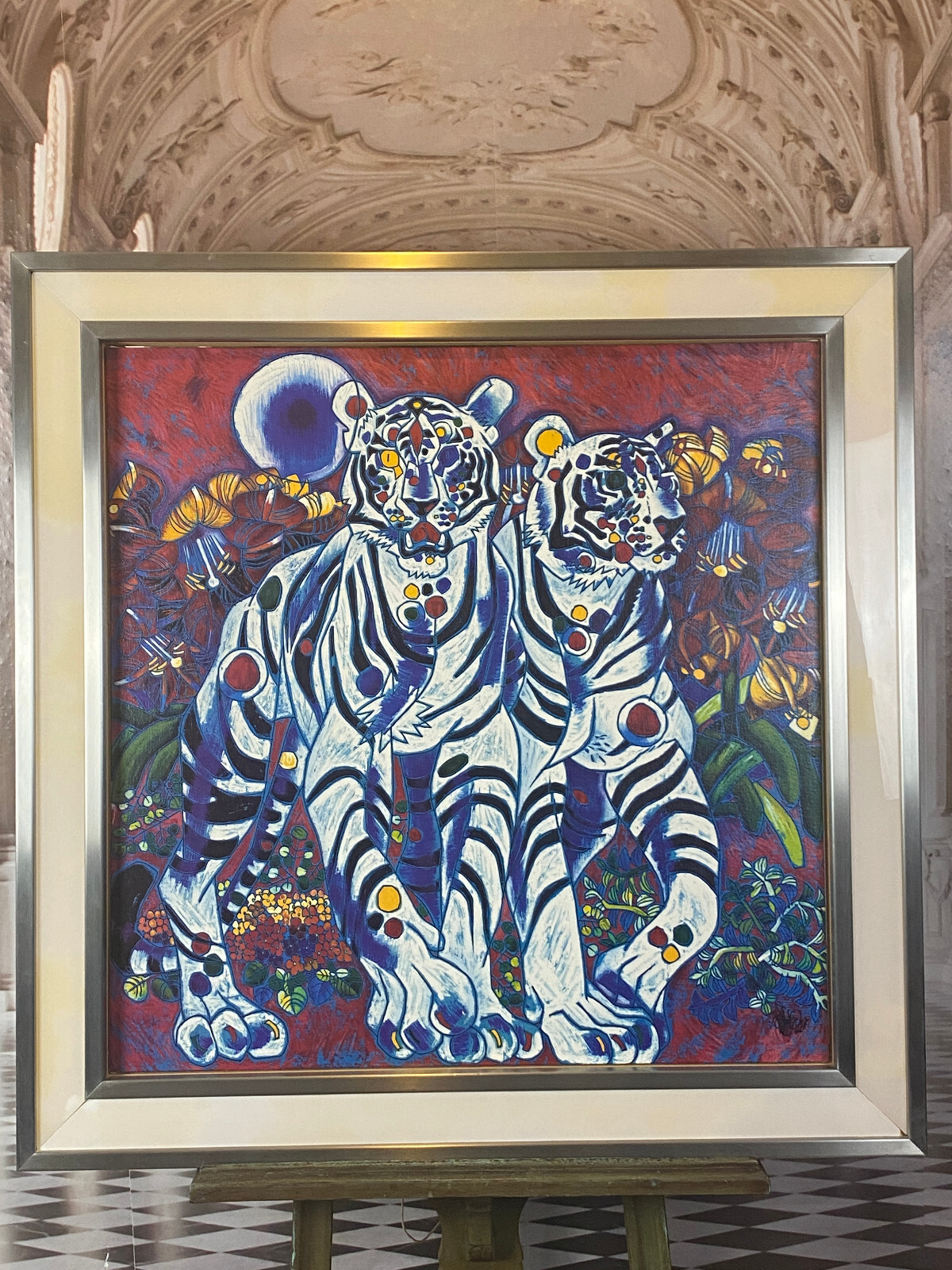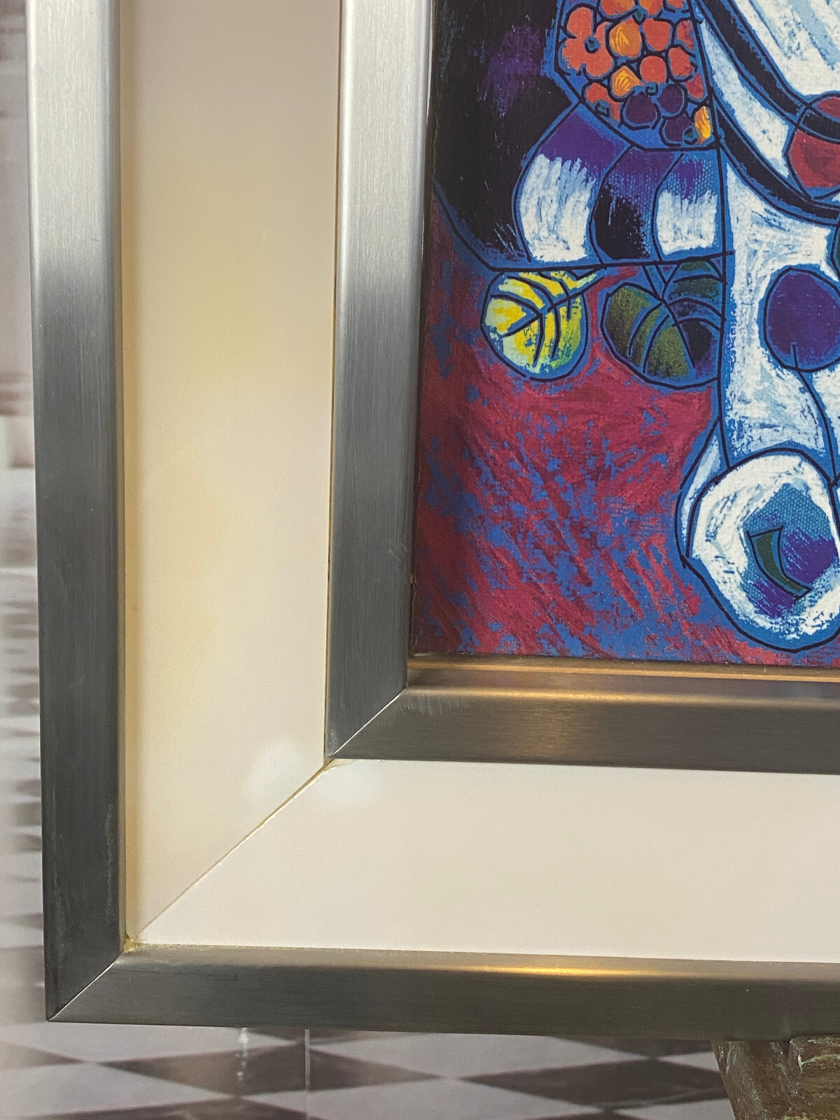 Signierte Serigraphie von JIANG Tiefeng, massiv gerahmt hinter Glas. Sehr schöner Zustand, die weißen Leisten am Rahmen sind aus Glas, schimmern leicht gelblich durch und sind an den Ecken unvollständig. Der silberne Rahmen ist aus Edelstahl und leicht berieben. Abmessungen 79x77cm, mit Rahmen 94x96cm.