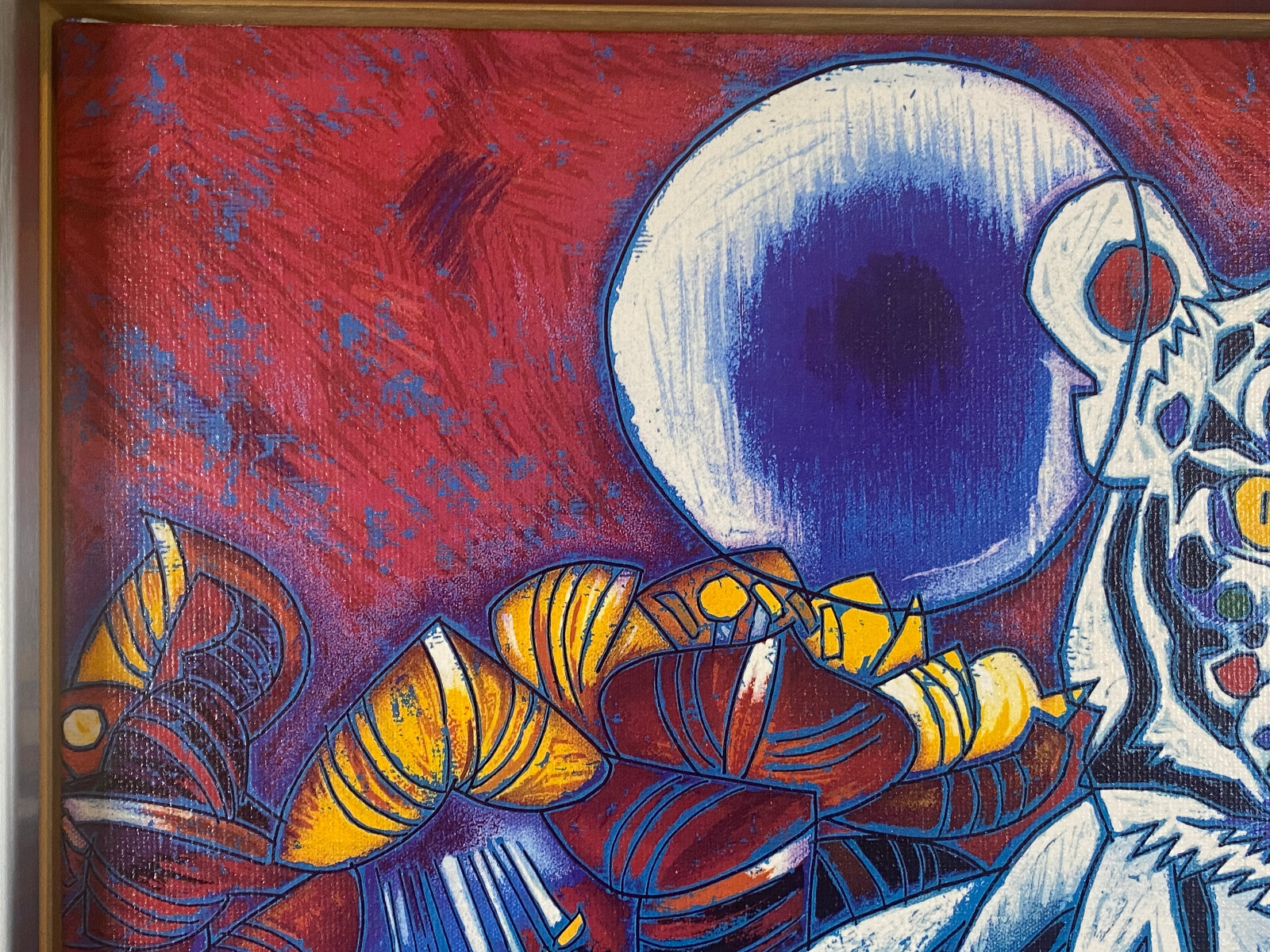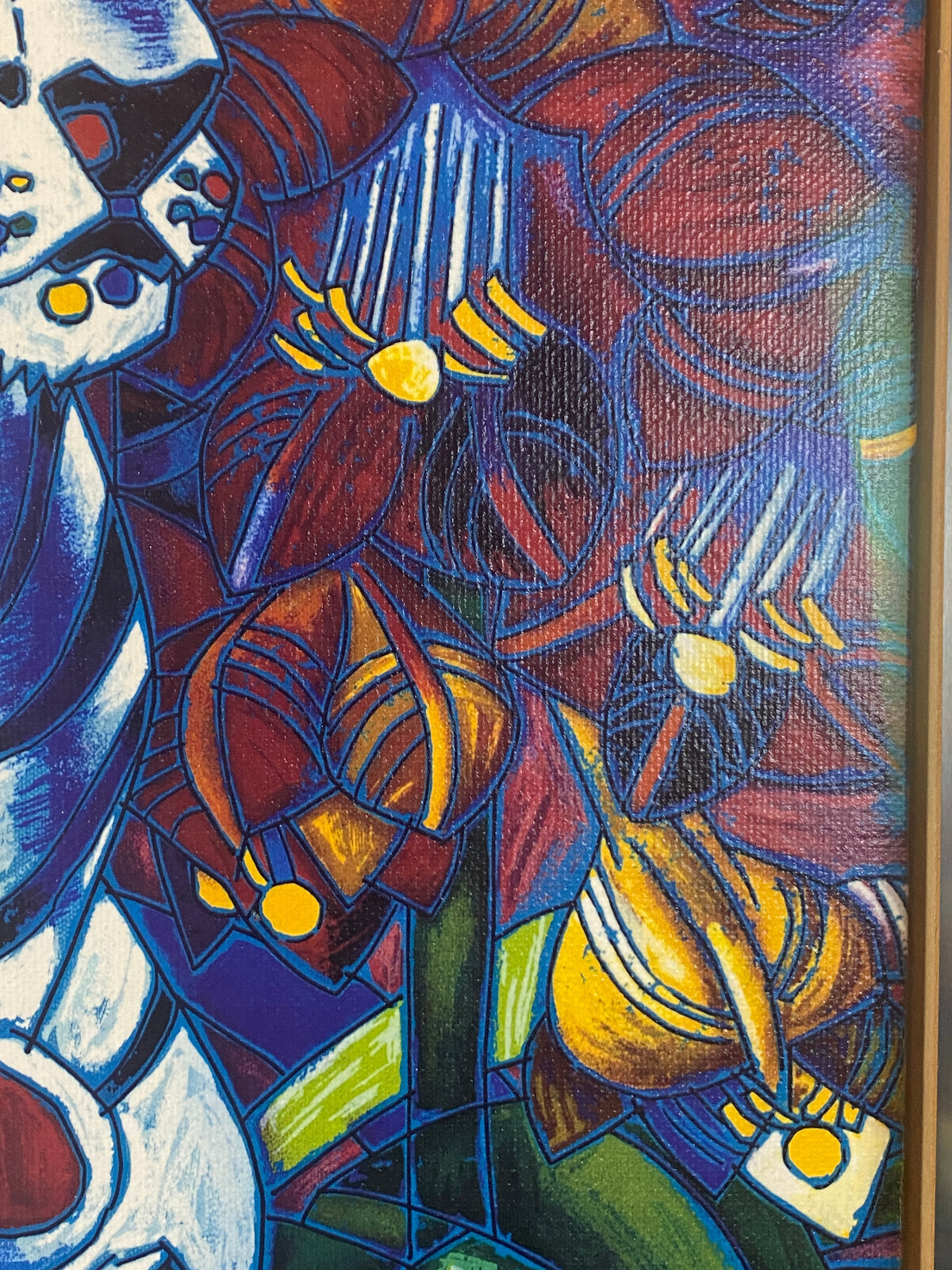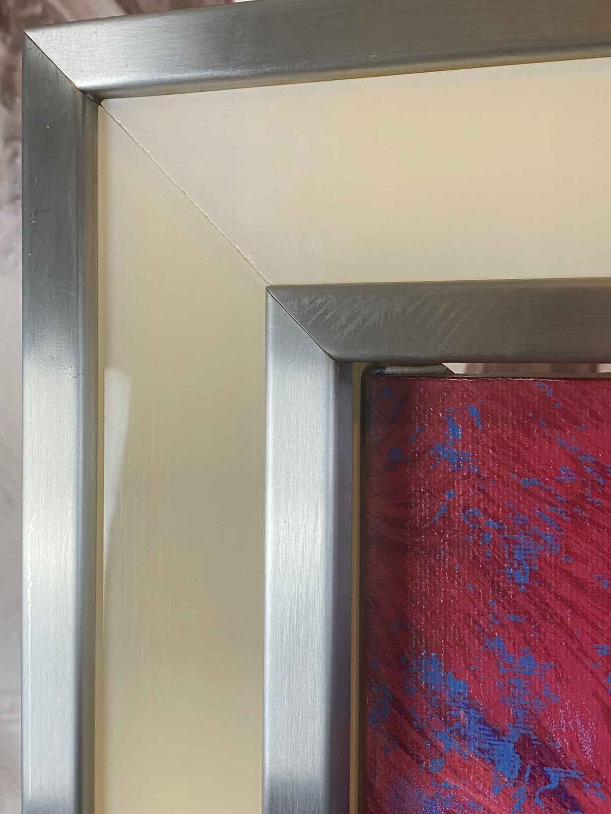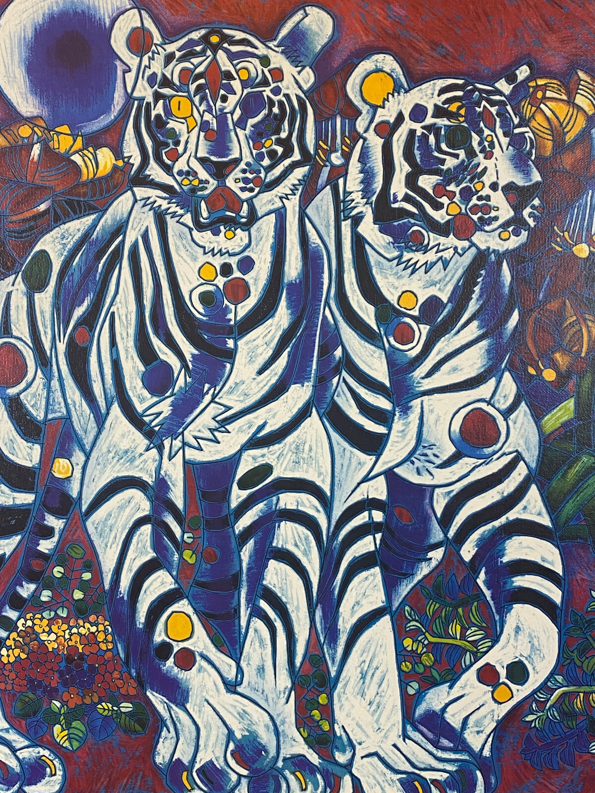 Signierte Serigraphie von JIANG Tiefeng, massiv gerahmt hinter Glas. Sehr schöner Zustand, die weißen Leisten am Rahmen sind aus Glas, schimmern leicht gelblich durch und sind an den Ecken unvollständig. Der silberne Rahmen ist aus Edelstahl und leicht berieben. Abmessungen 79x77cm, mit Rahmen 94x96cm.