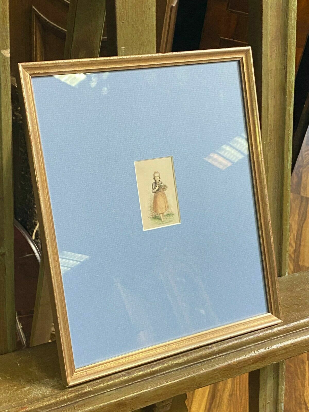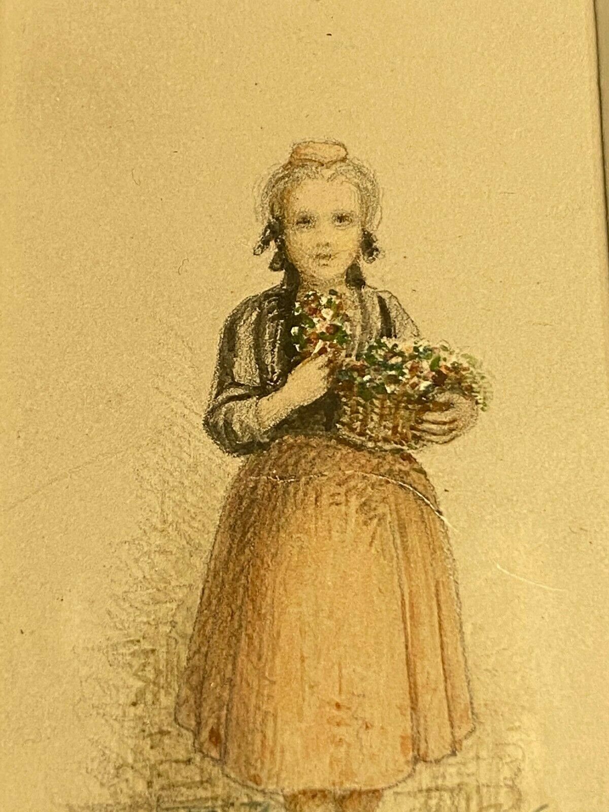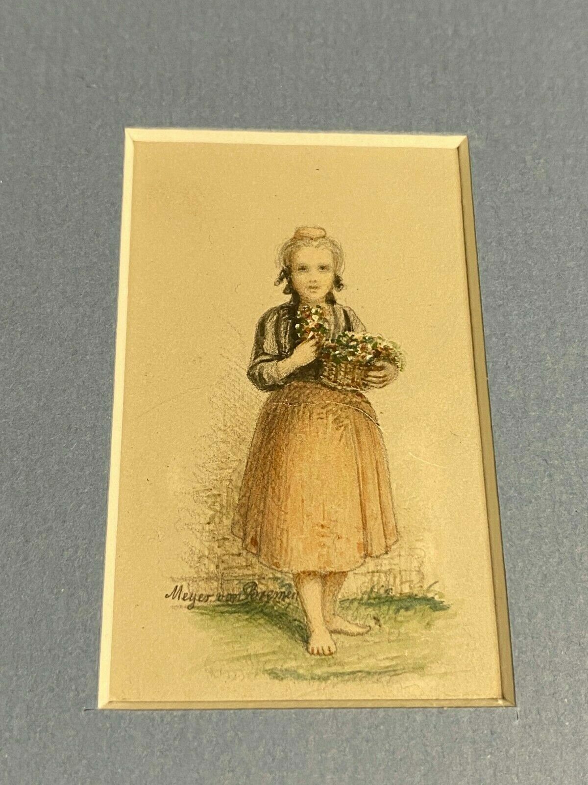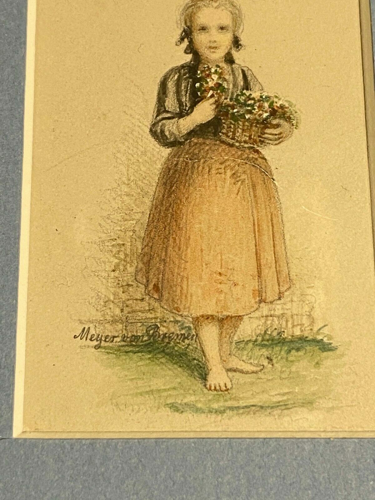 Mischtechnik Buntstift und Aquarell auf Papier, kleines Mädchen mit Blumenkorb, unten links signiert, Meyer von Bremen. Sehr gut gerahmt, im Passepartout hinter Glas, Abmessungen Zeichnung sichtbar: 4,2x7cm, mit Rahmen: 25x30cm .Zustand sehr gut, das Blatt hatte eine Falte vor dem Zeichnen, die beim Rahmen wohl auseinander gezogen wurde (oberer Bereich des Rocks)