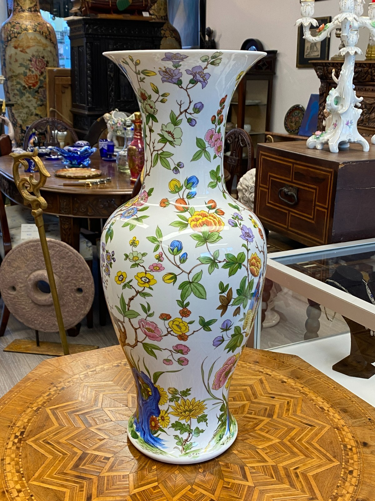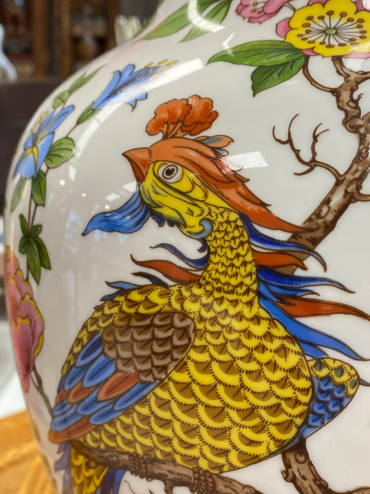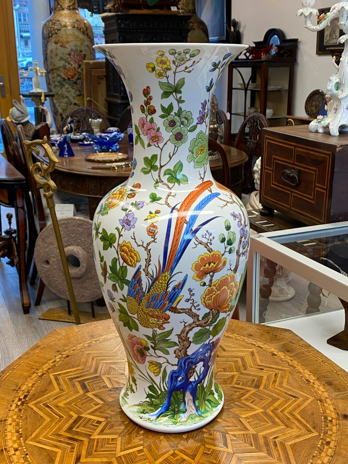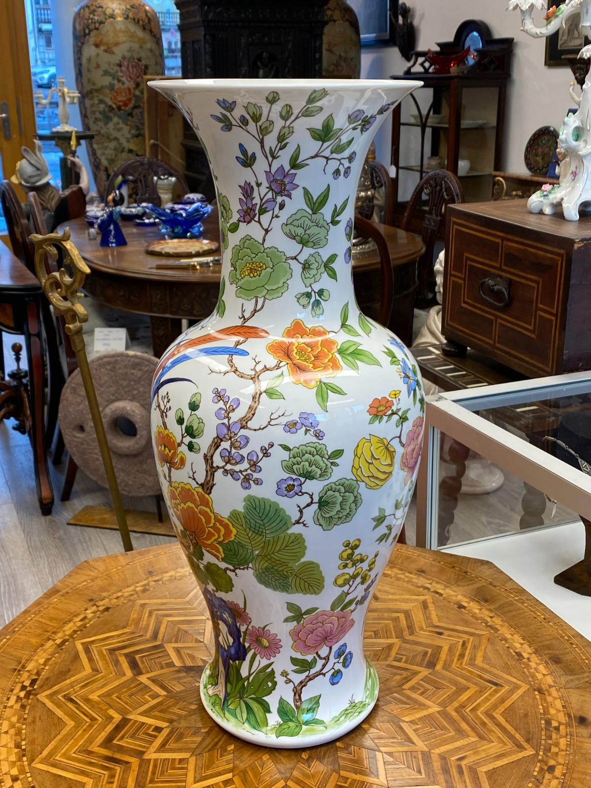 Sehr schöne große Vase aus Porzellan der Manufaktur Kaiser im Dekor Nanking. Die Vase ist dekoriert mit Blumen, Bäumen und Vögeln im Stil chinesischer Porzellane. Keine Chips oder Abplatzer, Gesamthöhe ca. 56cm. Durchmesser der Bodenplatte ca. 17cm, Durchmesser der Öffnung ca. 21,2cm, Gesamtgewicht ca. 4,03kg.