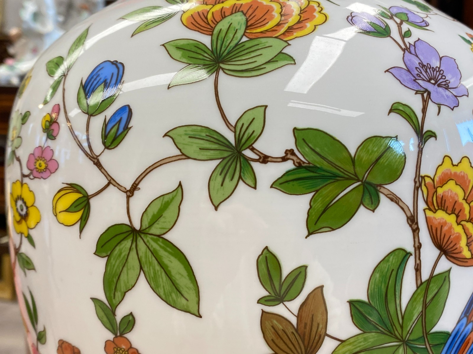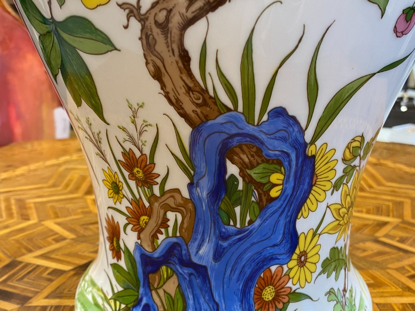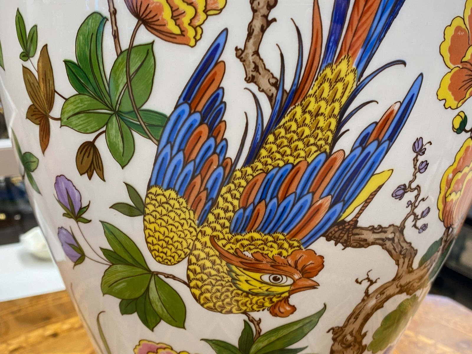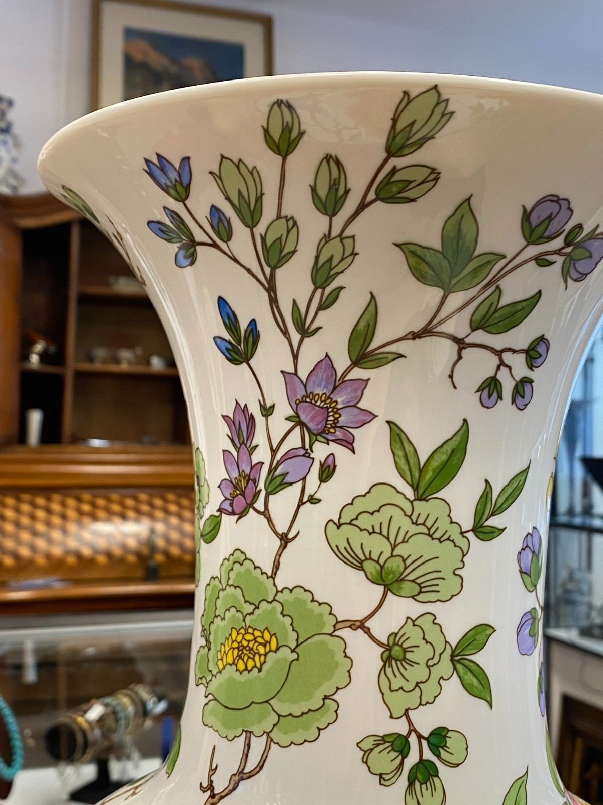 Sehr schöne große Vase aus Porzellan der Manufaktur Kaiser im Dekor Nanking. Die Vase ist dekoriert mit Blumen, Bäumen und Vögeln im Stil chinesischer Porzellane. Keine Chips oder Abplatzer, Gesamthöhe ca. 56cm. Durchmesser der Bodenplatte ca. 17cm, Durchmesser der Öffnung ca. 21,2cm, Gesamtgewicht ca. 4,03kg.
