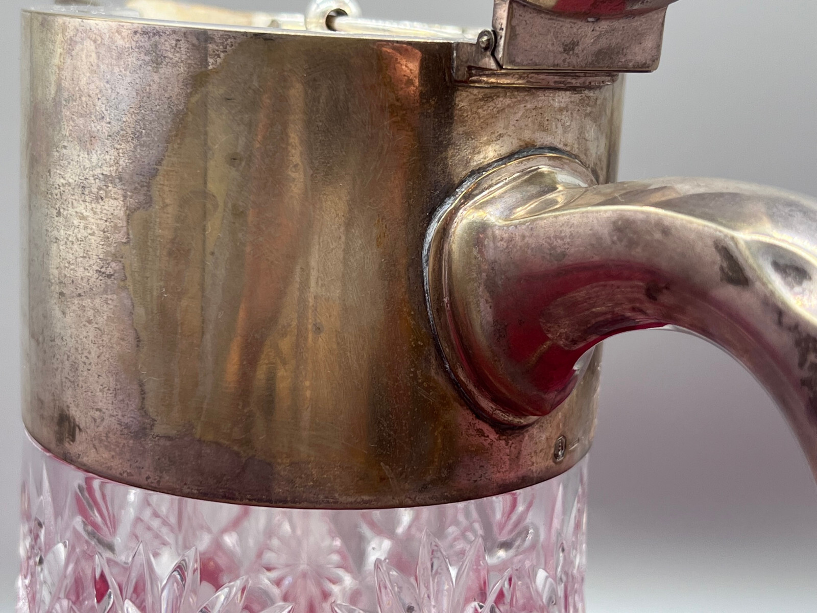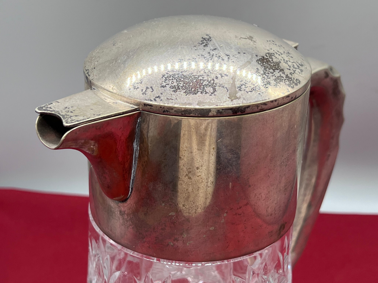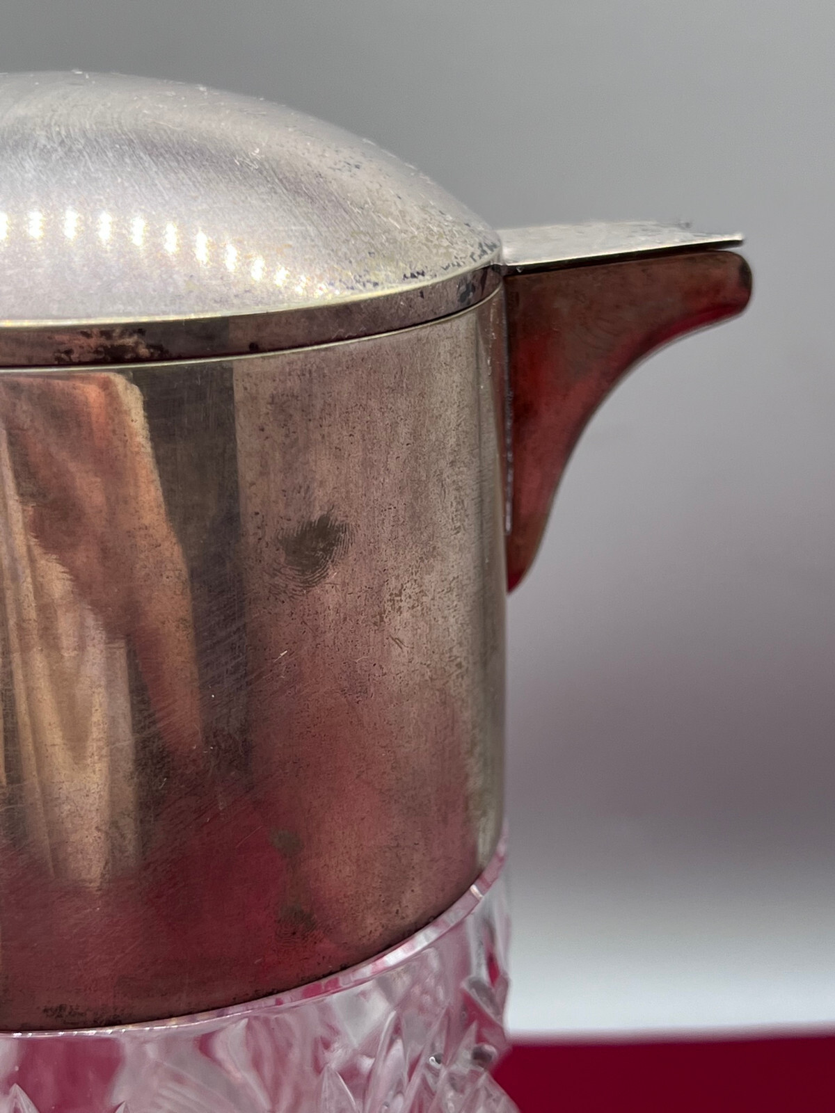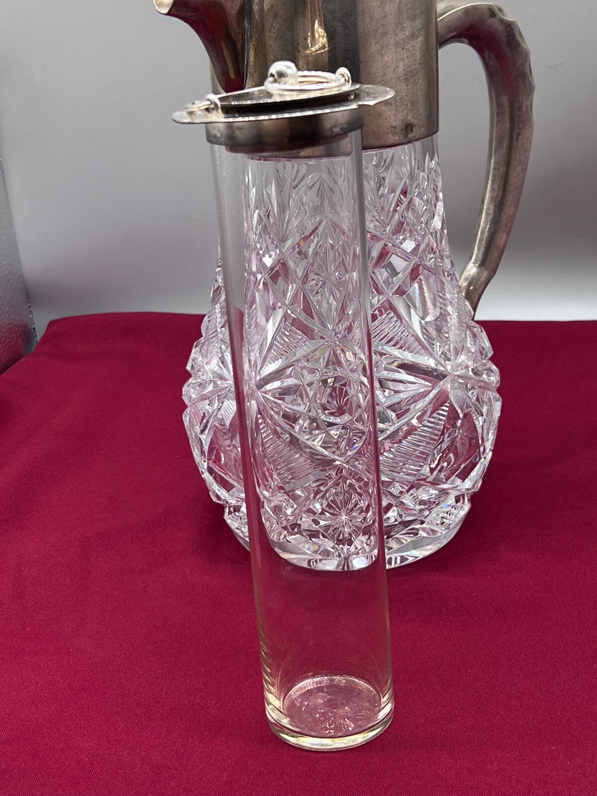 Sehr grosse Prunkkanne aus Kristallglas mit massiver Alpaca Montur, kalte Ente. Daumenrast am Deckel abgebrochen und fehlend, am Metall angelaufen und fleckig. Innen Zilynder zur Aufbewahrung von Eiswürfeln. Höhe / Durchmesser 31/16cm
