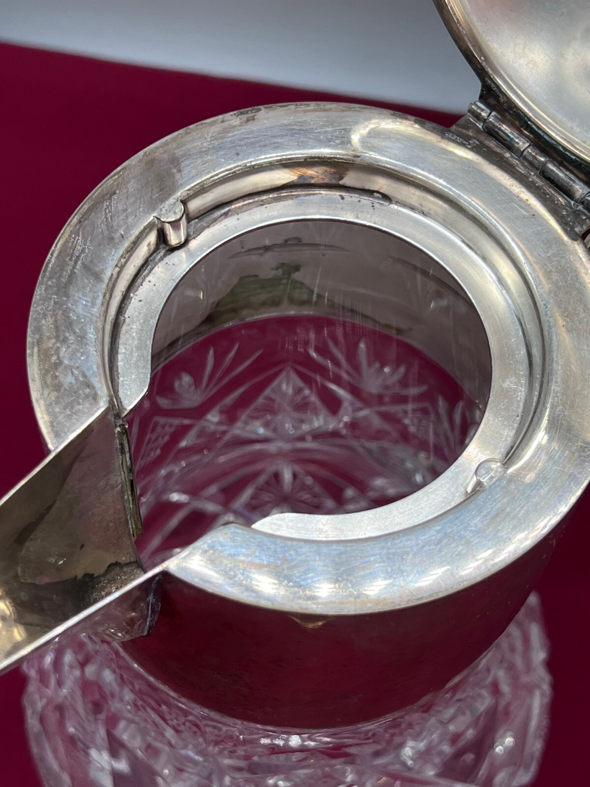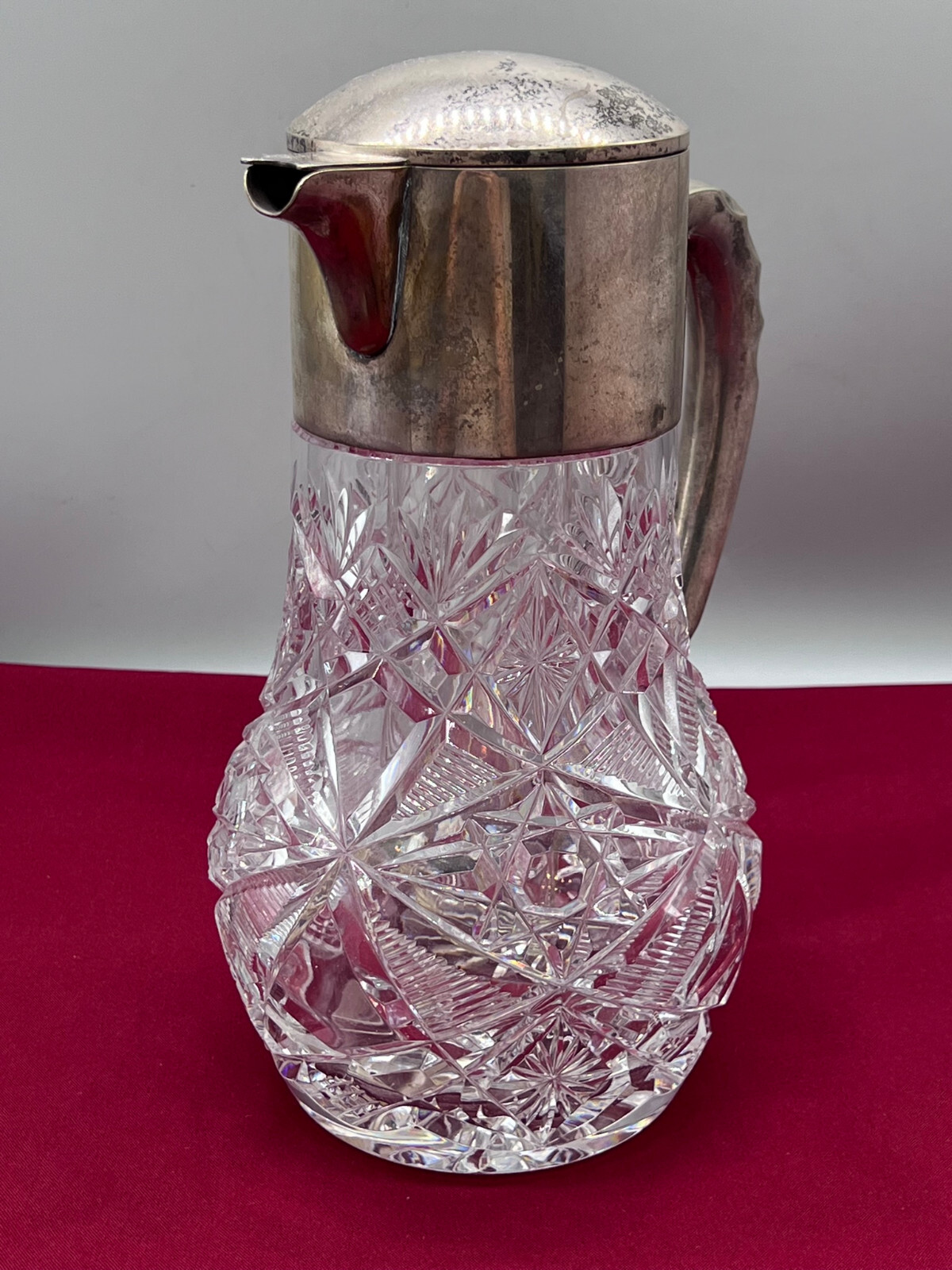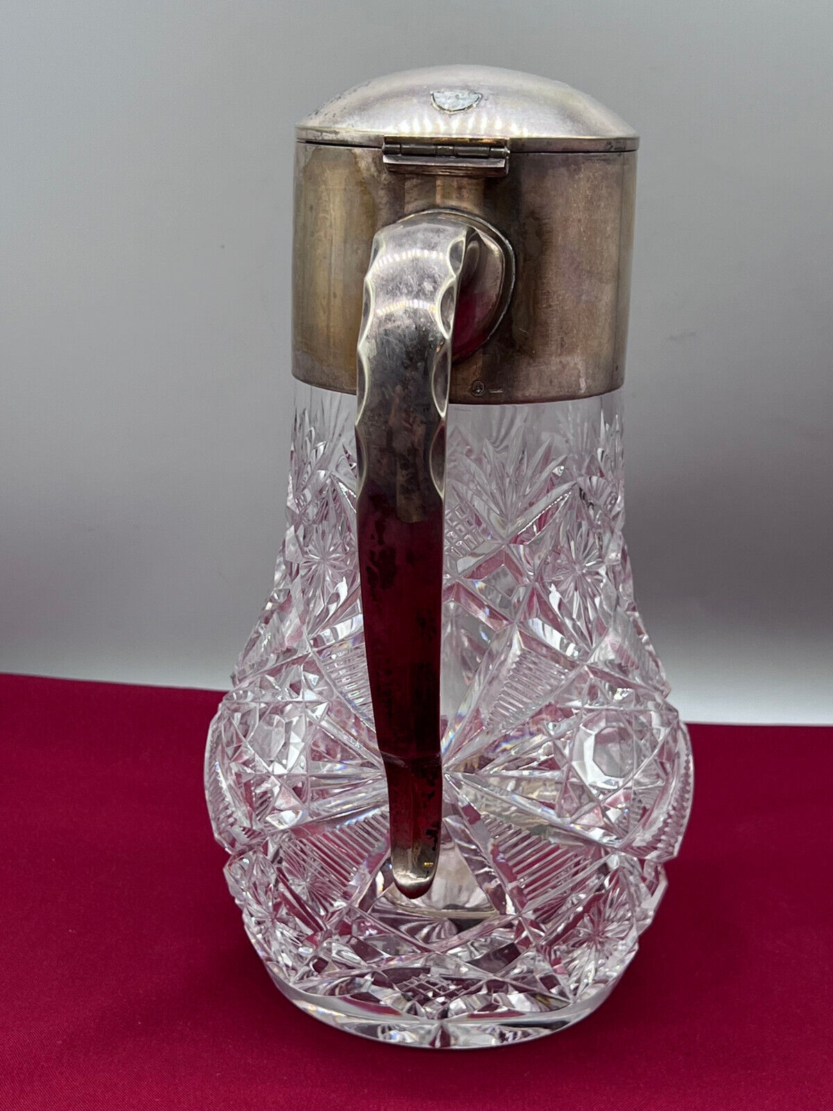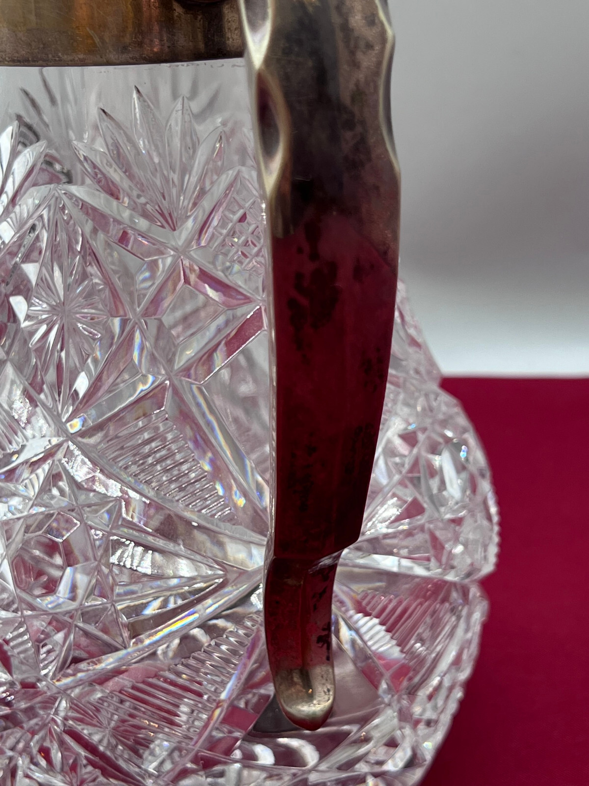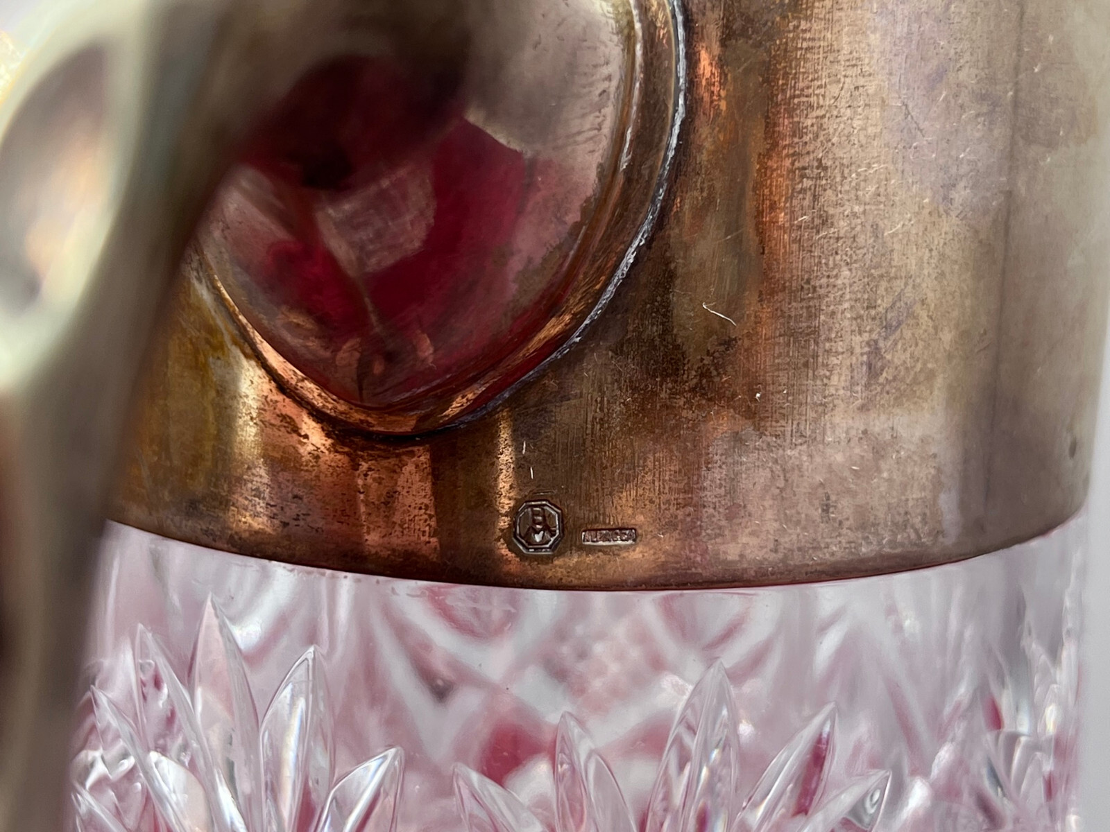 Sehr grosse Prunkkanne aus Kristallglas mit massiver Alpaca Montur, kalte Ente. Daumenrast am Deckel abgebrochen und fehlend, am Metall angelaufen und fleckig. Innen Zilynder zur Aufbewahrung von Eiswürfeln. Höhe / Durchmesser 31/16cm