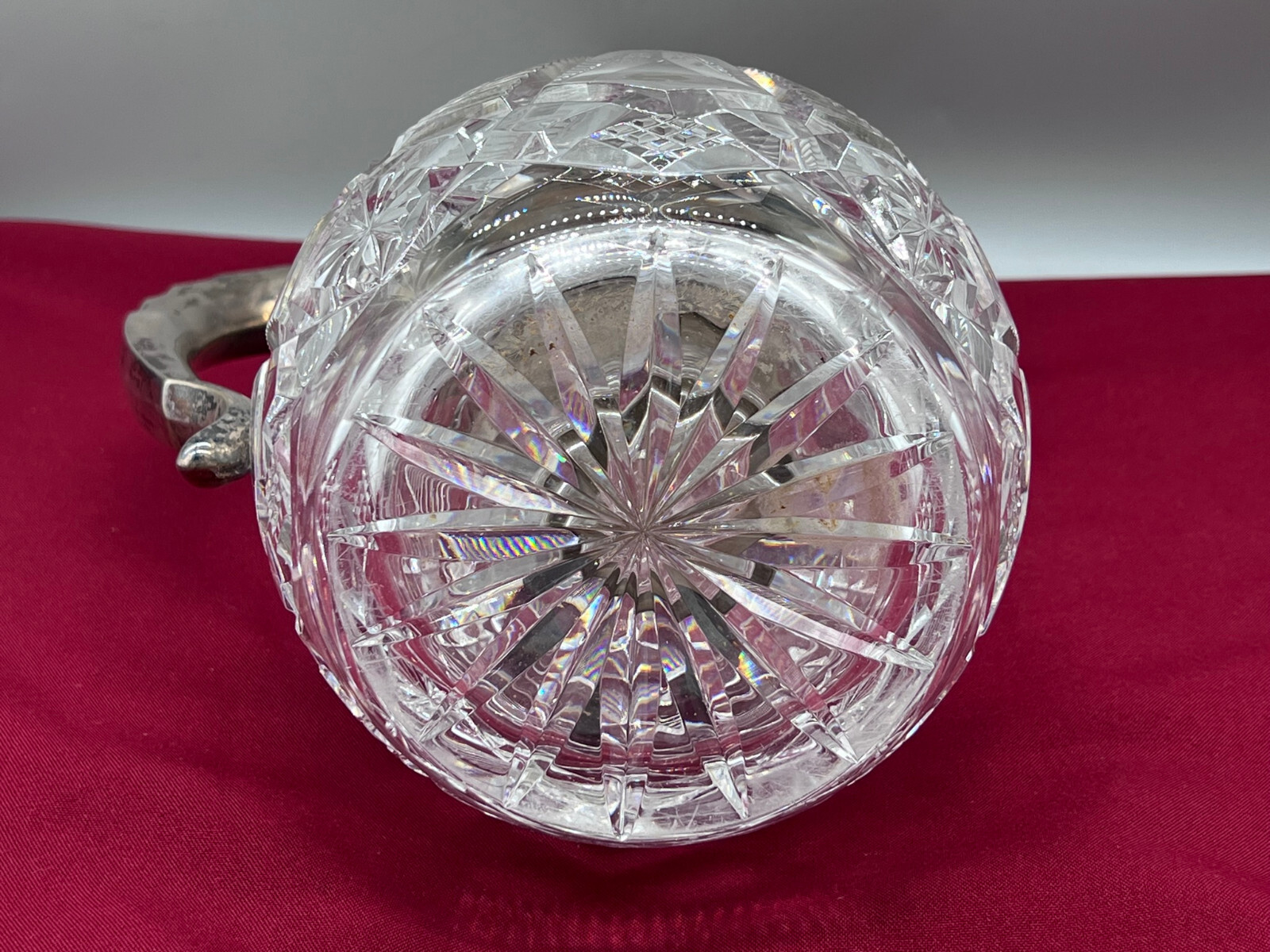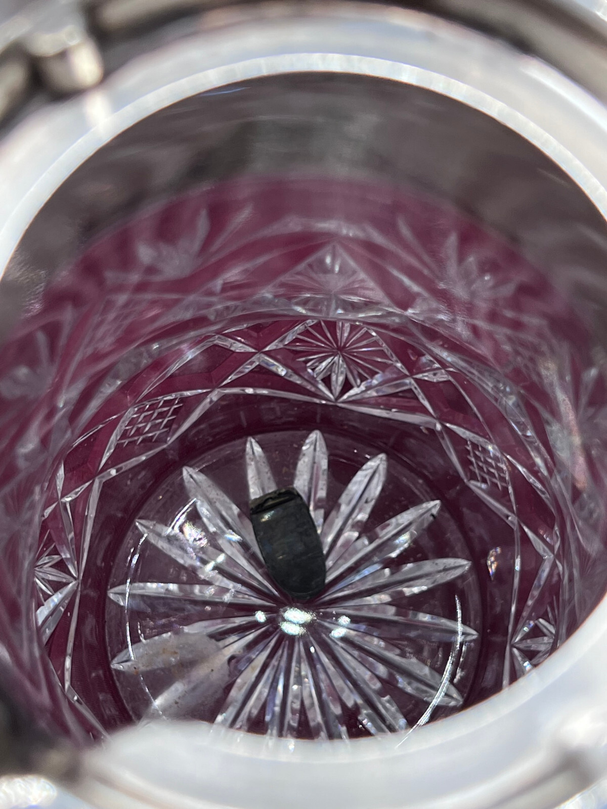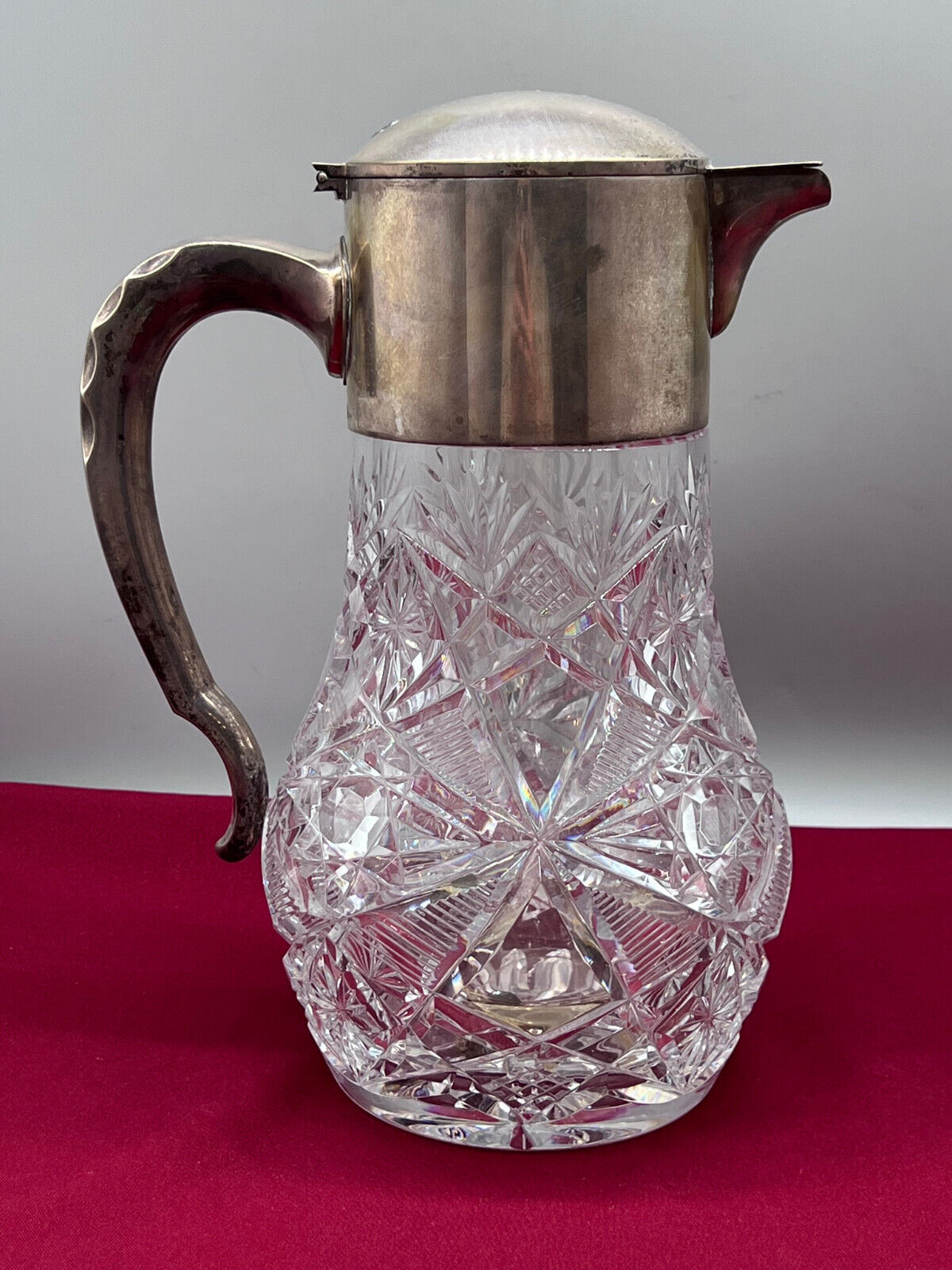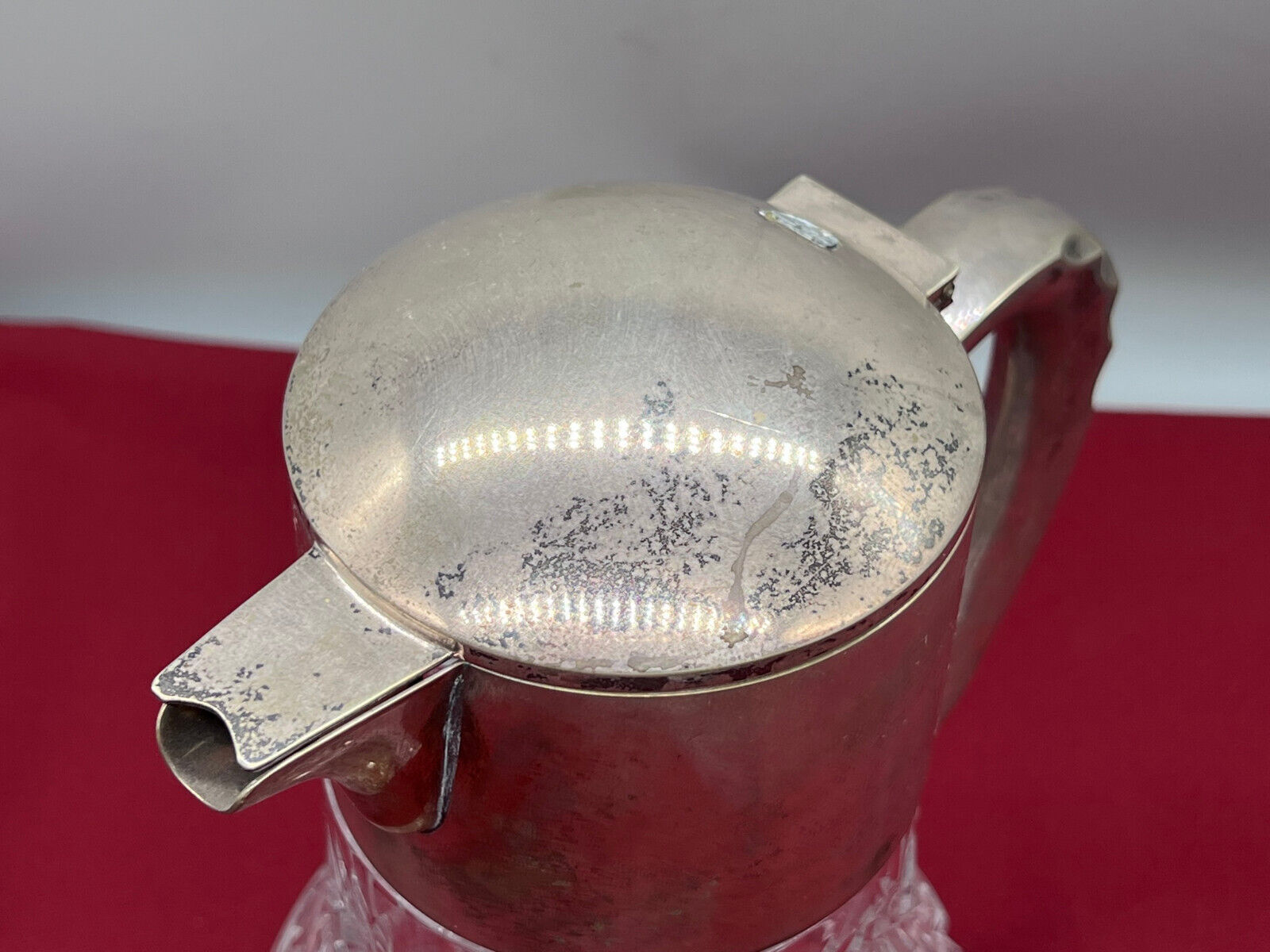 Sehr grosse Prunkkanne aus Kristallglas mit massiver Alpaca Montur, kalte Ente. Daumenrast am Deckel abgebrochen und fehlend, am Metall angelaufen und fleckig. Innen Zilynder zur Aufbewahrung von Eiswürfeln. Höhe / Durchmesser 31/16cm
