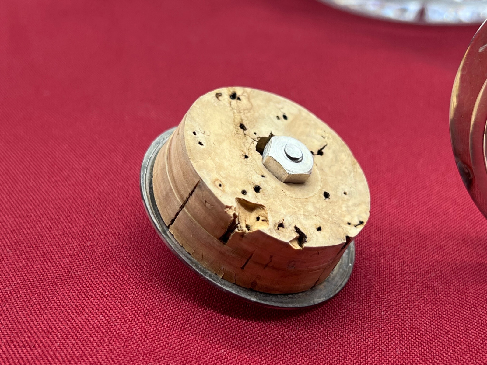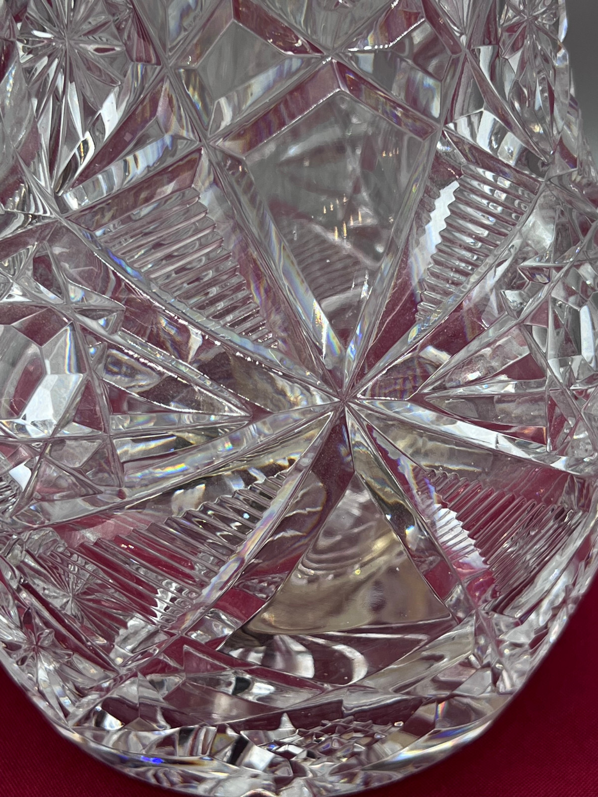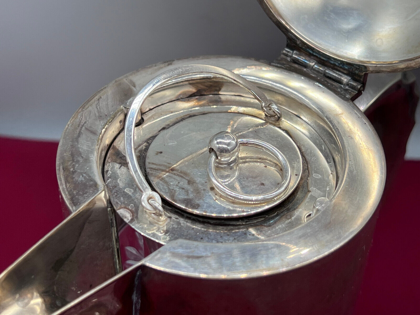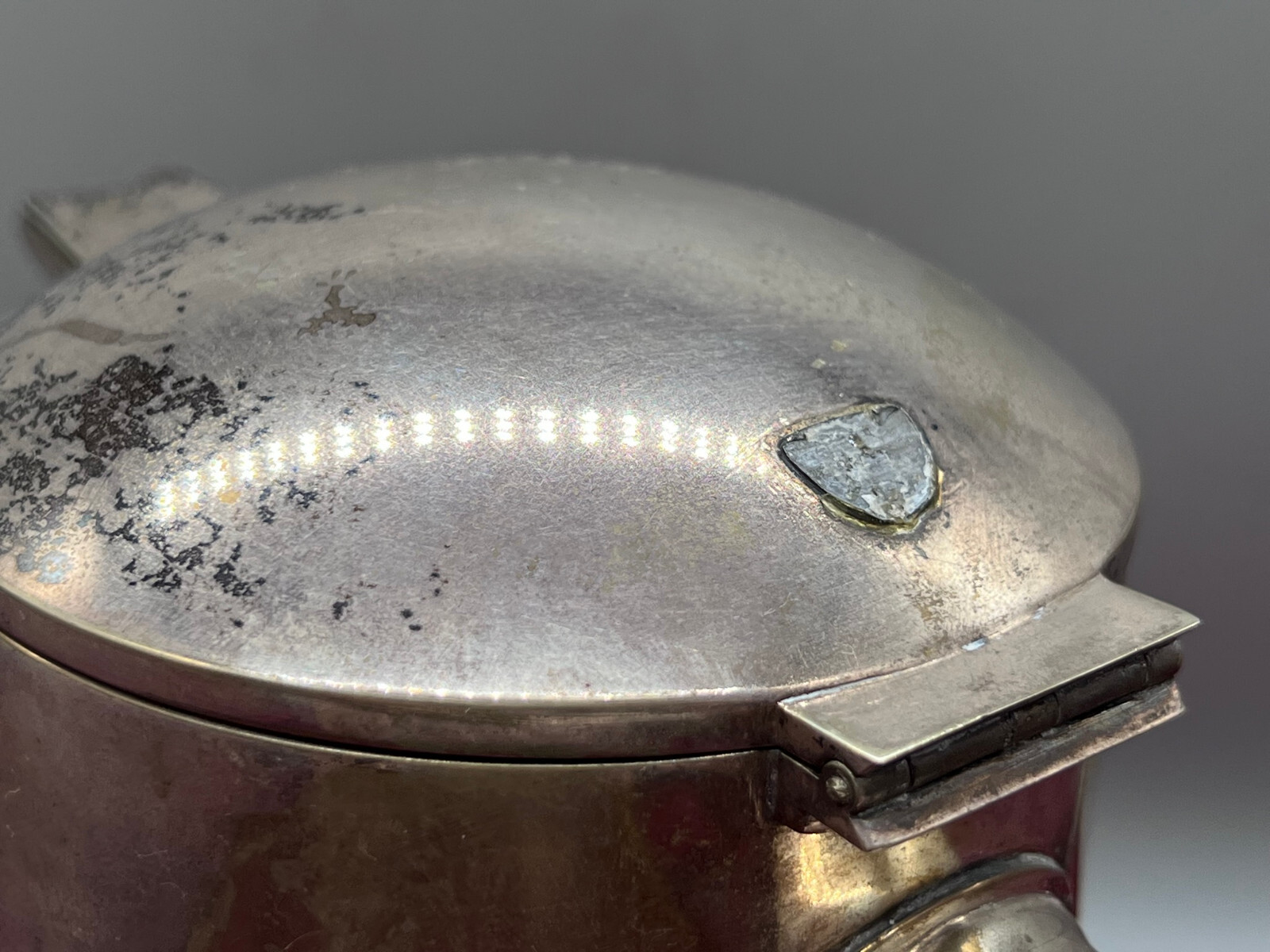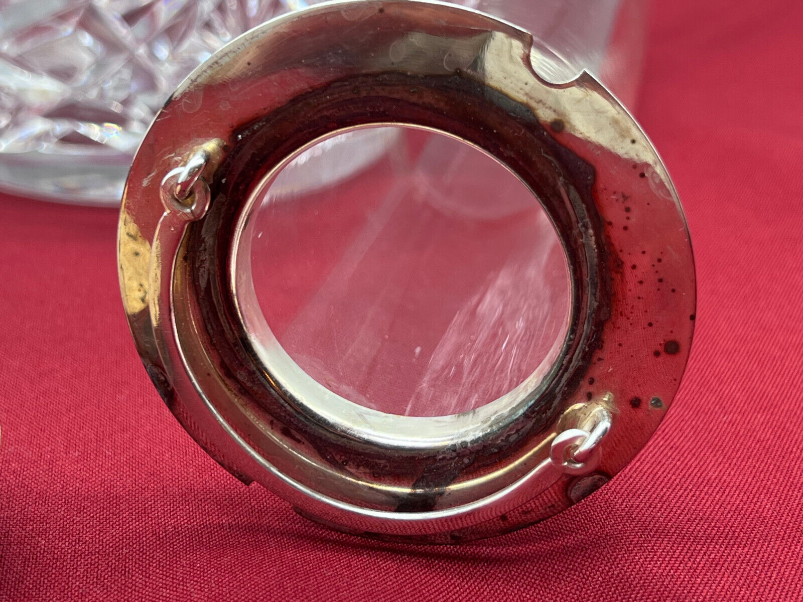 Sehr grosse Prunkkanne aus Kristallglas mit massiver Alpaca Montur, kalte Ente. Daumenrast am Deckel abgebrochen und fehlend, am Metall angelaufen und fleckig. Innen Zilynder zur Aufbewahrung von Eiswürfeln. Höhe / Durchmesser 31/16cm