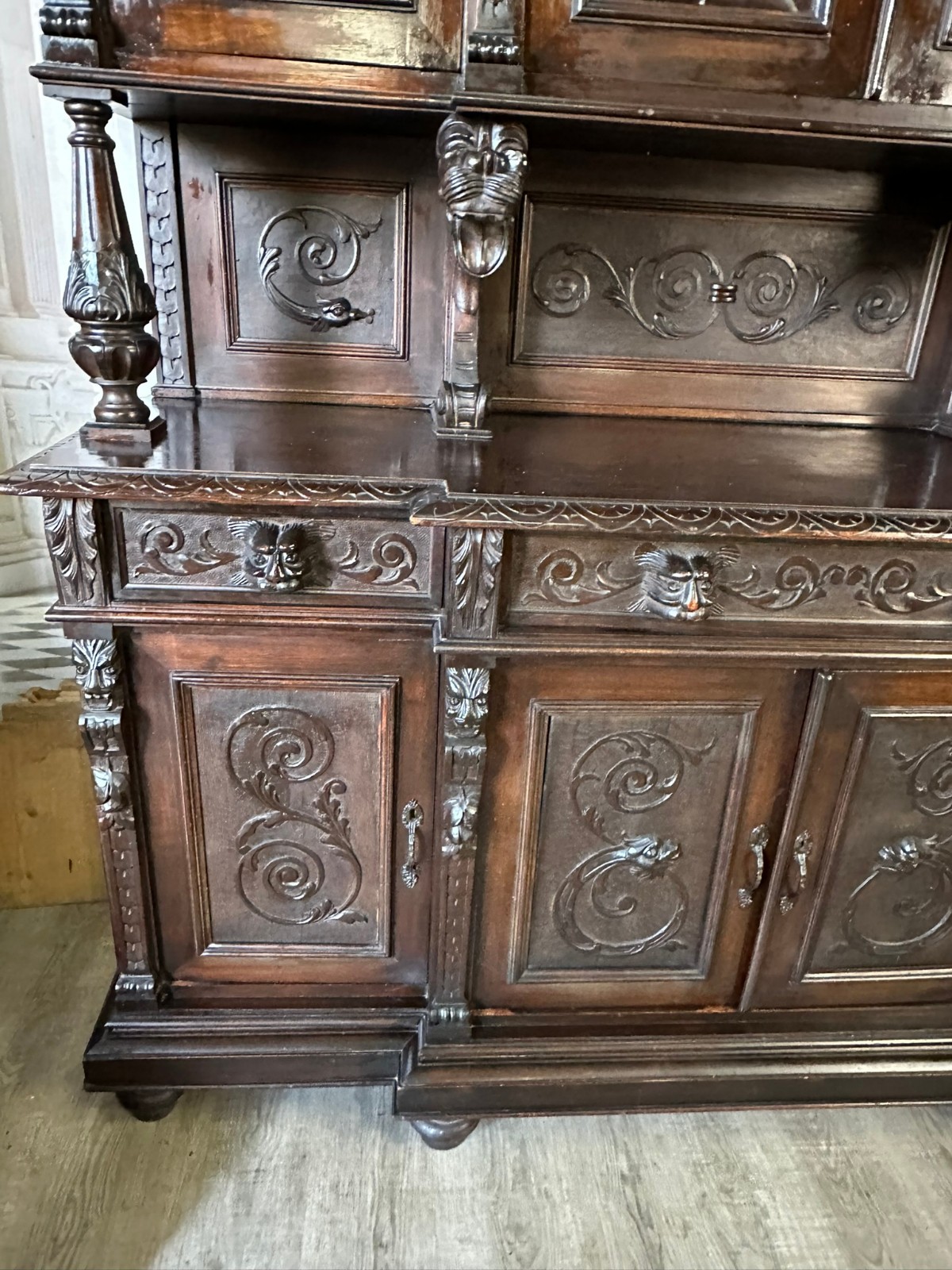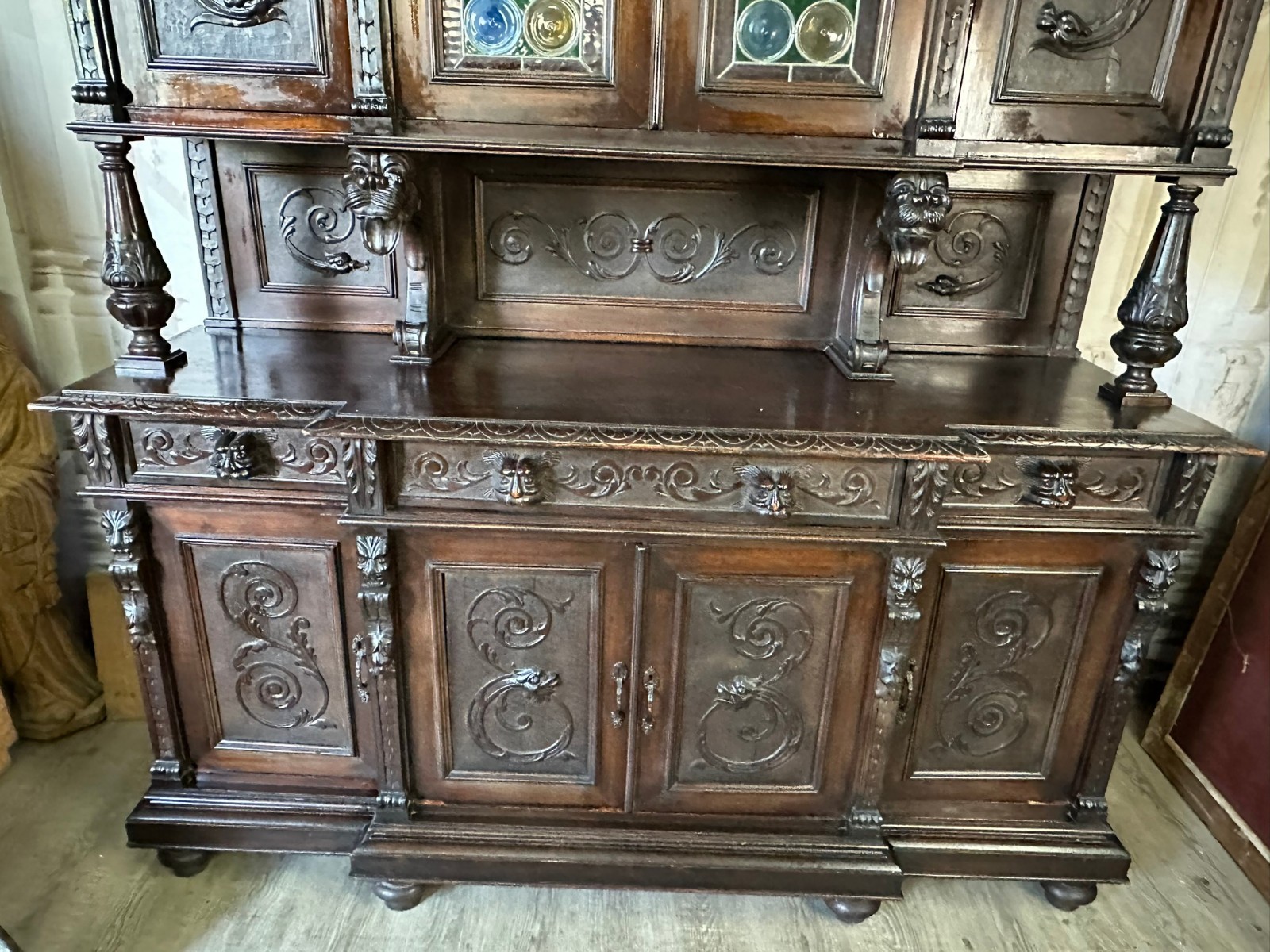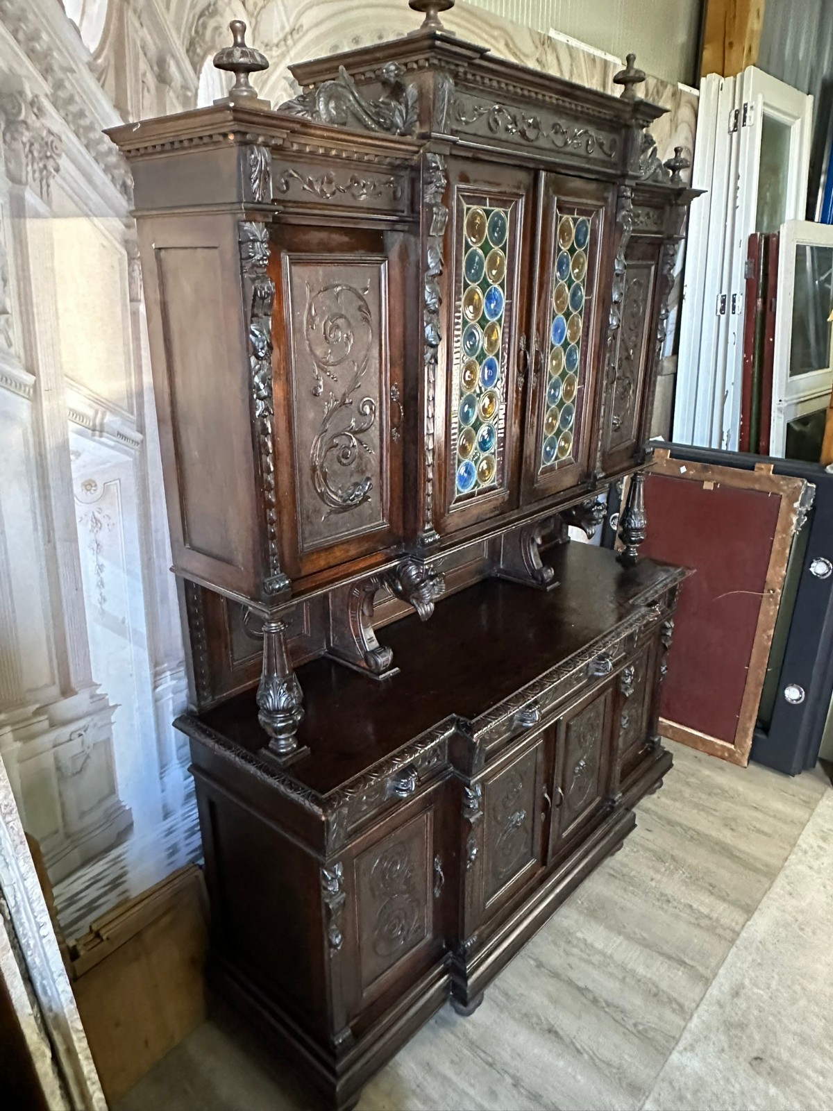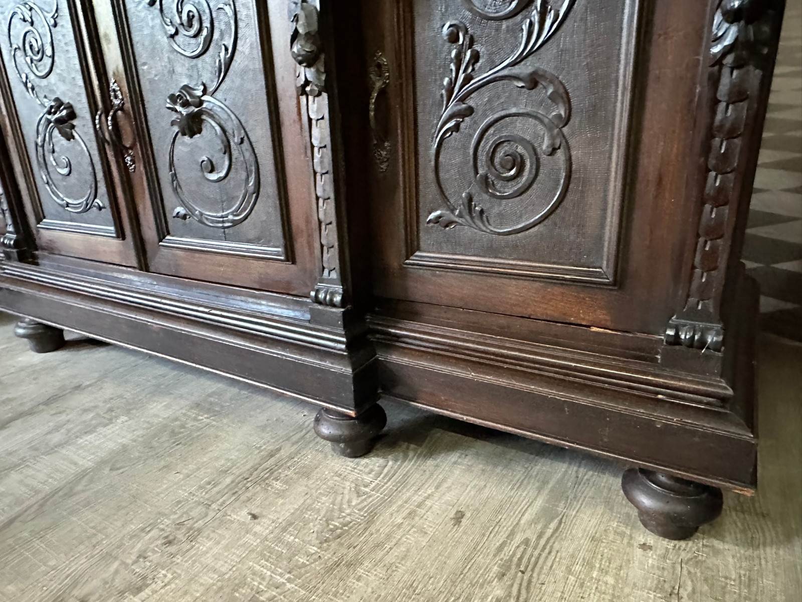 Sehr imposantes antikes Buffet, Neo Renaissance, Italien Ende 19tes Jhd. Das Möbel ist zweiteilig, aus Weichholz angefertigt, Nußbaum gebeizt. Am gesamten Möbel leichter inaktiver Wurmfraß, im Leistenbereich leicht berieben und bestossen, Kanten teils leicht unvollständig. Sehr wenige kleinere Leisten oder die viereckigen Dekorelemente fehlend. Das Möbel hat insegsamt keine inneren Ablagebretter. Die mittlere Ablage zum Teil zerkratzt, Druckstellen und kleinere Furnierfehlstellen. Oben mittig die Rückwand zum Teil eingedrückt. Die Türen können normal bedient werden, sind minimal schwergängig. Oben mittig am Kranz befand sich ursprünglich eine Applike, diese ist nicht mehr vorhanden. Diverse Schlüssel vorhanden, alle Schlösser funktionsfähig. Die untere mittlere rechte Tür leicht in sich verzogen und muss beim Schließen manuell gedrückt werden. Abmessungen BTH 189x60x264cm, ohne Zapfen 248cm. Verglasung an der linken Tür mit kleineren Schäden.