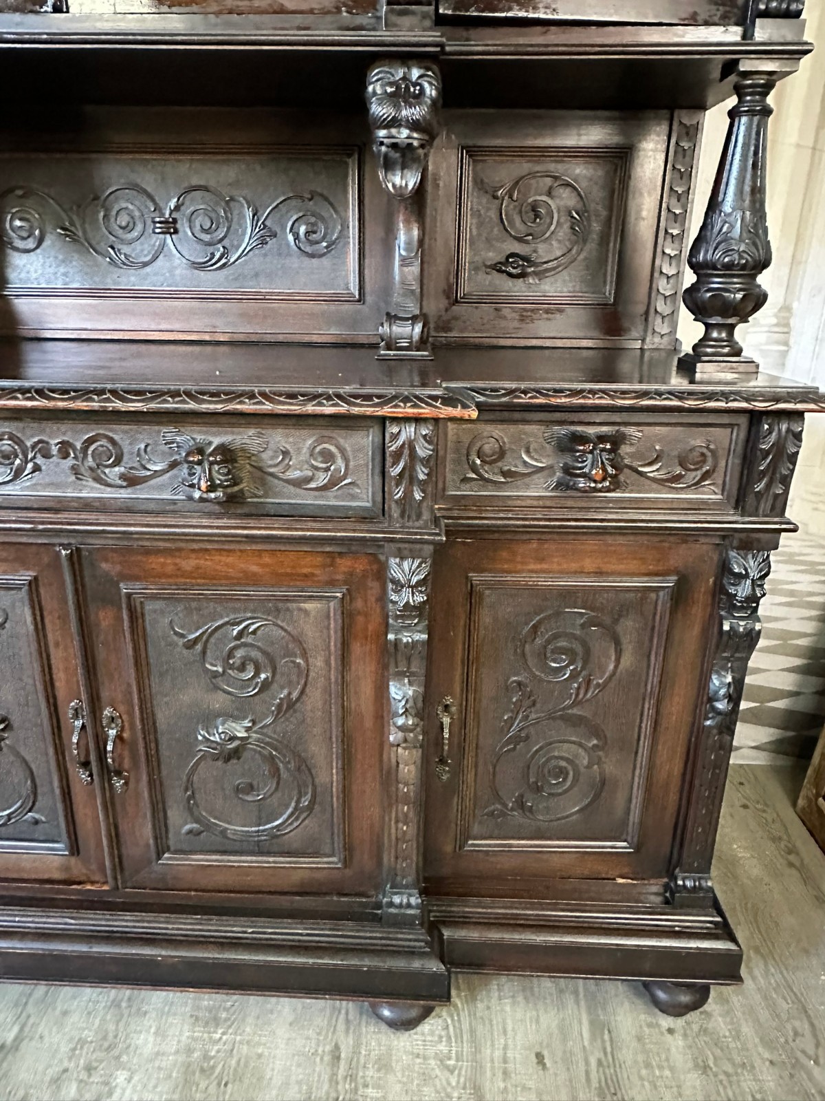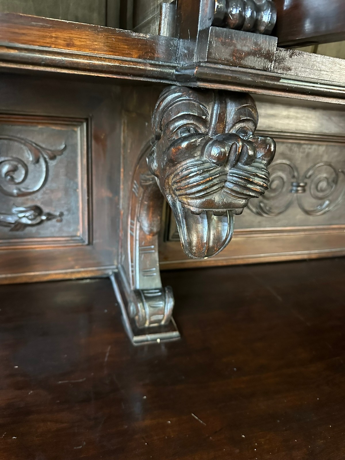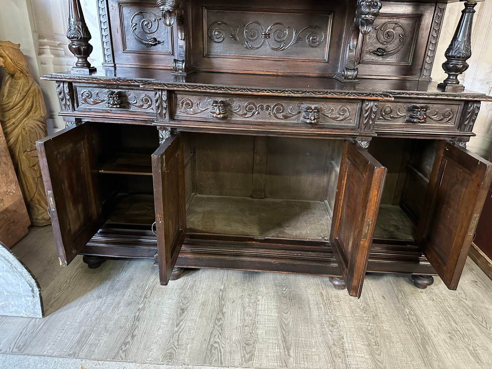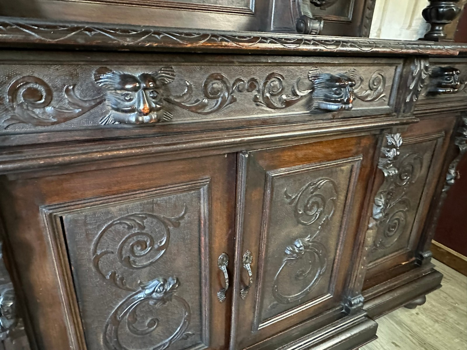 Sehr imposantes antikes Buffet, Neo Renaissance, Italien Ende 19tes Jhd. Das Möbel ist zweiteilig, aus Weichholz angefertigt, Nußbaum gebeizt. Am gesamten Möbel leichter inaktiver Wurmfraß, im Leistenbereich leicht berieben und bestossen, Kanten teils leicht unvollständig. Sehr wenige kleinere Leisten oder die viereckigen Dekorelemente fehlend. Das Möbel hat insegsamt keine inneren Ablagebretter. Die mittlere Ablage zum Teil zerkratzt, Druckstellen und kleinere Furnierfehlstellen. Oben mittig die Rückwand zum Teil eingedrückt. Die Türen können normal bedient werden, sind minimal schwergängig. Oben mittig am Kranz befand sich ursprünglich eine Applike, diese ist nicht mehr vorhanden. Diverse Schlüssel vorhanden, alle Schlösser funktionsfähig. Die untere mittlere rechte Tür leicht in sich verzogen und muss beim Schließen manuell gedrückt werden. Abmessungen BTH 189x60x264cm, ohne Zapfen 248cm. Verglasung an der linken Tür mit kleineren Schäden.