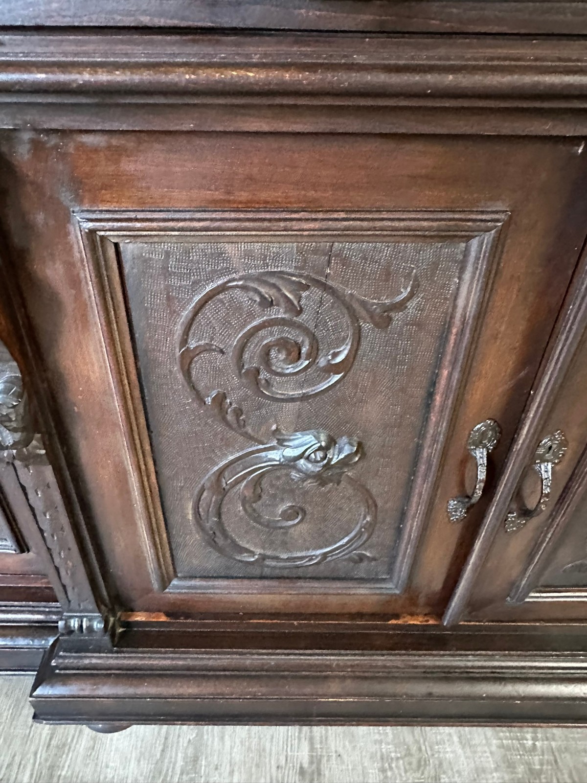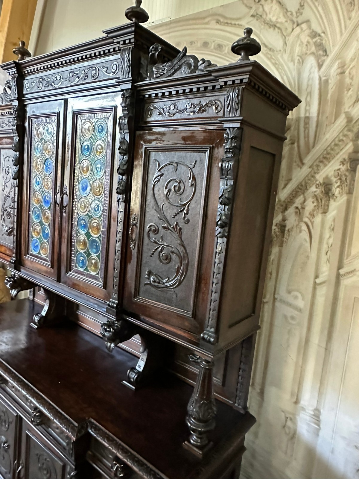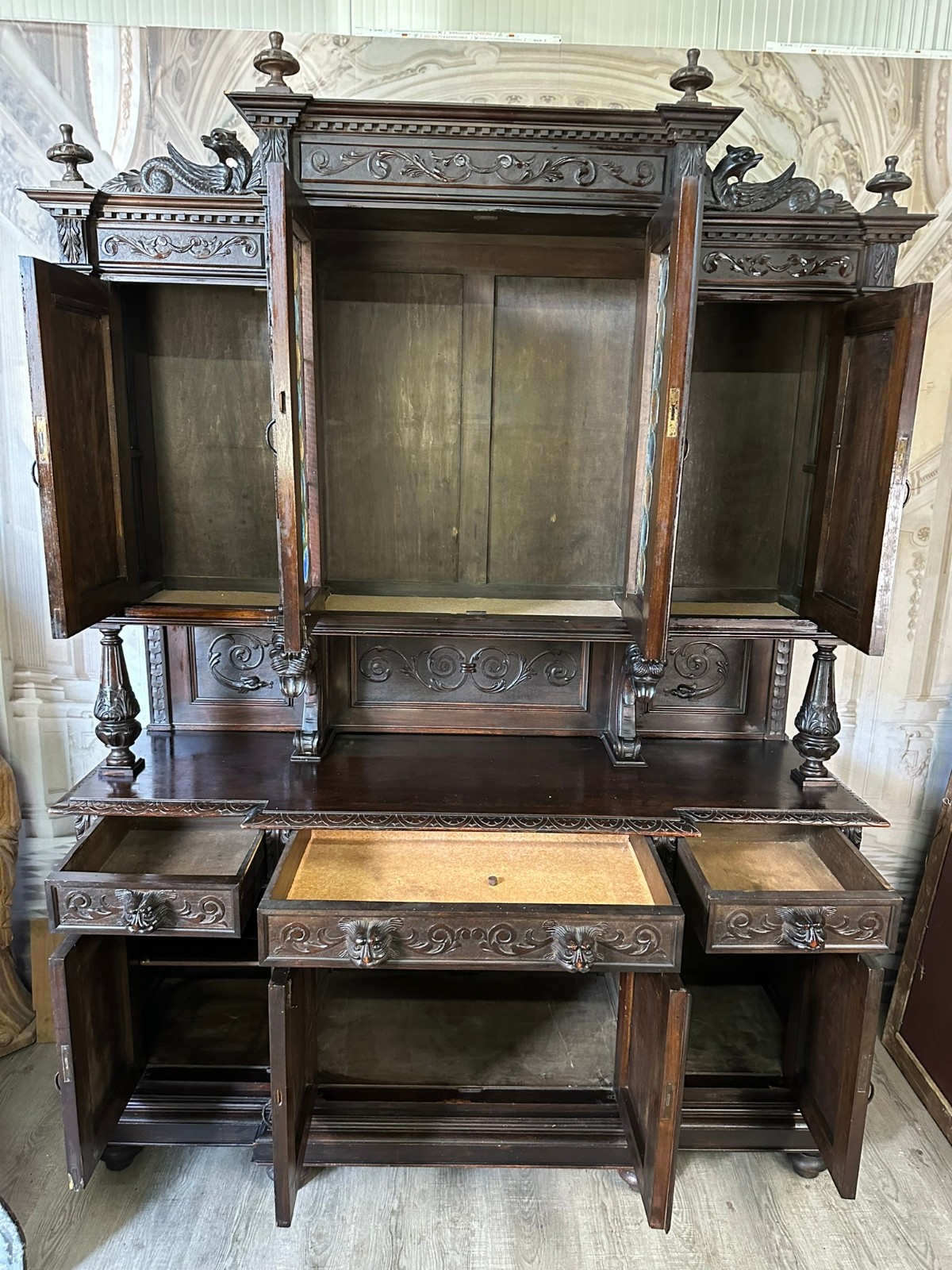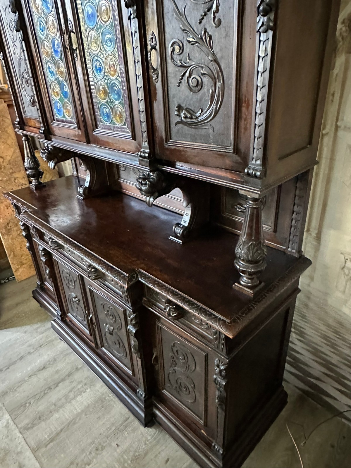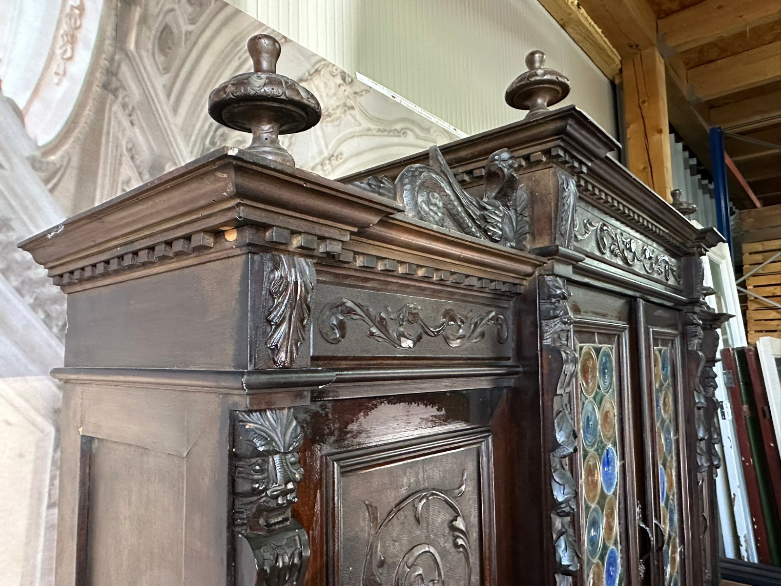Sehr imposantes antikes Buffet, Neo Renaissance, Italien Ende 19tes Jhd. Das Möbel ist zweiteilig, aus Weichholz angefertigt, Nußbaum gebeizt. Am gesamten Möbel leichter inaktiver Wurmfraß, im Leistenbereich leicht berieben und bestossen, Kanten teils leicht unvollständig. Sehr wenige kleinere Leisten oder die viereckigen Dekorelemente fehlend. Das Möbel hat insegsamt keine inneren Ablagebretter. Die mittlere Ablage zum Teil zerkratzt, Druckstellen und kleinere Furnierfehlstellen. Oben mittig die Rückwand zum Teil eingedrückt. Die Türen können normal bedient werden, sind minimal schwergängig. Oben mittig am Kranz befand sich ursprünglich eine Applike, diese ist nicht mehr vorhanden. Diverse Schlüssel vorhanden, alle Schlösser funktionsfähig. Die untere mittlere rechte Tür leicht in sich verzogen und muss beim Schließen manuell gedrückt werden. Abmessungen BTH 189x60x264cm, ohne Zapfen 248cm. Verglasung an der linken Tür mit kleineren Schäden.
