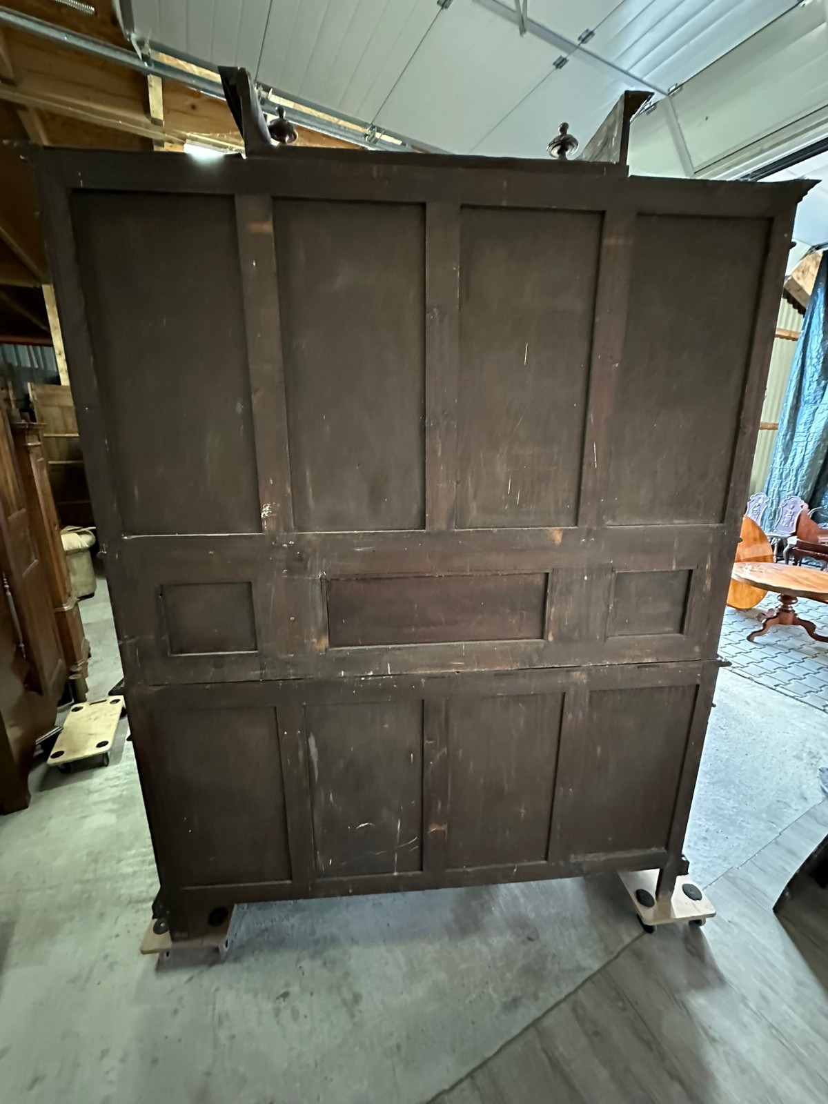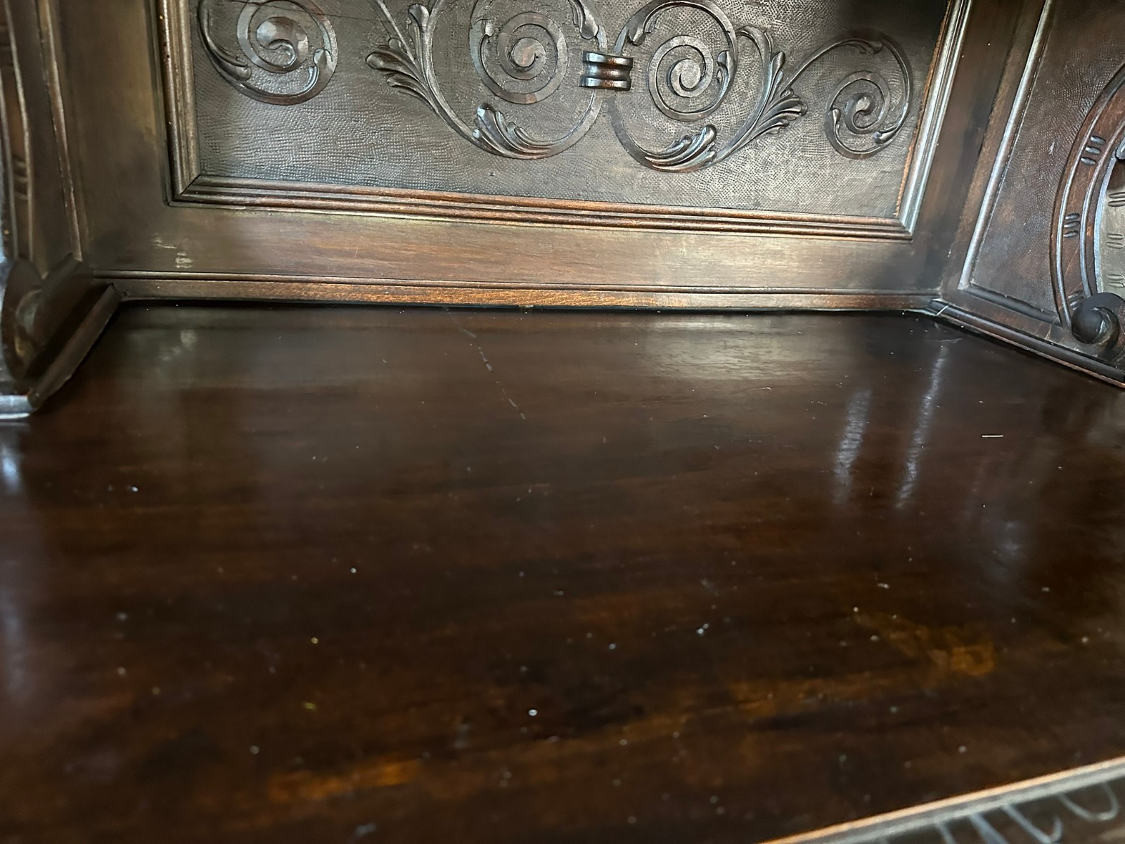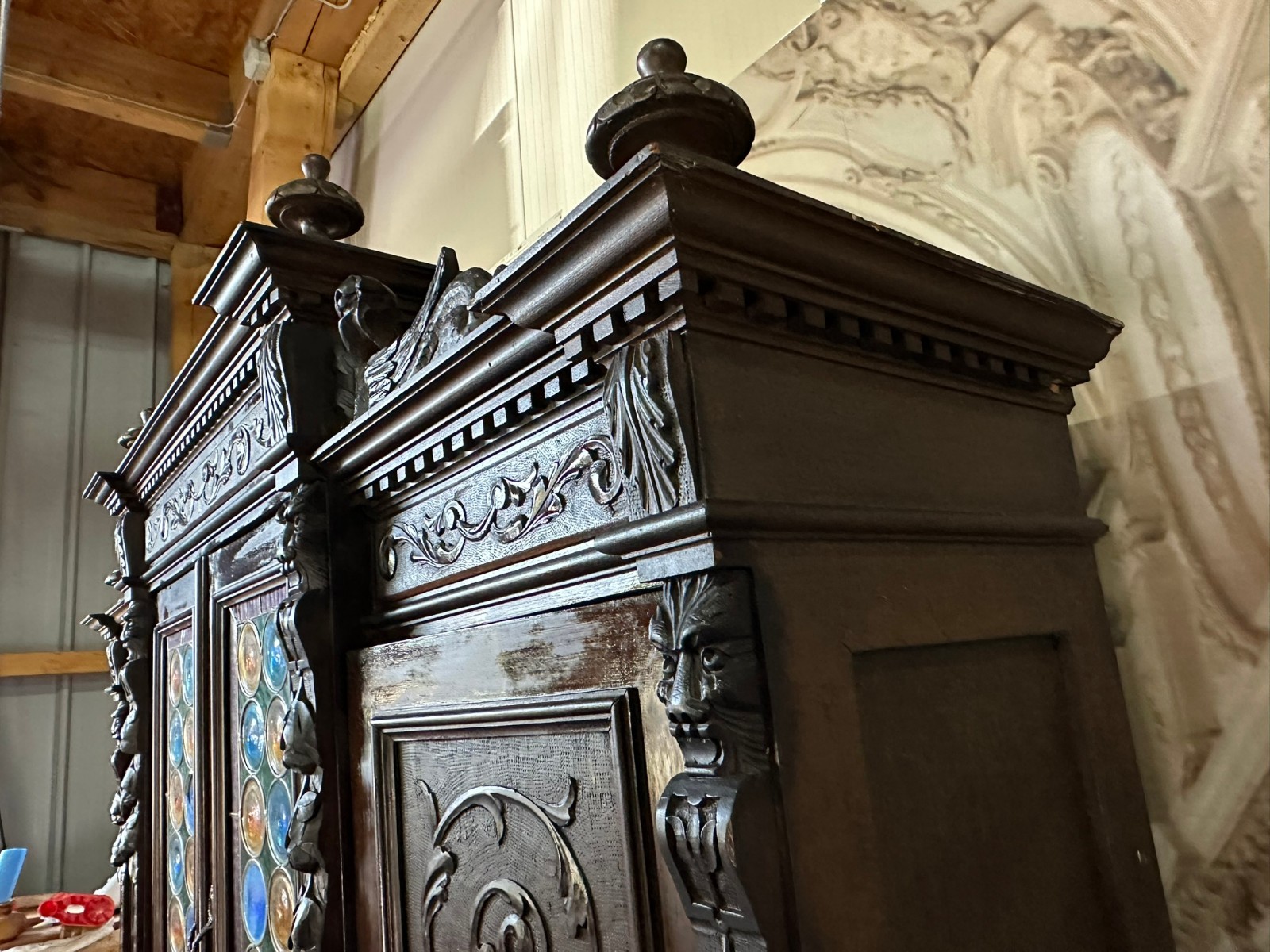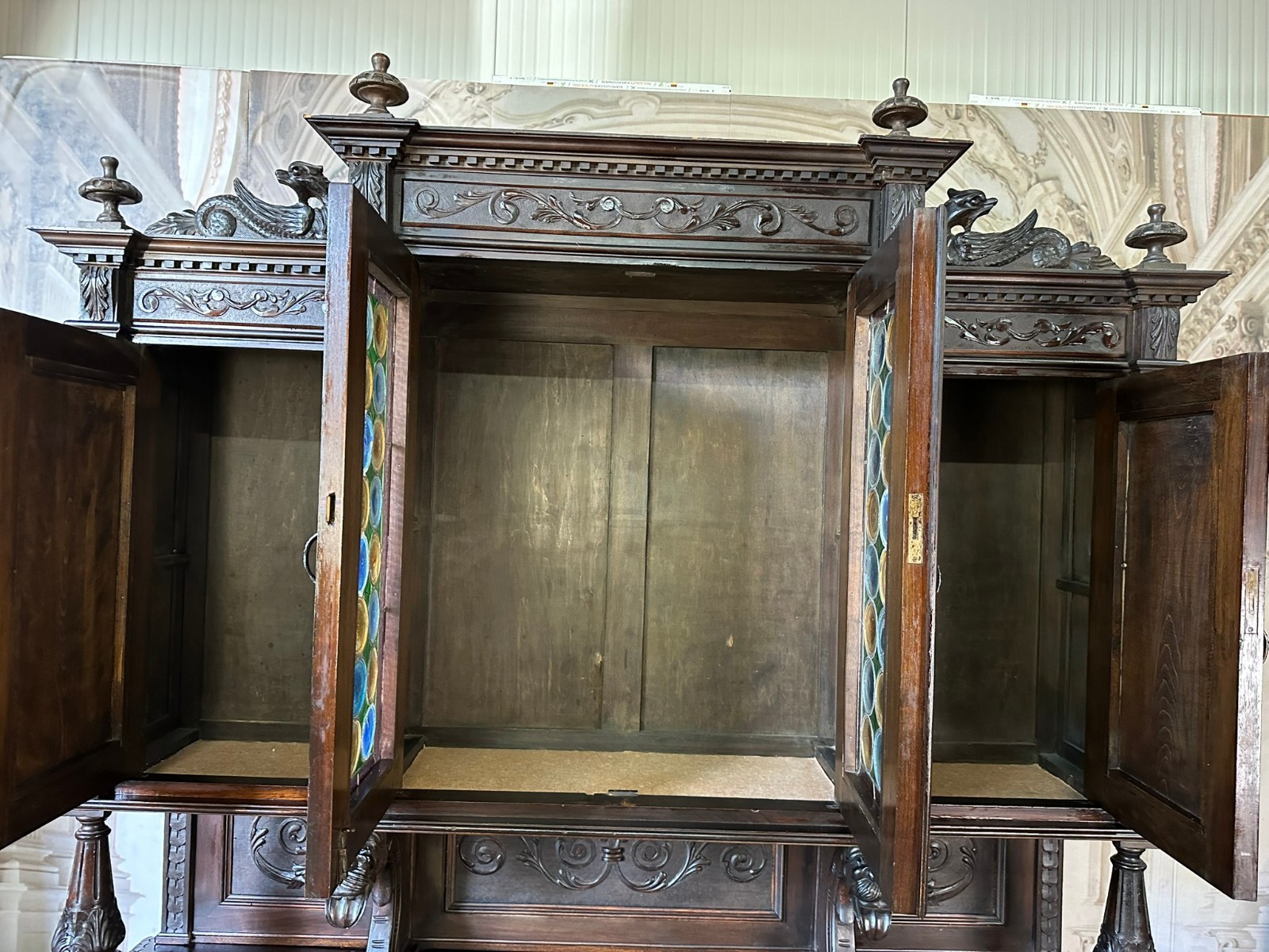 Sehr imposantes antikes Buffet, Neo Renaissance, Italien Ende 19tes Jhd. Das Möbel ist zweiteilig, aus Weichholz angefertigt, Nußbaum gebeizt. Am gesamten Möbel leichter inaktiver Wurmfraß, im Leistenbereich leicht berieben und bestossen, Kanten teils leicht unvollständig. Sehr wenige kleinere Leisten oder die viereckigen Dekorelemente fehlend. Das Möbel hat insegsamt keine inneren Ablagebretter. Die mittlere Ablage zum Teil zerkratzt, Druckstellen und kleinere Furnierfehlstellen. Oben mittig die Rückwand zum Teil eingedrückt. Die Türen können normal bedient werden, sind minimal schwergängig. Oben mittig am Kranz befand sich ursprünglich eine Applike, diese ist nicht mehr vorhanden. Diverse Schlüssel vorhanden, alle Schlösser funktionsfähig. Die untere mittlere rechte Tür leicht in sich verzogen und muss beim Schließen manuell gedrückt werden. Abmessungen BTH 189x60x264cm, ohne Zapfen 248cm. Verglasung an der linken Tür mit kleineren Schäden.