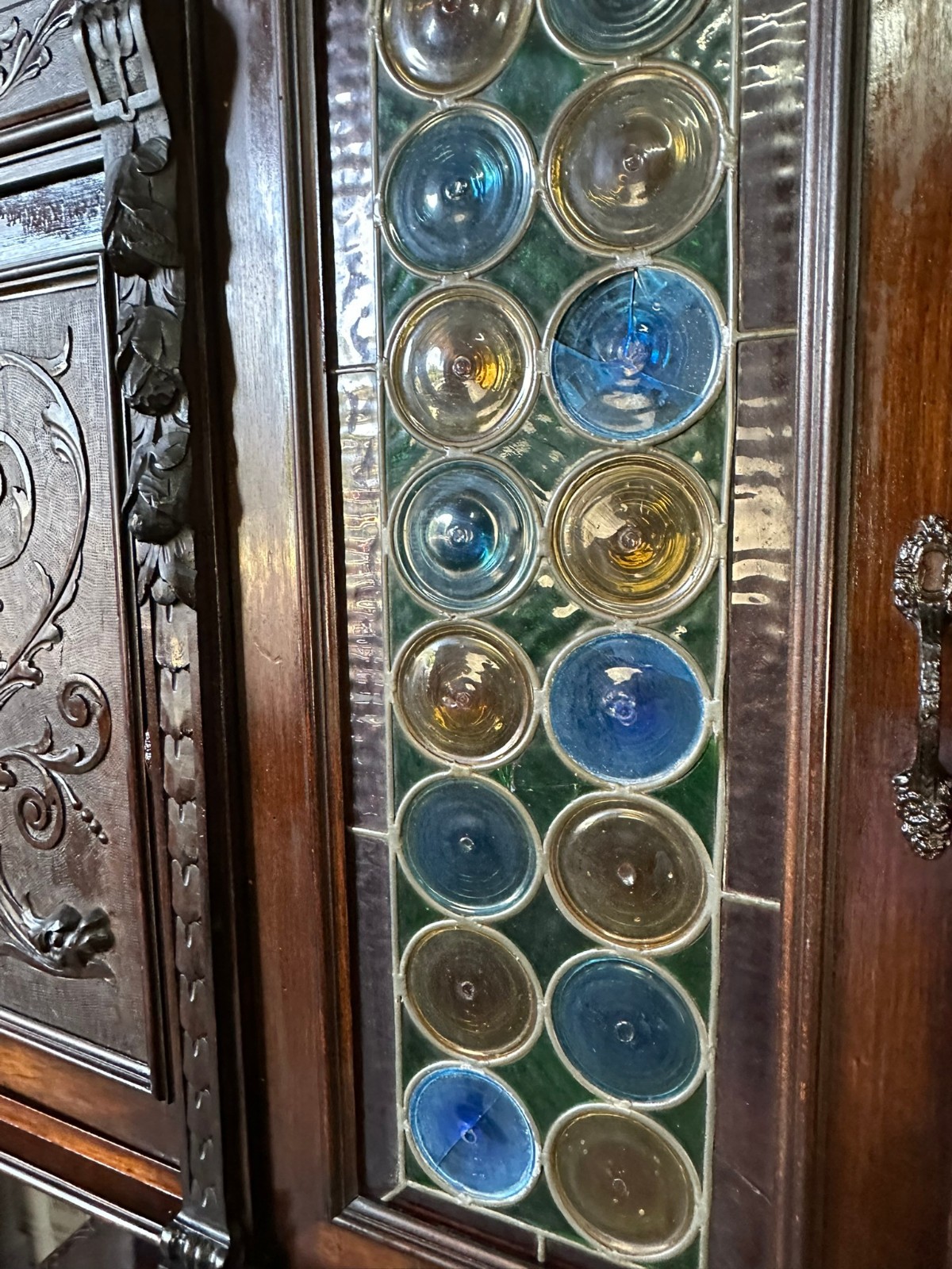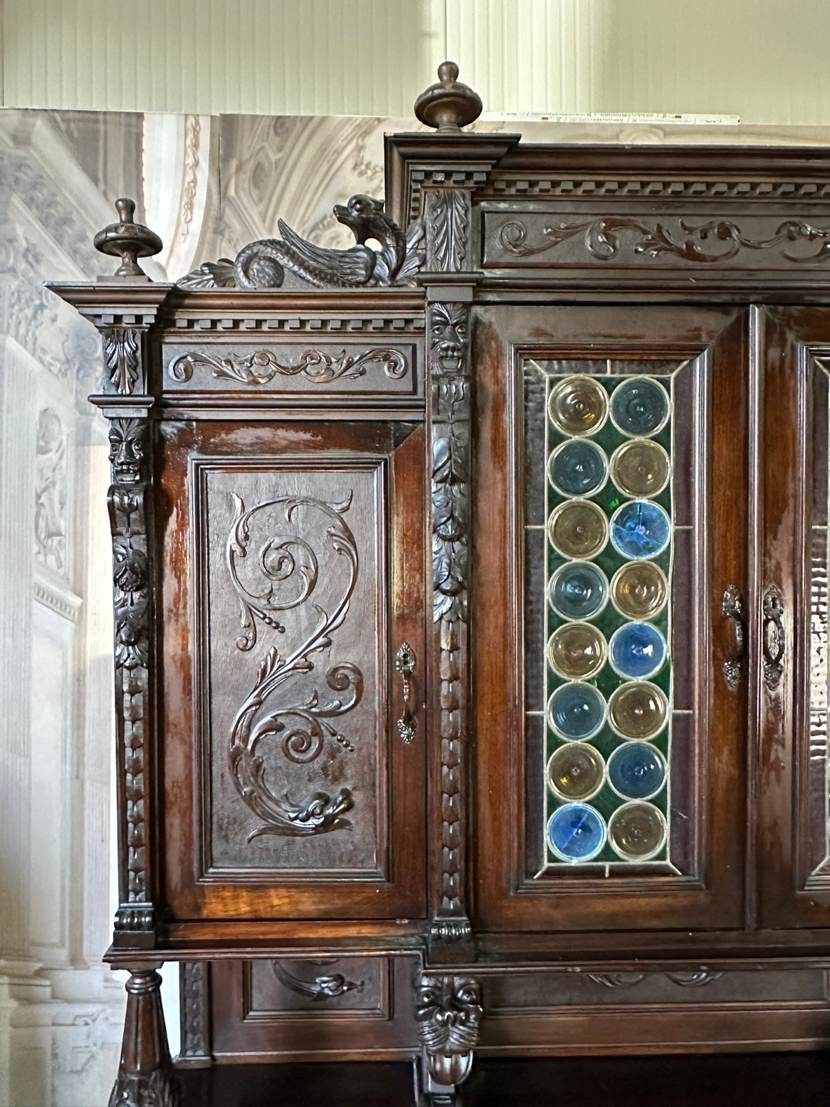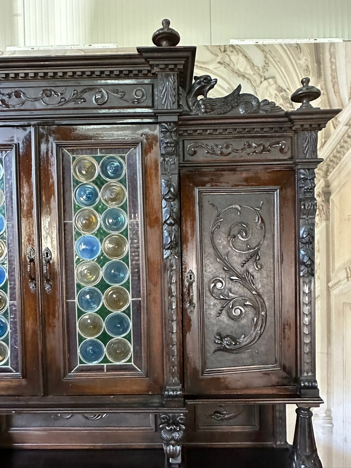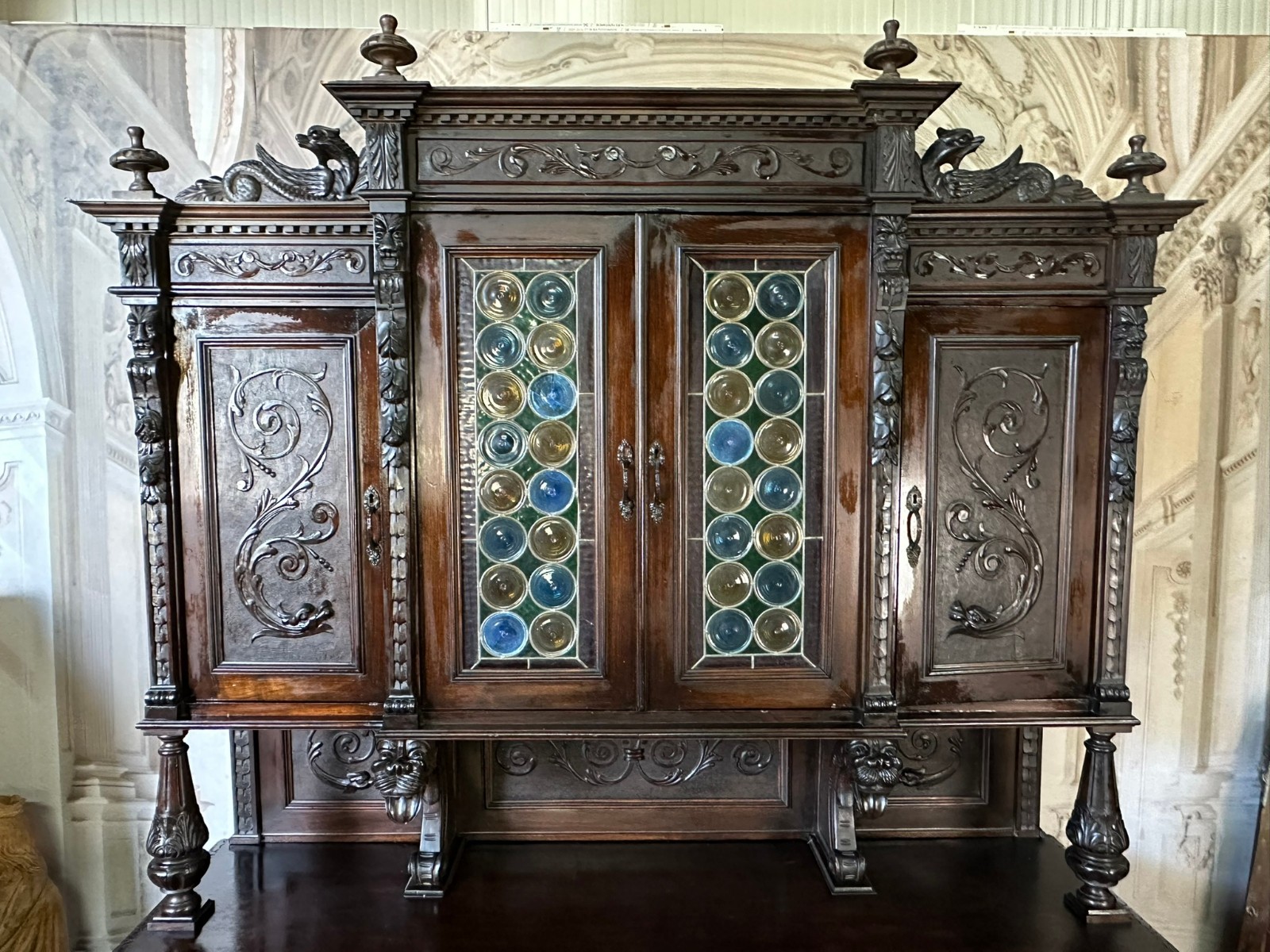 Sehr imposantes antikes Buffet, Neo Renaissance, Italien Ende 19tes Jhd. Das Möbel ist zweiteilig, aus Weichholz angefertigt, Nußbaum gebeizt. Am gesamten Möbel leichter inaktiver Wurmfraß, im Leistenbereich leicht berieben und bestossen, Kanten teils leicht unvollständig. Sehr wenige kleinere Leisten oder die viereckigen Dekorelemente fehlend. Das Möbel hat insegsamt keine inneren Ablagebretter. Die mittlere Ablage zum Teil zerkratzt, Druckstellen und kleinere Furnierfehlstellen. Oben mittig die Rückwand zum Teil eingedrückt. Die Türen können normal bedient werden, sind minimal schwergängig. Oben mittig am Kranz befand sich ursprünglich eine Applike, diese ist nicht mehr vorhanden. Diverse Schlüssel vorhanden, alle Schlösser funktionsfähig. Die untere mittlere rechte Tür leicht in sich verzogen und muss beim Schließen manuell gedrückt werden. Abmessungen BTH 189x60x264cm, ohne Zapfen 248cm. Verglasung an der linken Tür mit kleineren Schäden.