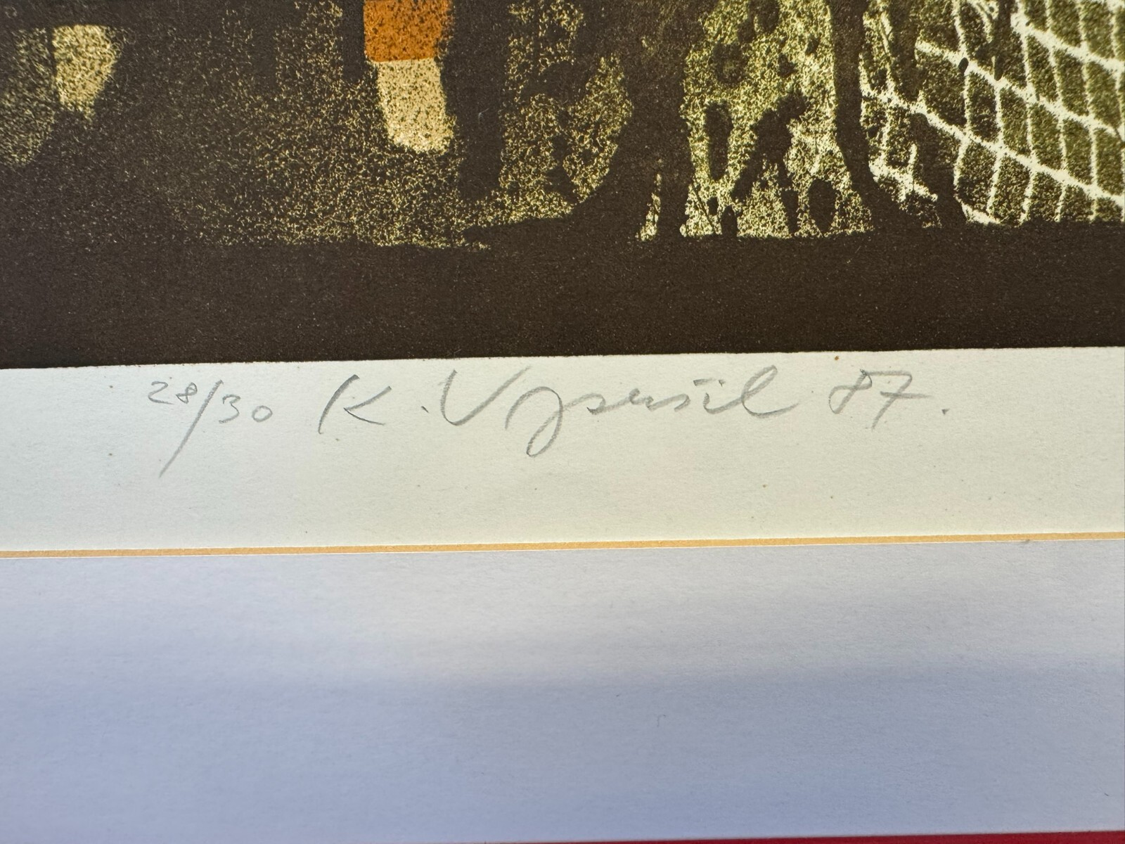 Farblithographie auf Papier mit Bleistift signiert, datiert und nummeriert, ohne Glas, am Passepartout leichte Flecken und Druckstellen, der Rahmen zum Teil berieben, Abmessungen sichtbar: 52x70cm, gesamt: 64x82cm.