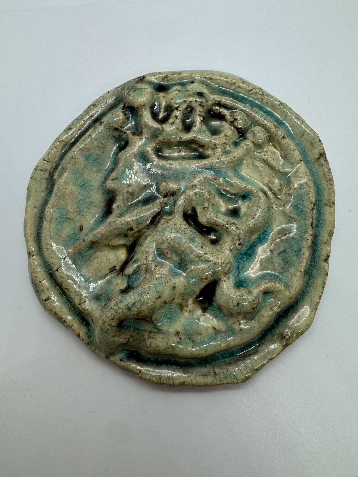 Gebrannte, lasierte und runde Keramik Fliese von Christian Peschke. Krakelee in der Oberfläche, ohne Signatur. Durchmesser: 9cm.
