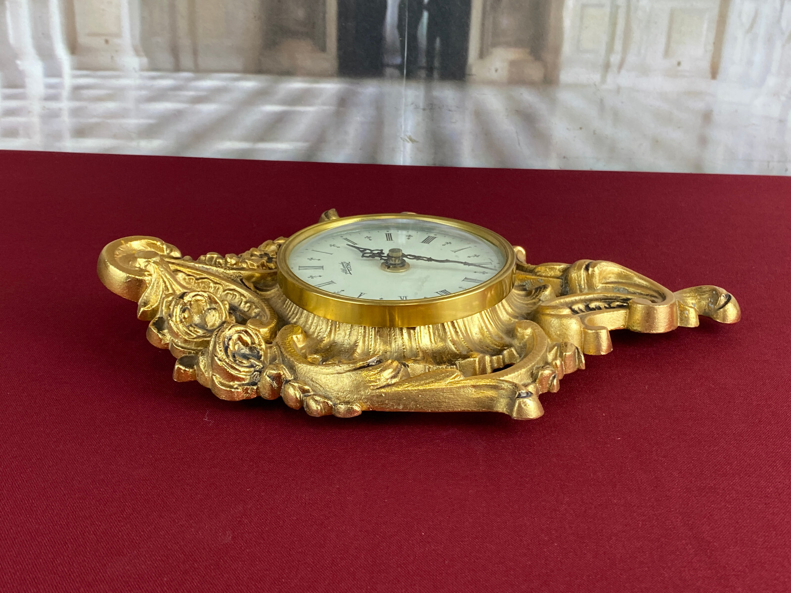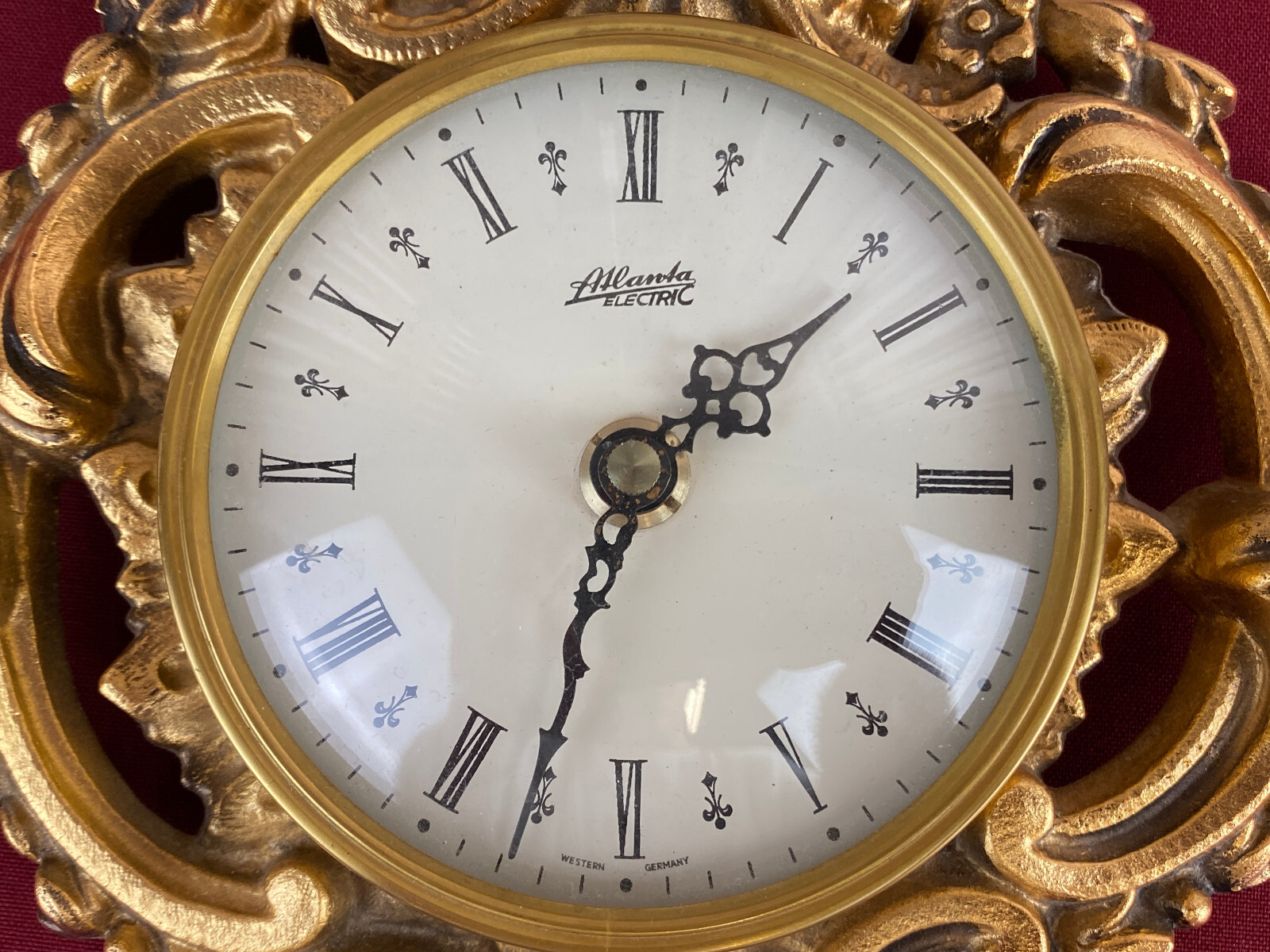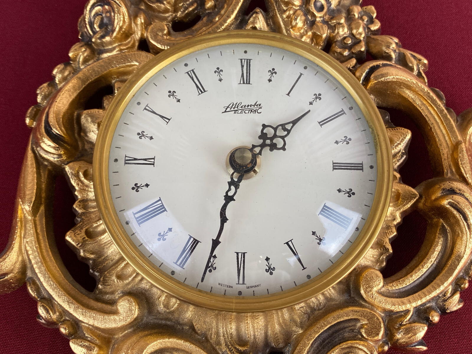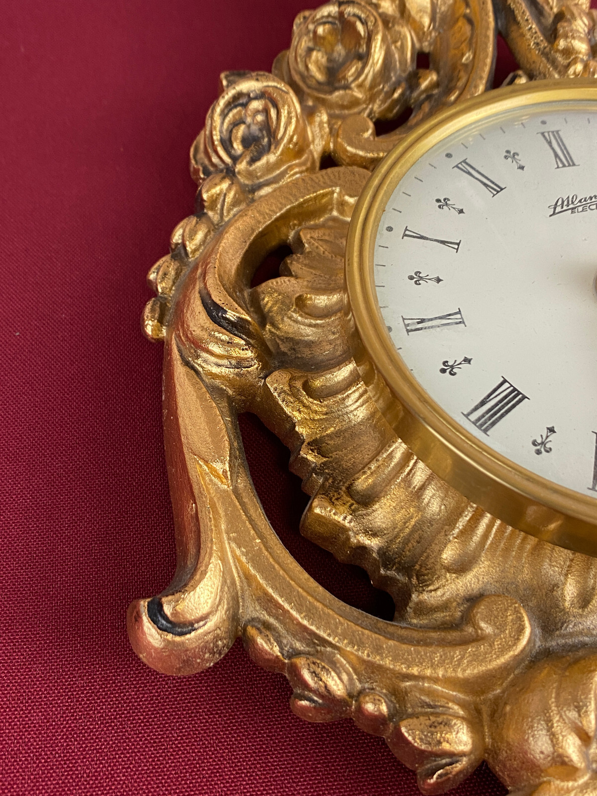 Kleine Kartelluhr aus Metall, Atlanta Electric. Das Werk ist funktionsfähig, Lieferung ohne Batterie. Abmessungen BTH 21/4/28cm. Die goldene Oberfläche ist ganz leicht angelaufen.