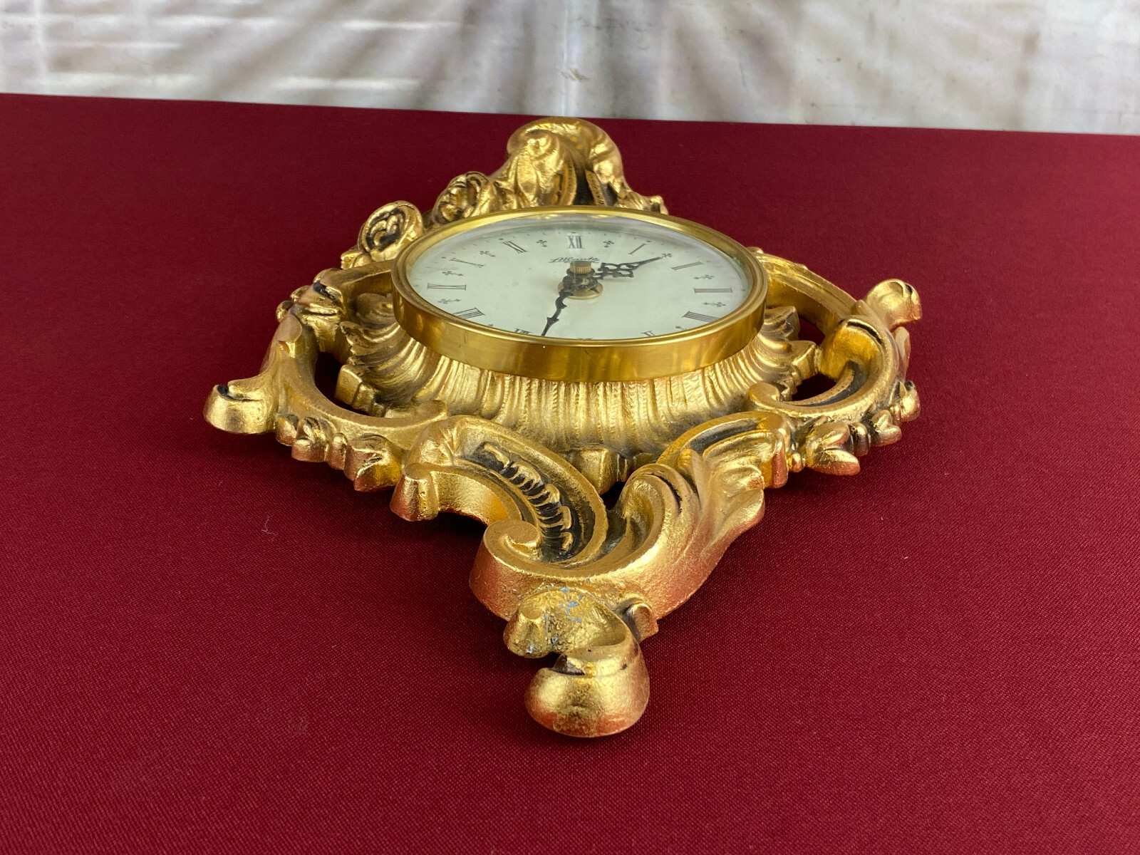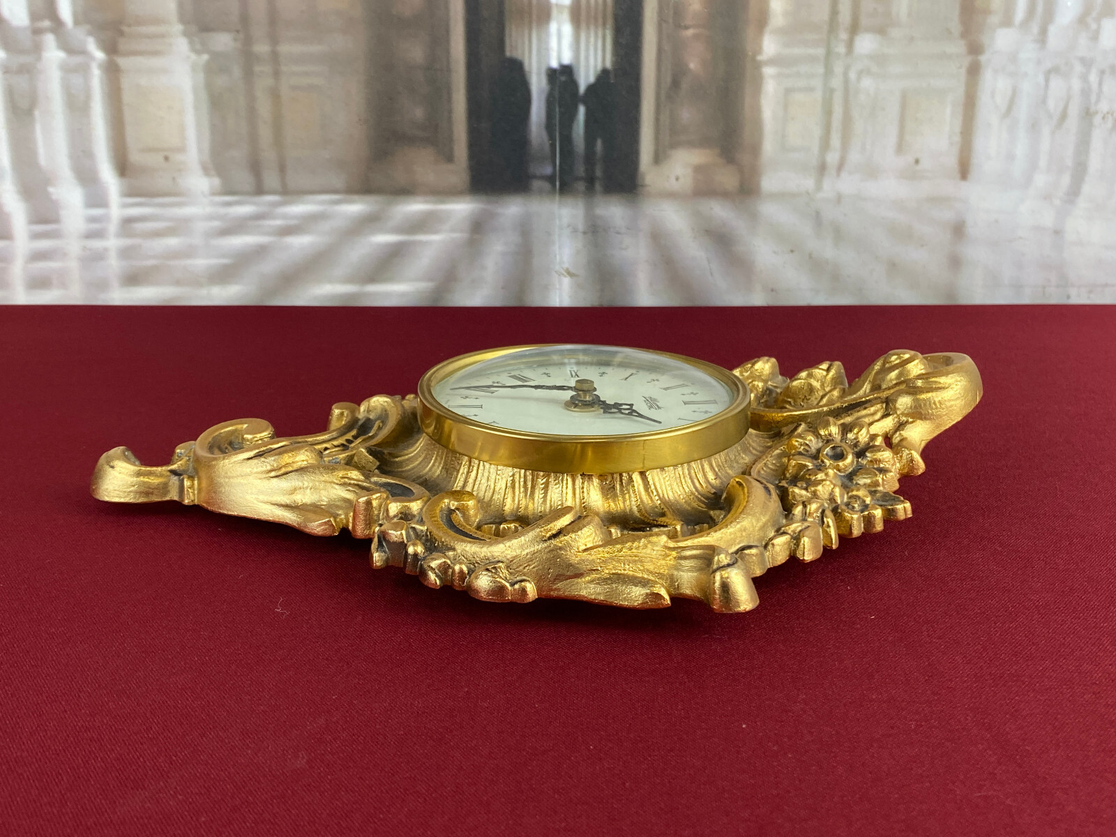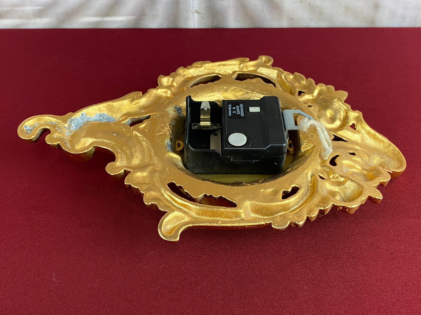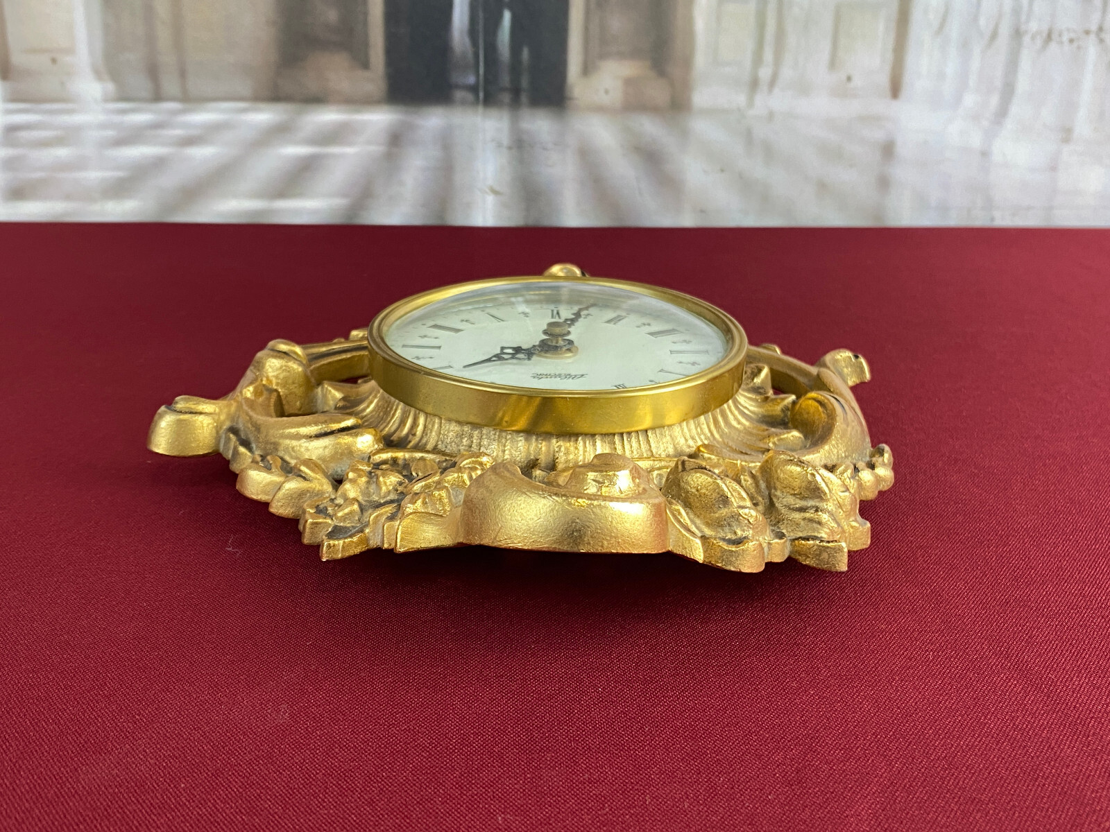 Kleine Kartelluhr aus Metall, Atlanta Electric. Das Werk ist funktionsfähig, Lieferung ohne Batterie. Abmessungen BTH 21/4/28cm. Die goldene Oberfläche ist ganz leicht angelaufen.