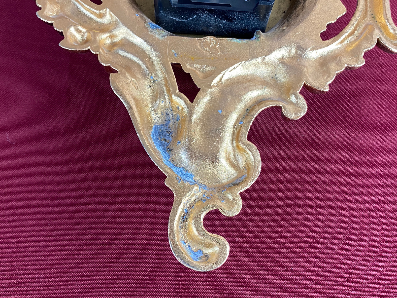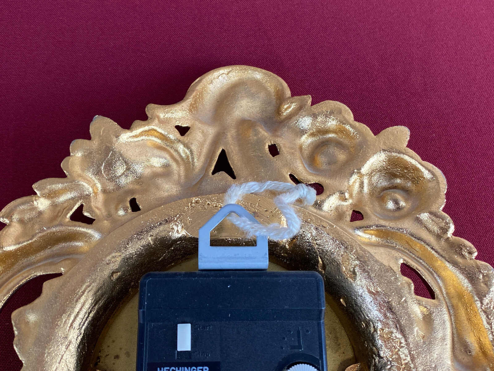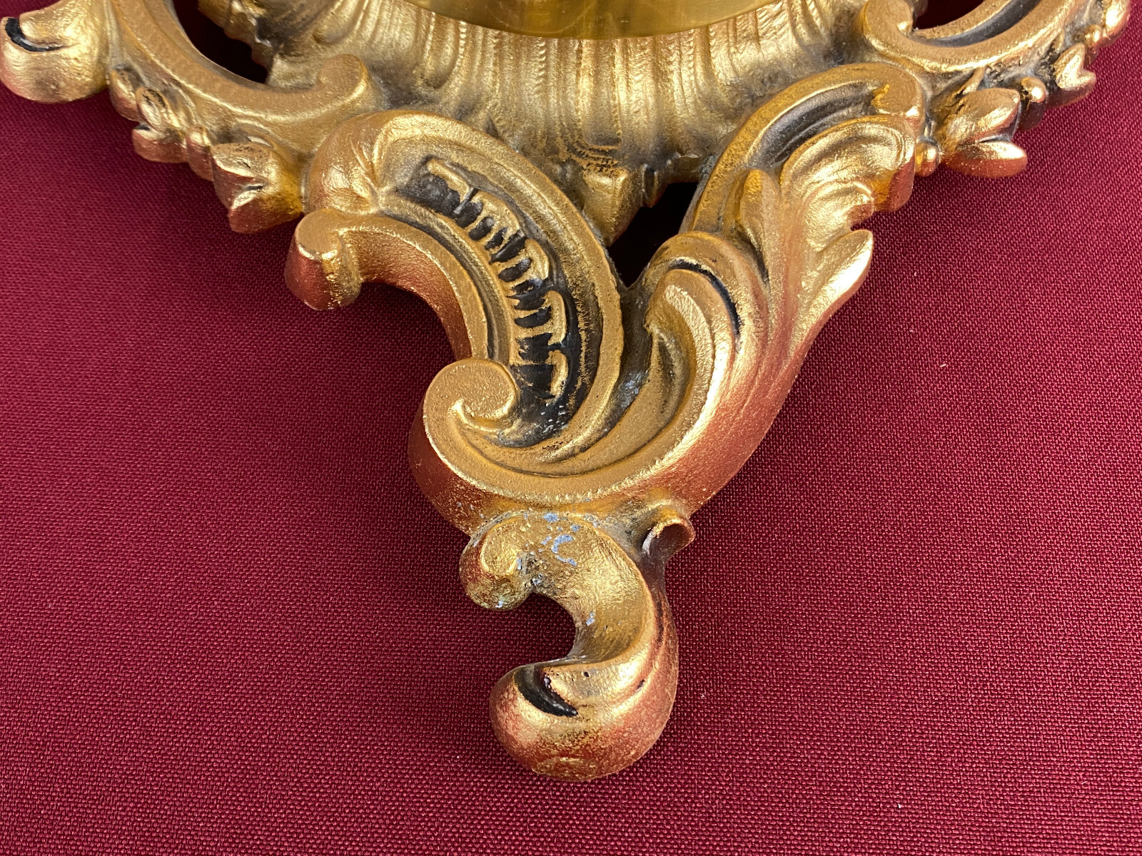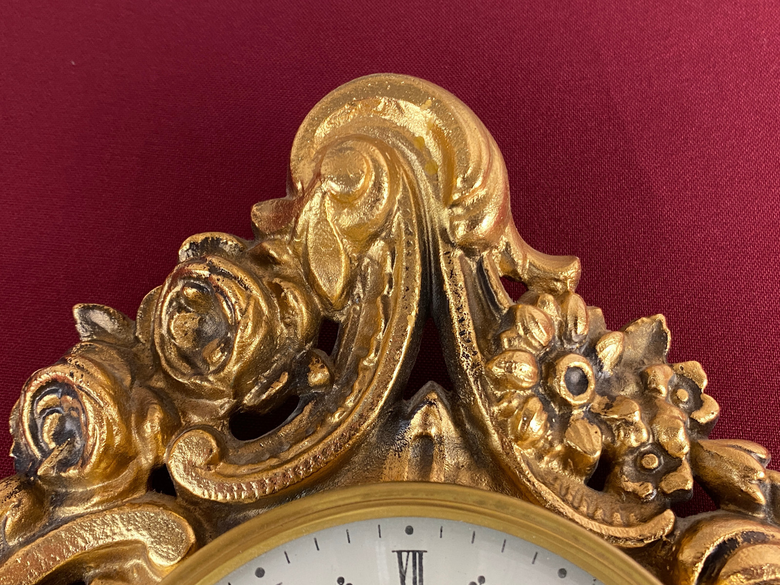 Kleine Kartelluhr aus Metall, Atlanta Electric. Das Werk ist funktionsfähig, Lieferung ohne Batterie. Abmessungen BTH 21/4/28cm. Die goldene Oberfläche ist ganz leicht angelaufen.