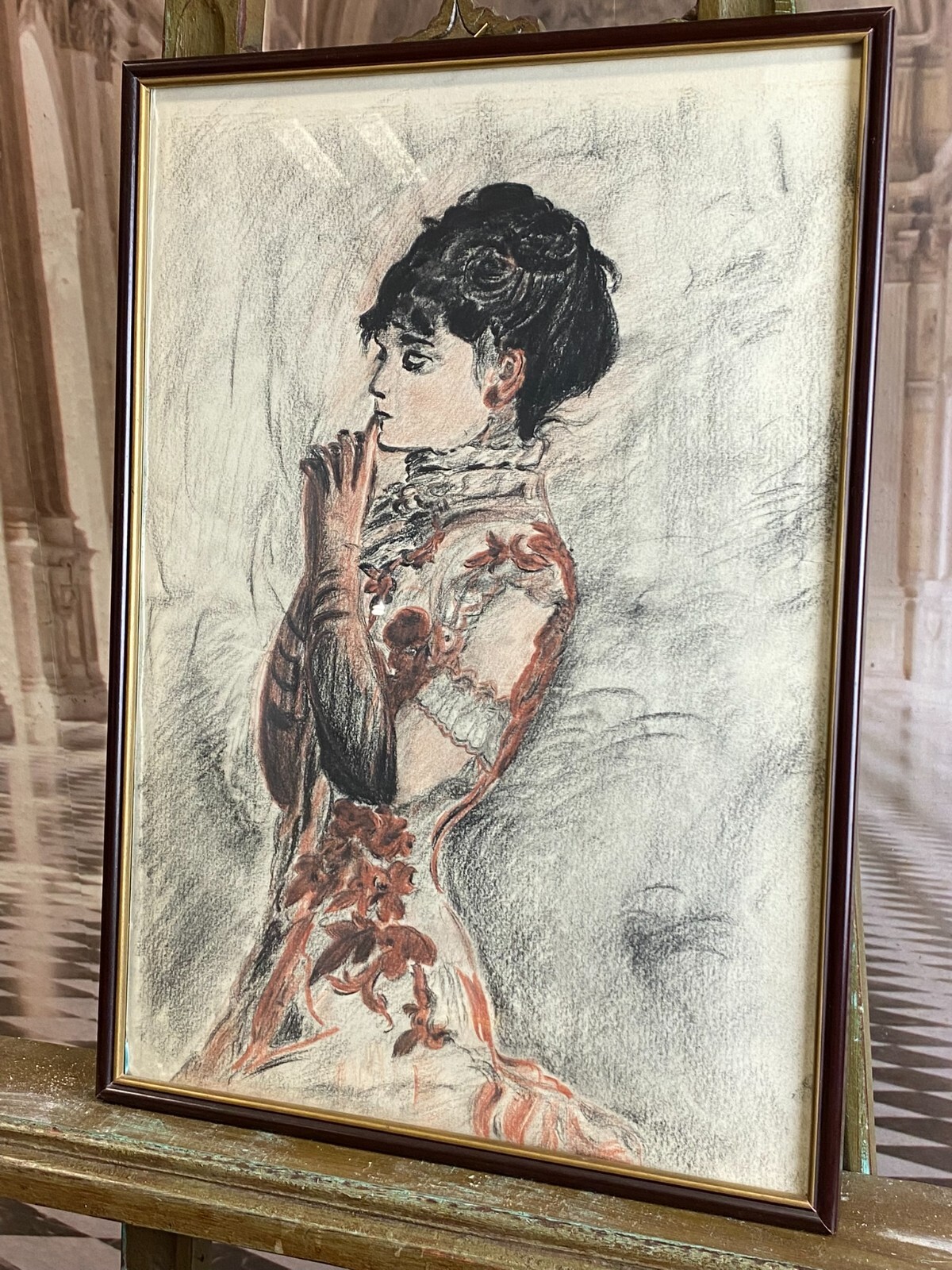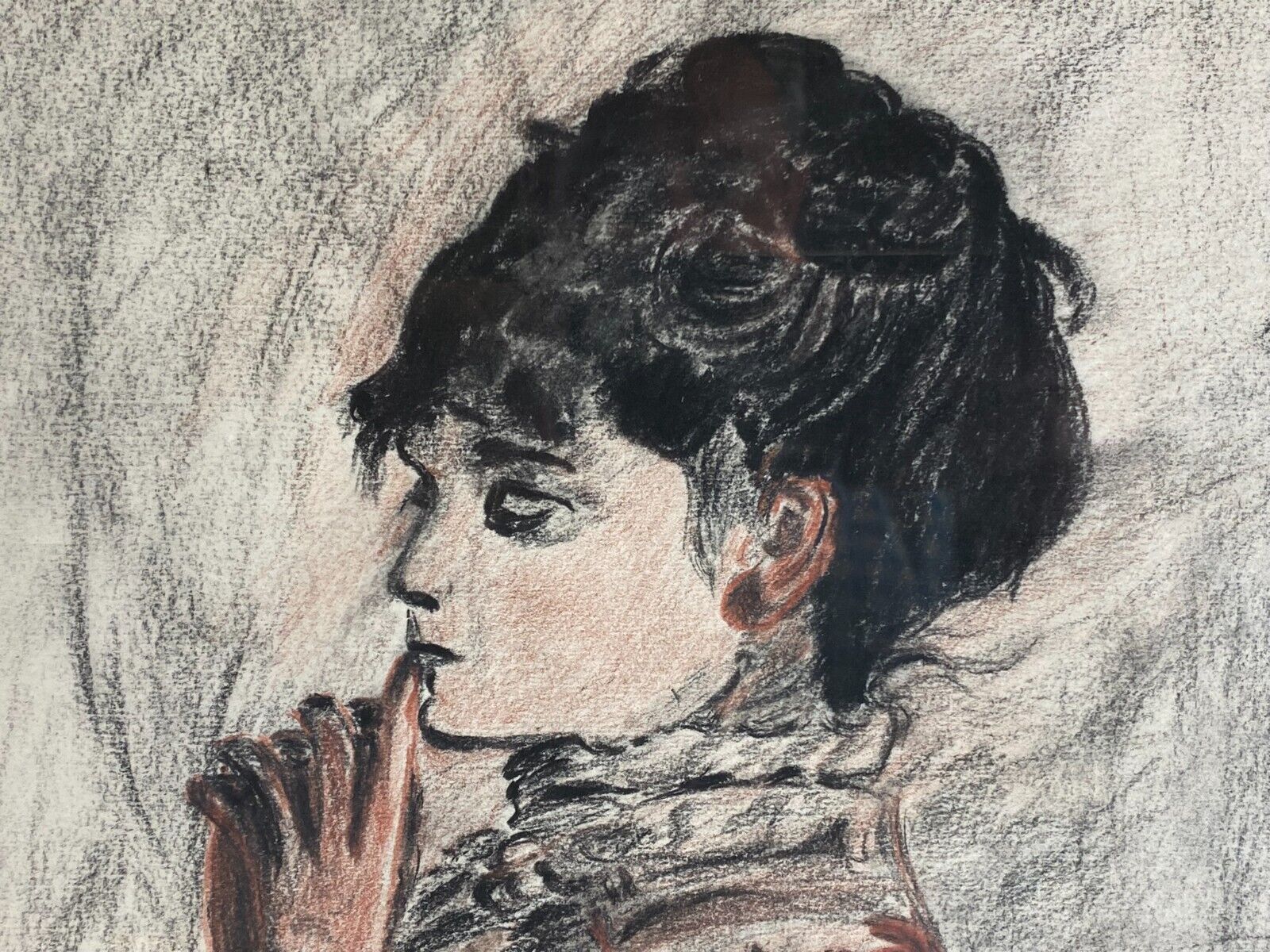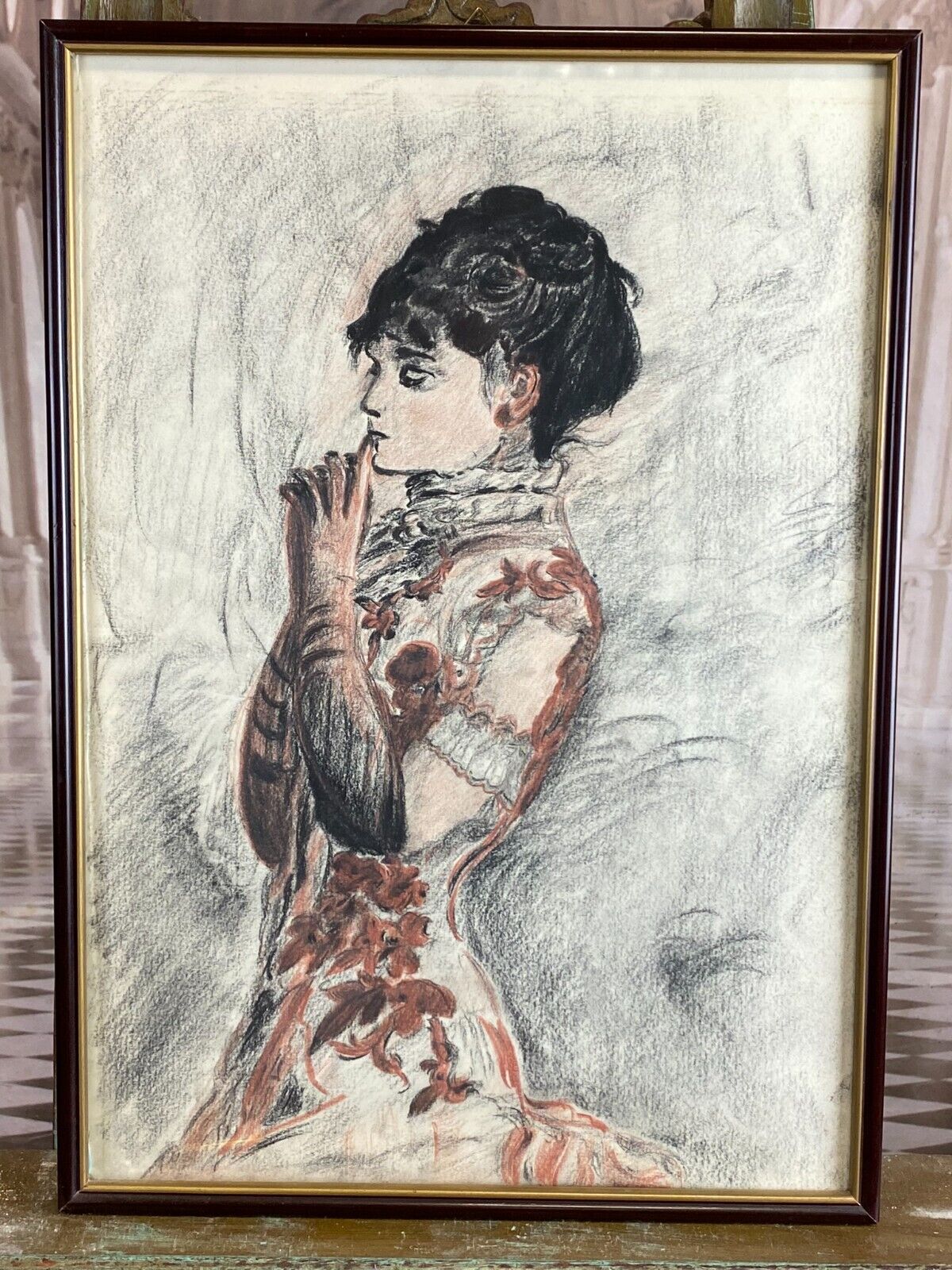 KOHLESTIFT ZEICHNUNG PORTRAIT EINER DAME STEHENDE FRAU