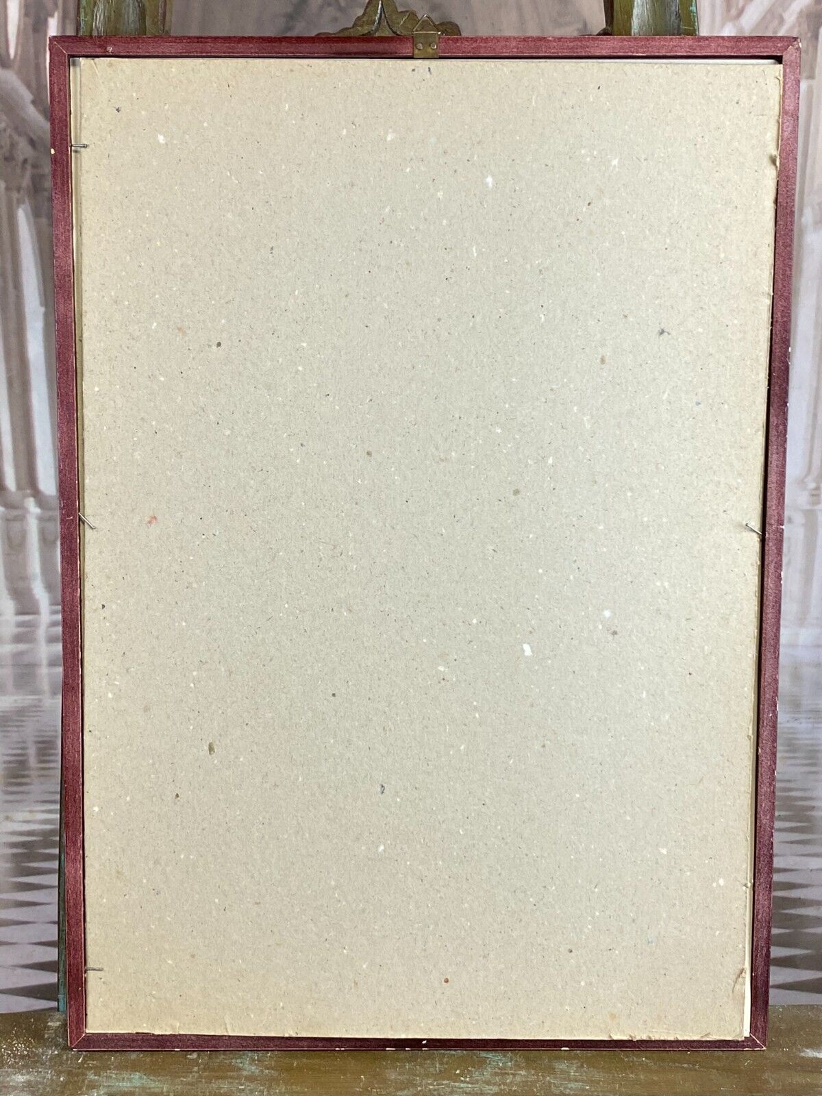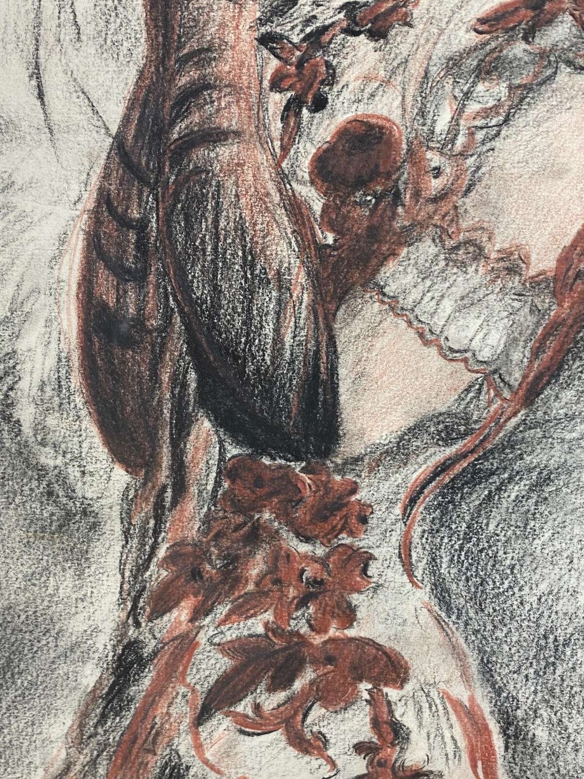 Kohlestift und Buntstiftzeichnung auf Papier, unsigniert. Das Blatt ist hinter Glas gerahmt, im oberen Bereich minimale Stockflecken. Der Rahmen ist leicht berieben. Gesamtabmessungen 37x52cm.