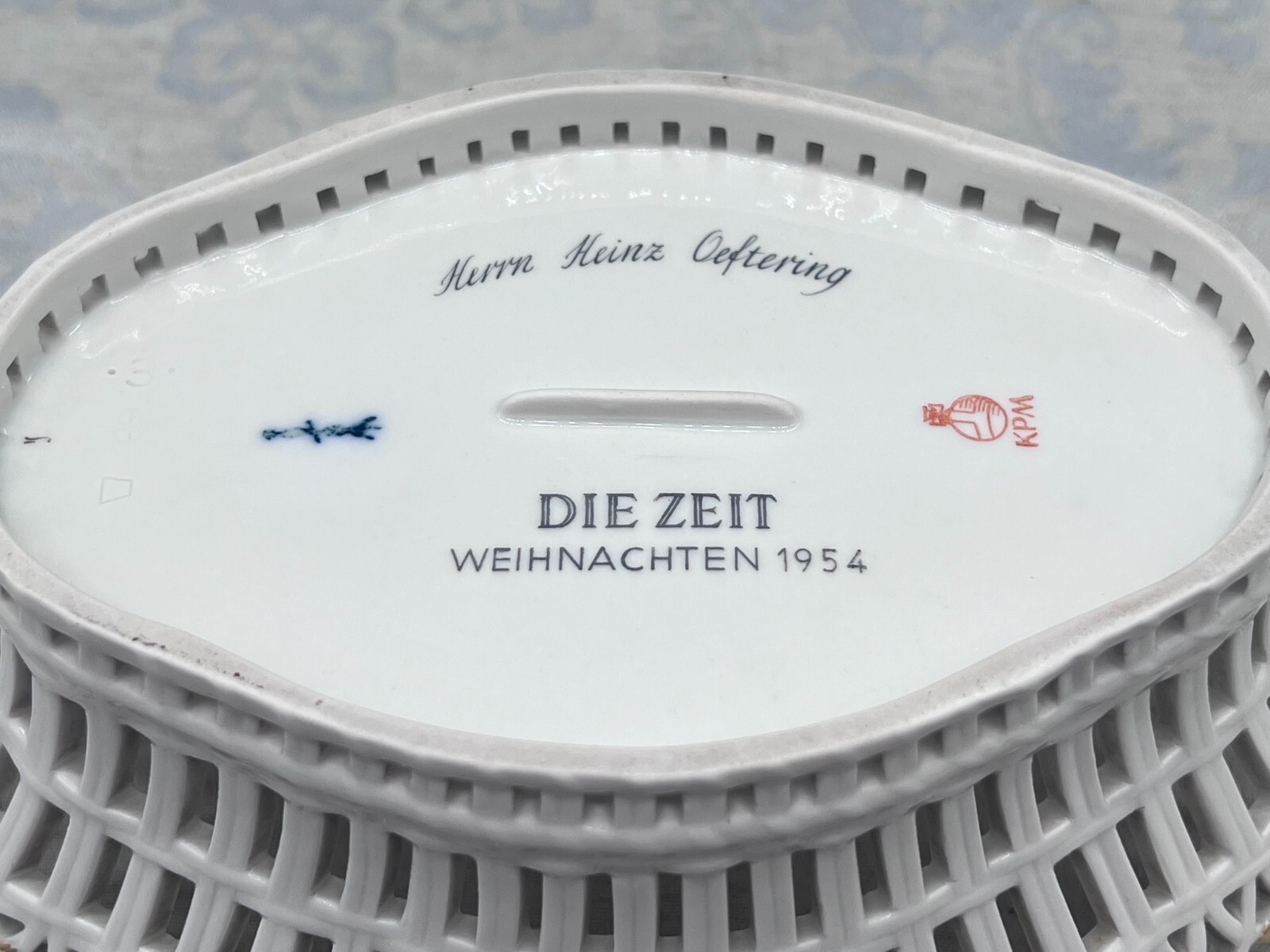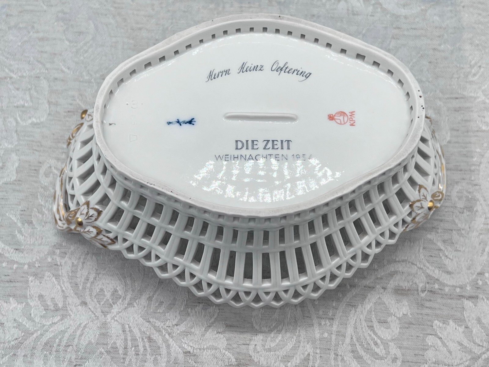 Sehr schöner Durchbruchkorb aus Porzellan, KPM. Ohne Chips, Vergoldung leicht berieben. Am Boden Widmung, Abmessungen BTH 23/16/9,5cm.