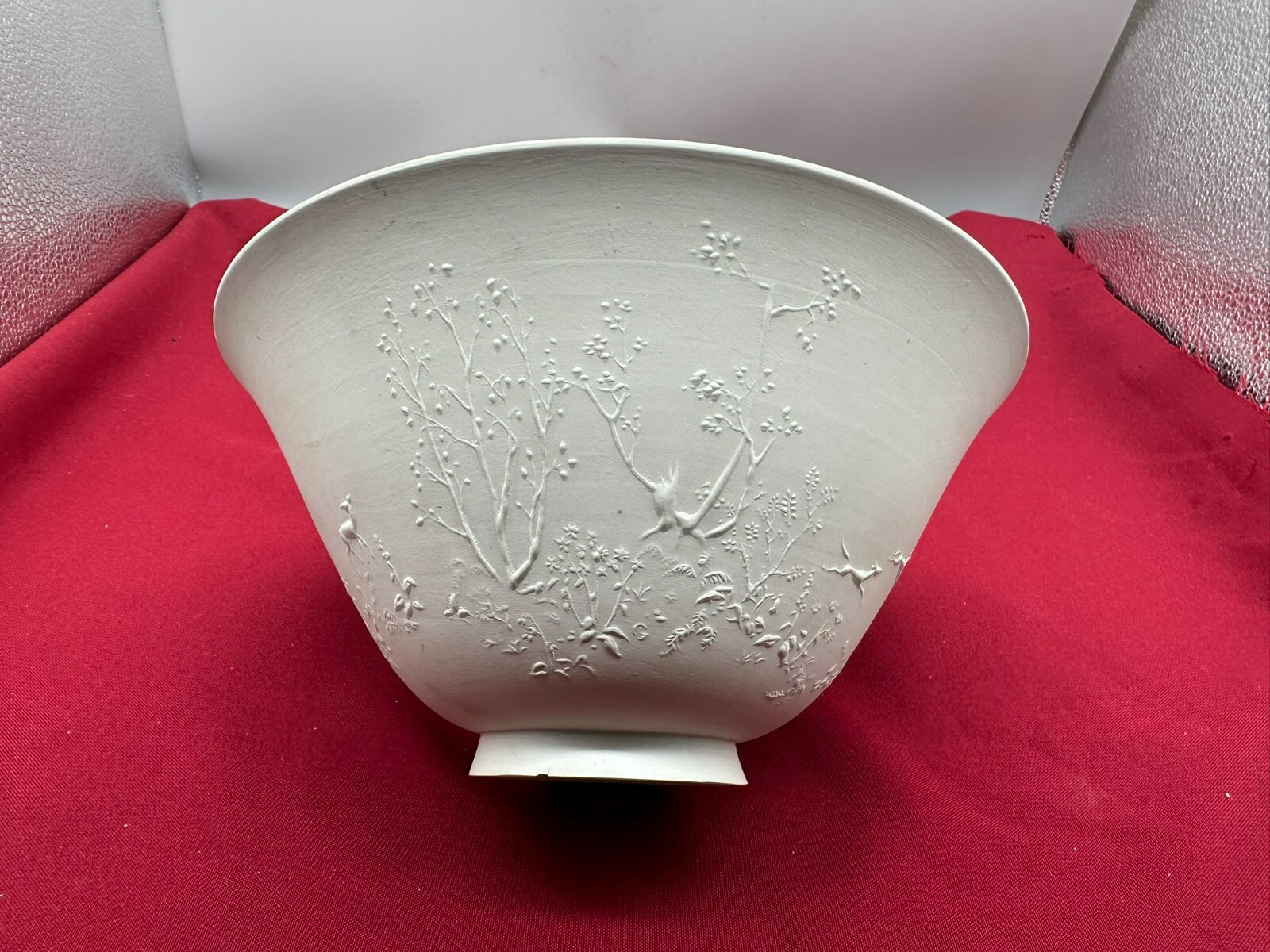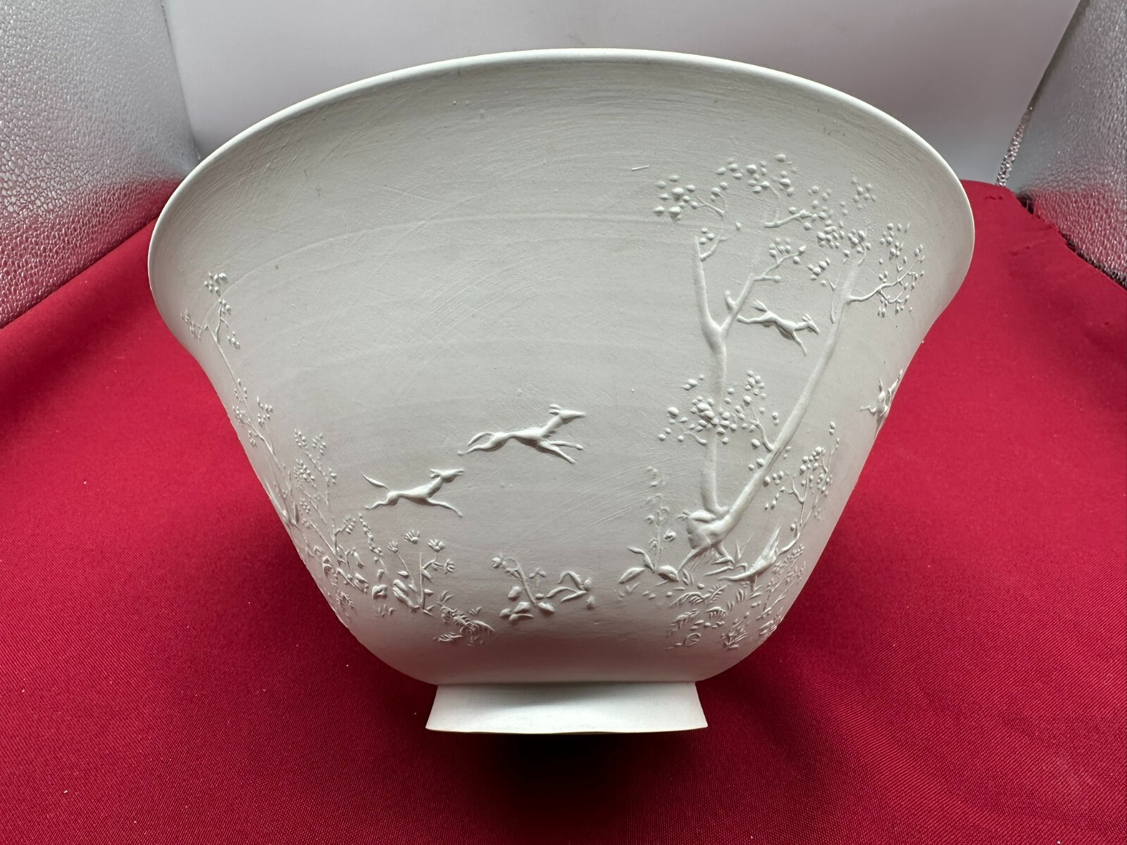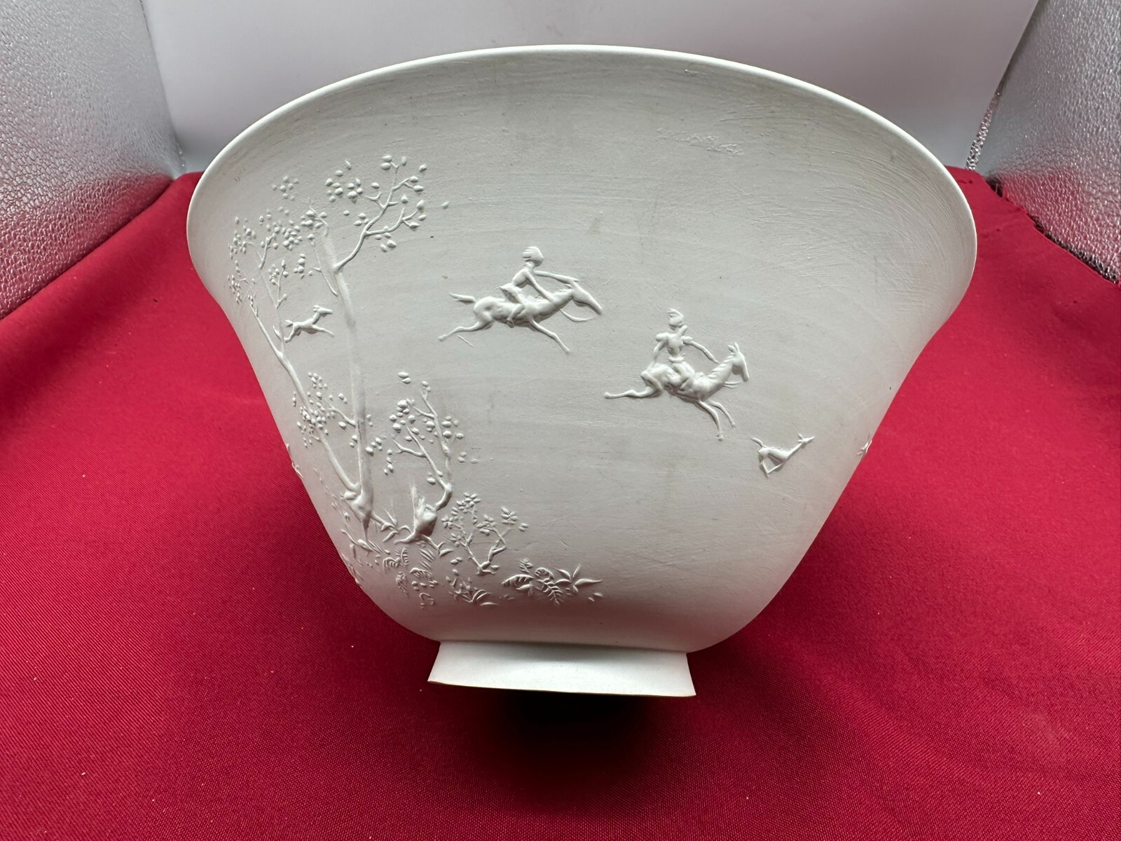 Große Schüssel aus Porzellan, aussen nicht glasiert mit Reliefdekor. Manufaktur KPM, Aussenwand leicht berieben und schmutzig, am Bodenring Chip. Höhe/Durchmesser 11/23cm.