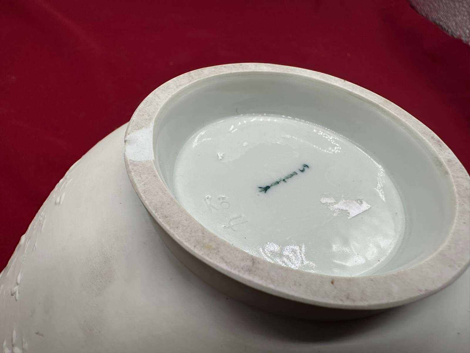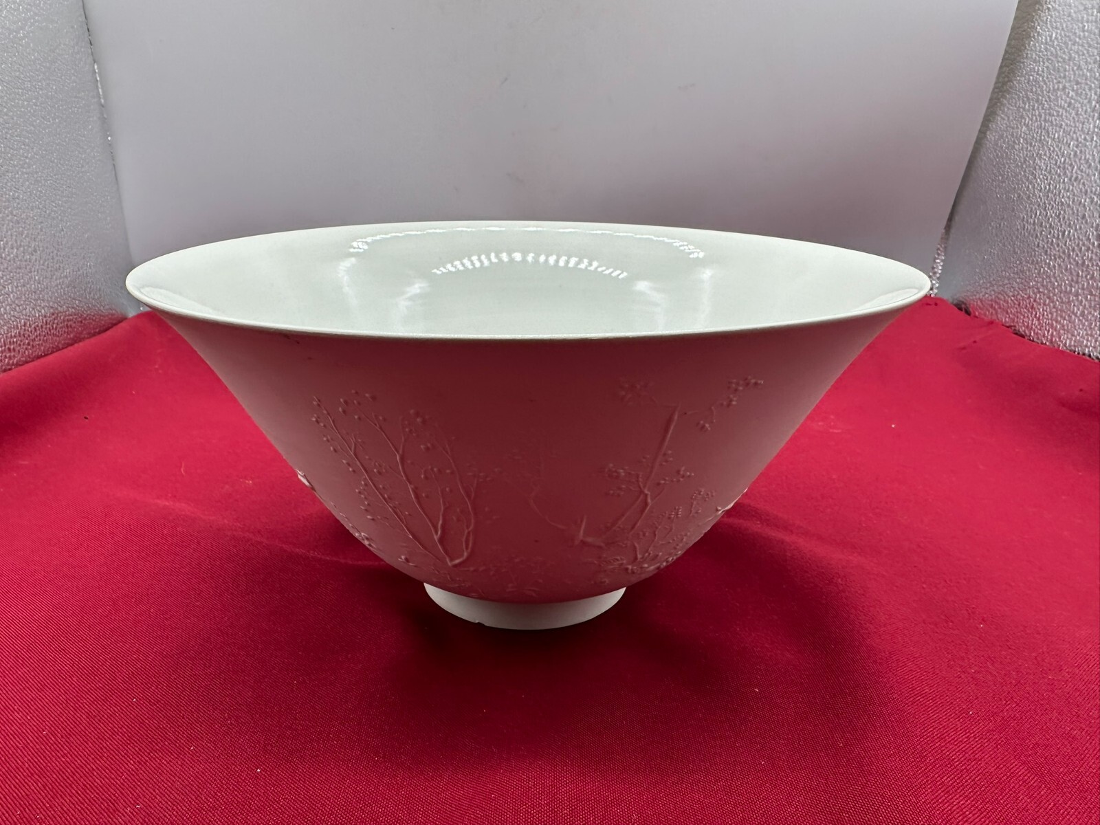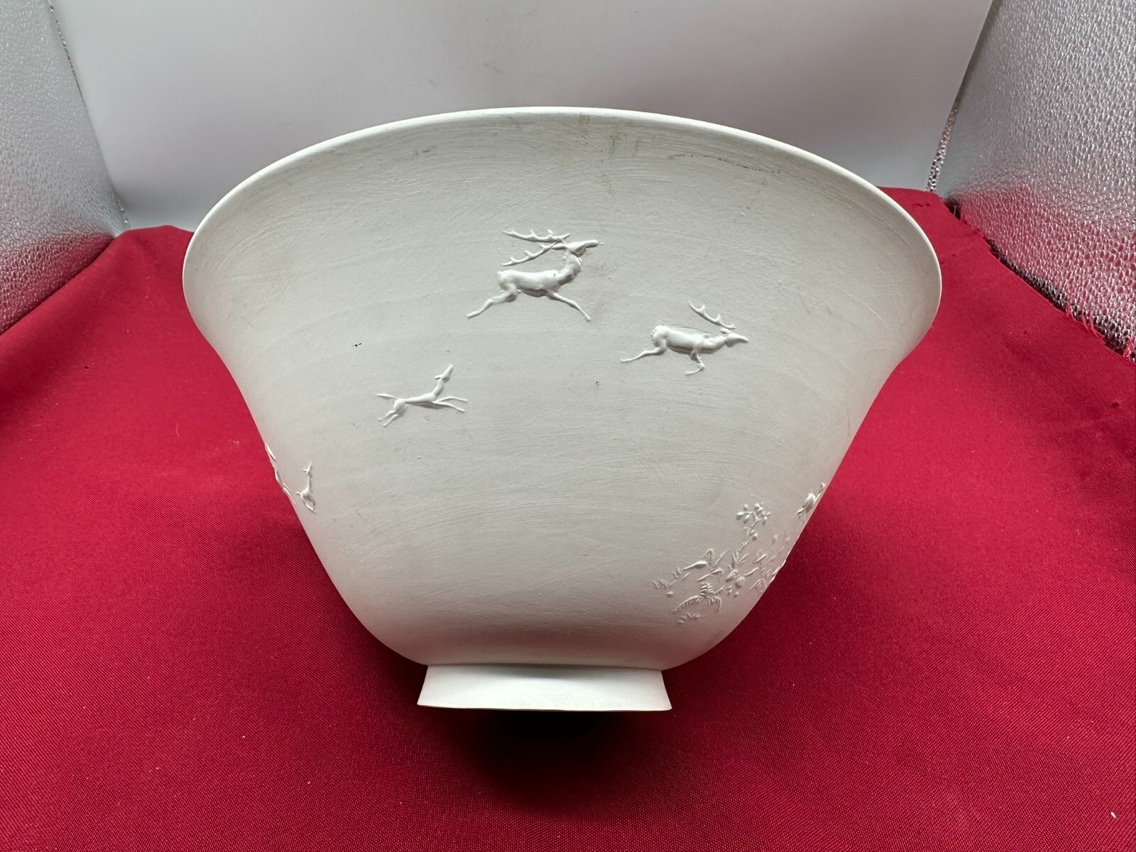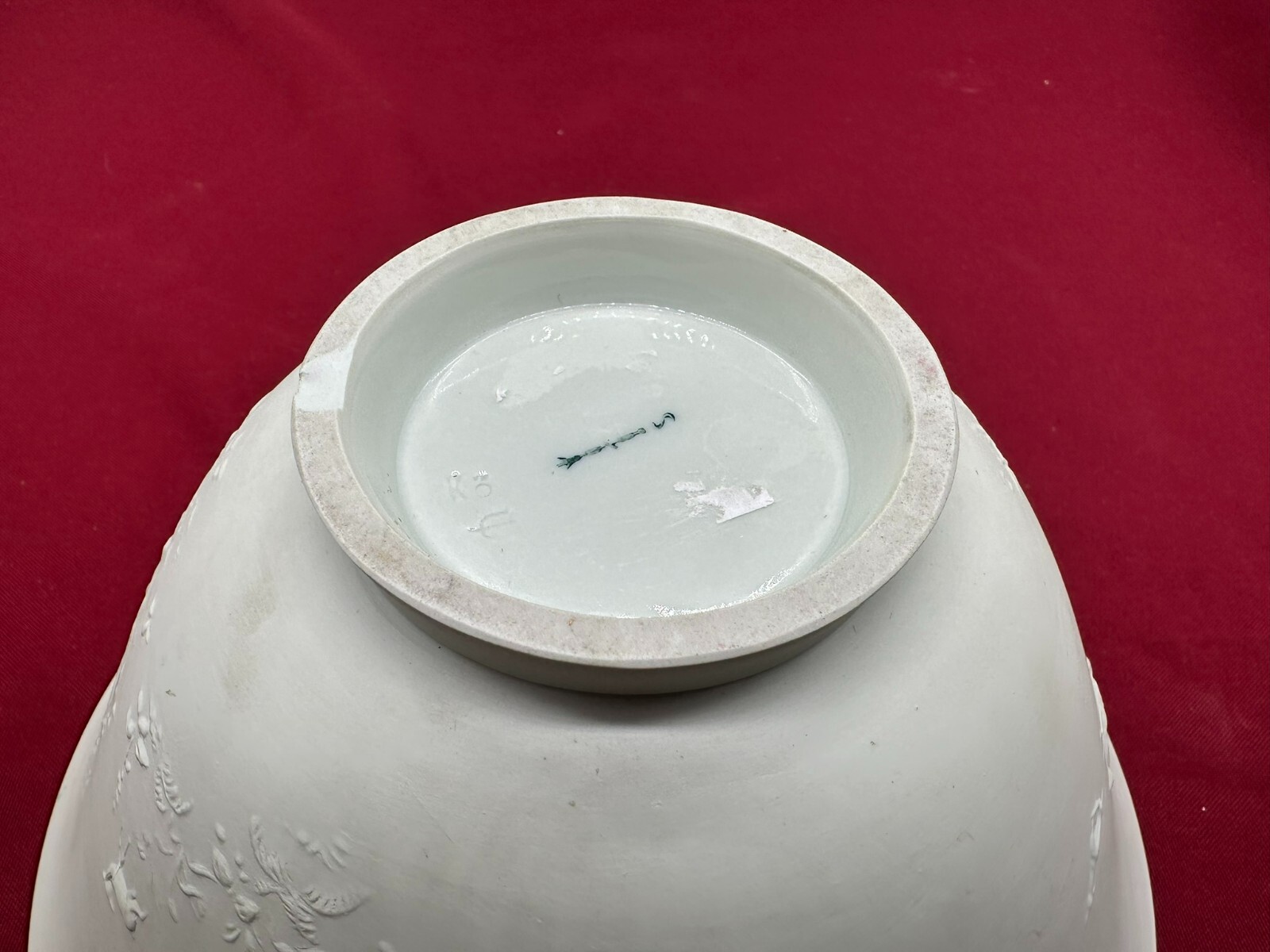 Große Schüssel aus Porzellan, aussen nicht glasiert mit Reliefdekor. Manufaktur KPM, Aussenwand leicht berieben und schmutzig, am Bodenring Chip. Höhe/Durchmesser 11/23cm.