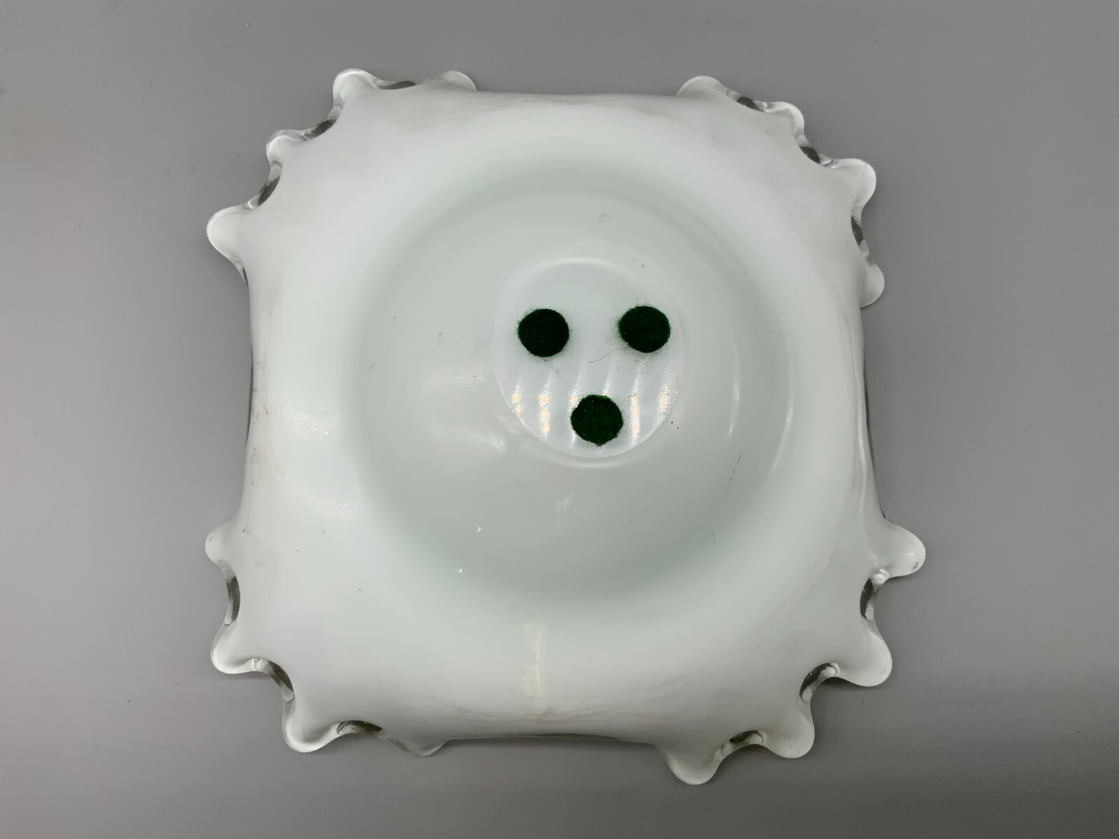 Massive Schale aus Glas, handgefertigt, am Boden Kratzer, ohne Chips. Oberfläche mit kleineren Bläschen. Durchmesser /Höhe 26/7cm.