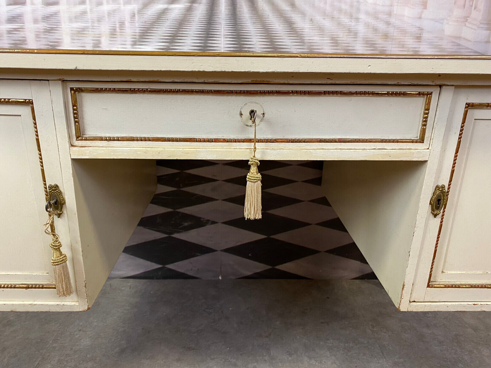 Alter Louis Seize Schreibtisch mit Glasplatte, zweite Hälfte 20-tes Jhdt. Oberfläche mit leichtem Abrieb und kleineren Bestossungen. Das Textil unterhalb der Glasplatte fleckig, die inneren Leisten sind von der Platte ebenfalls zum Teil bestossen und leicht unvollständig, Aussenleisten zum Teil unvollständig. Schlösser ohne Funktion, zwei Schlüssel werden mitgegeben. Mittlere Schlüssellochabdeckung nicht vorhanden, Innenraum zum Teil fleckig. Der Schreibtisch ist insich stabil, ein Bein leicht kürzer. Abmessungen BTH 115/68/78cm. Beinfreiheit BxH 50x62cm.