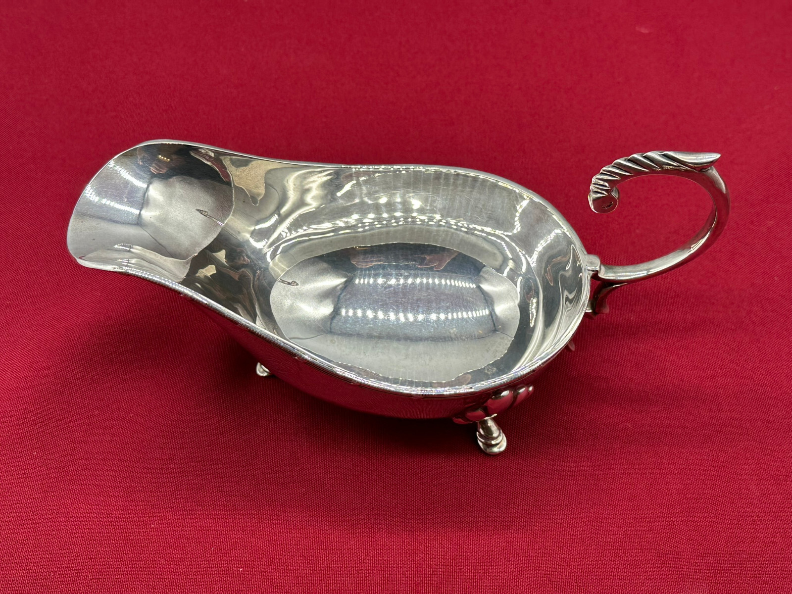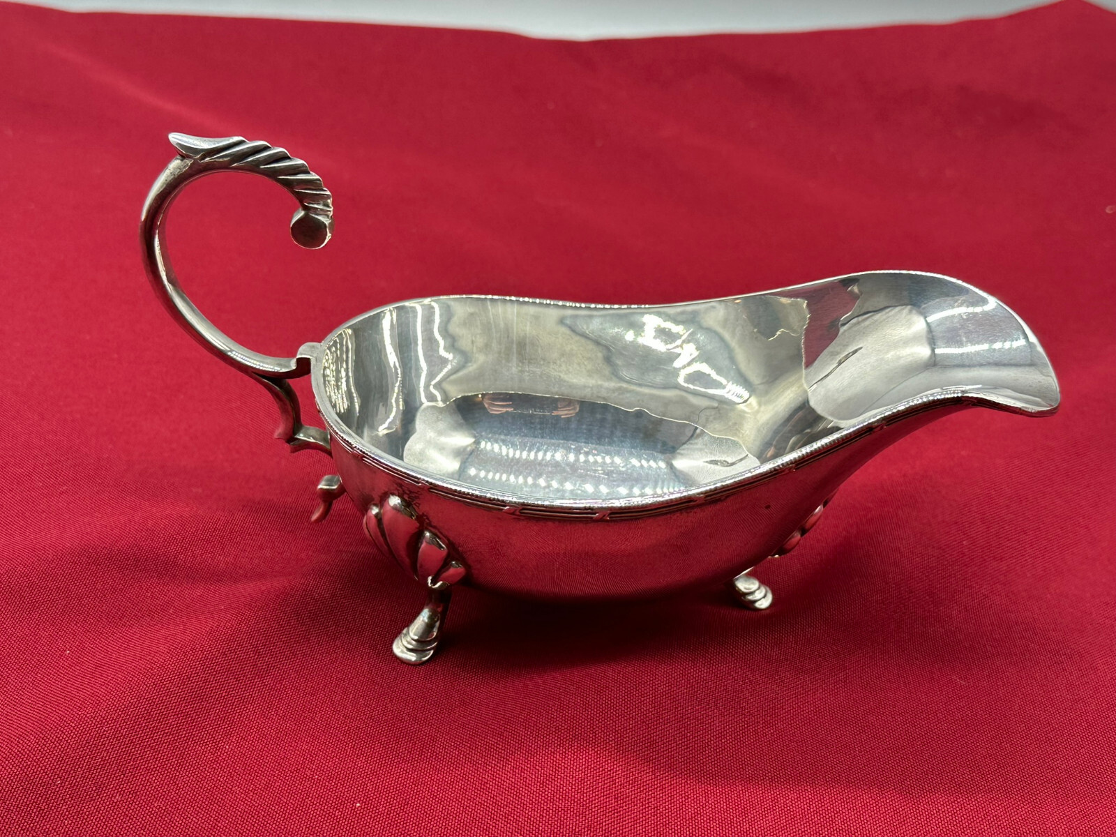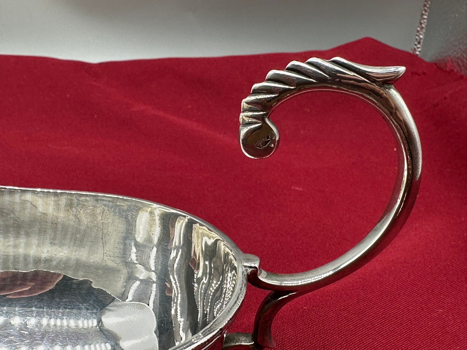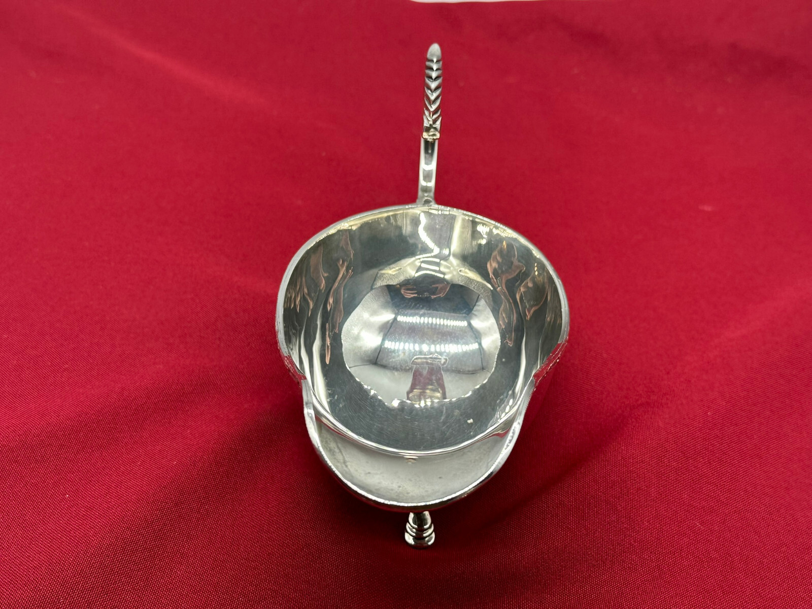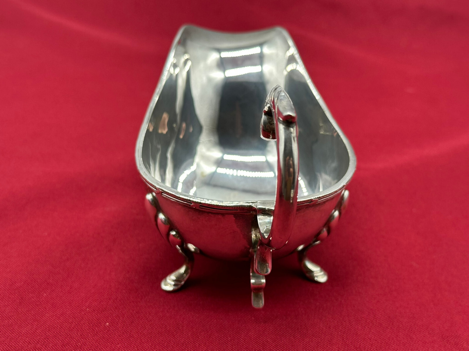 Sehr schöne antike edwardianische Sauciere um 1900, Metall versilbert in sehr gutem Zustand, minimal fleckig. Abmessungen BTH 20/9,5/10cm.