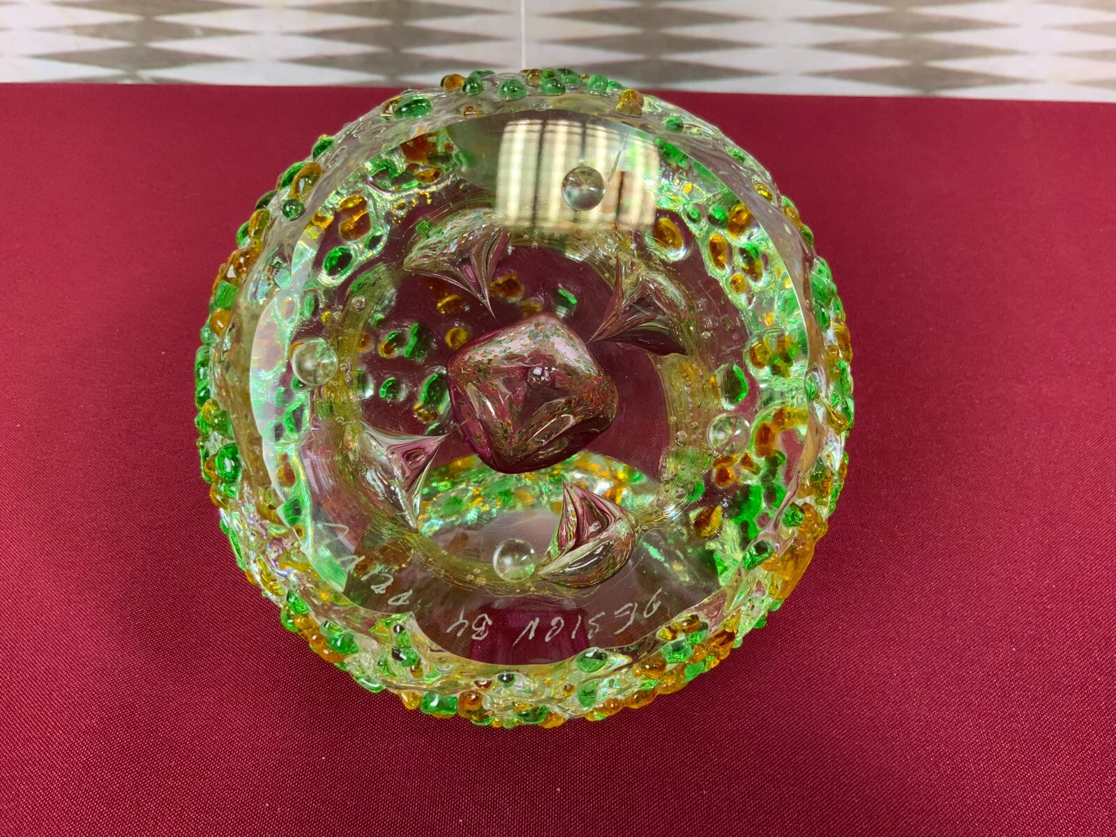 Sehr schöne massive Glaskugel mit sehr aufwendiger Innenarbeit, Designed by Princ. Am großen Schaufenster kleiner Chip und wenige feine Kratzer, am Bodenring ebenfalls Kratzer. Höhe/Durchmesser 14/14cm.