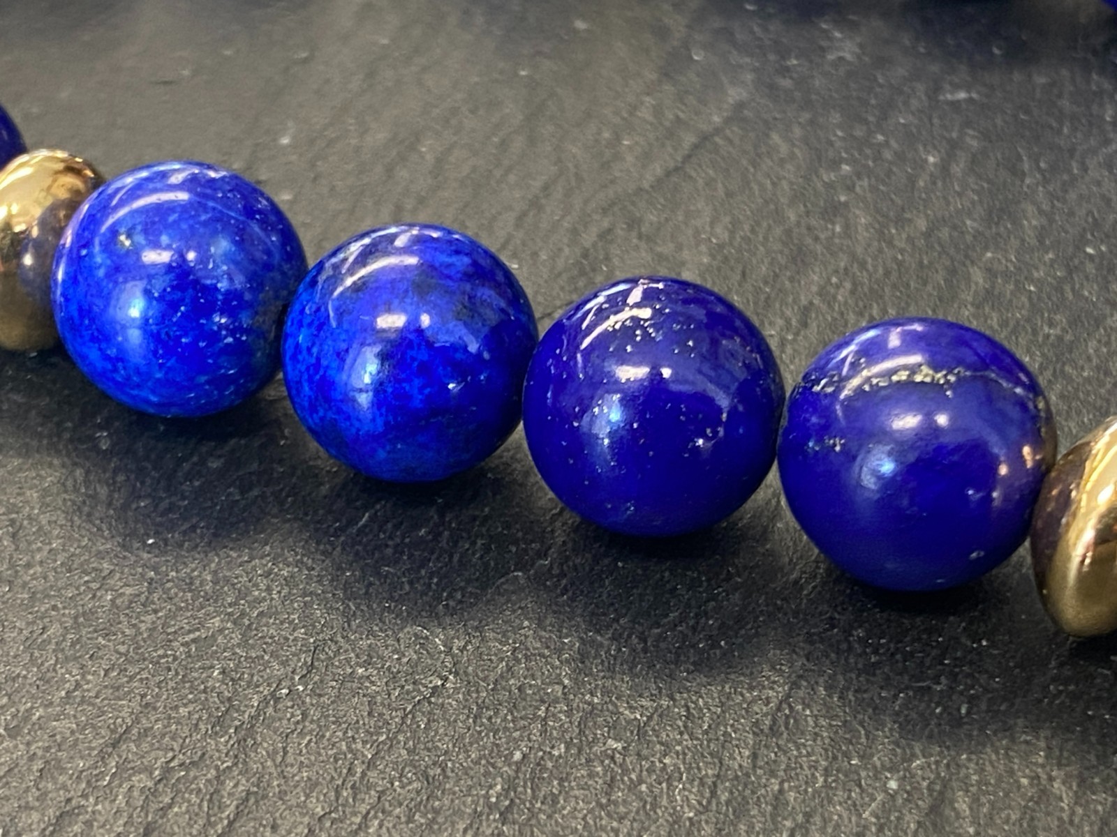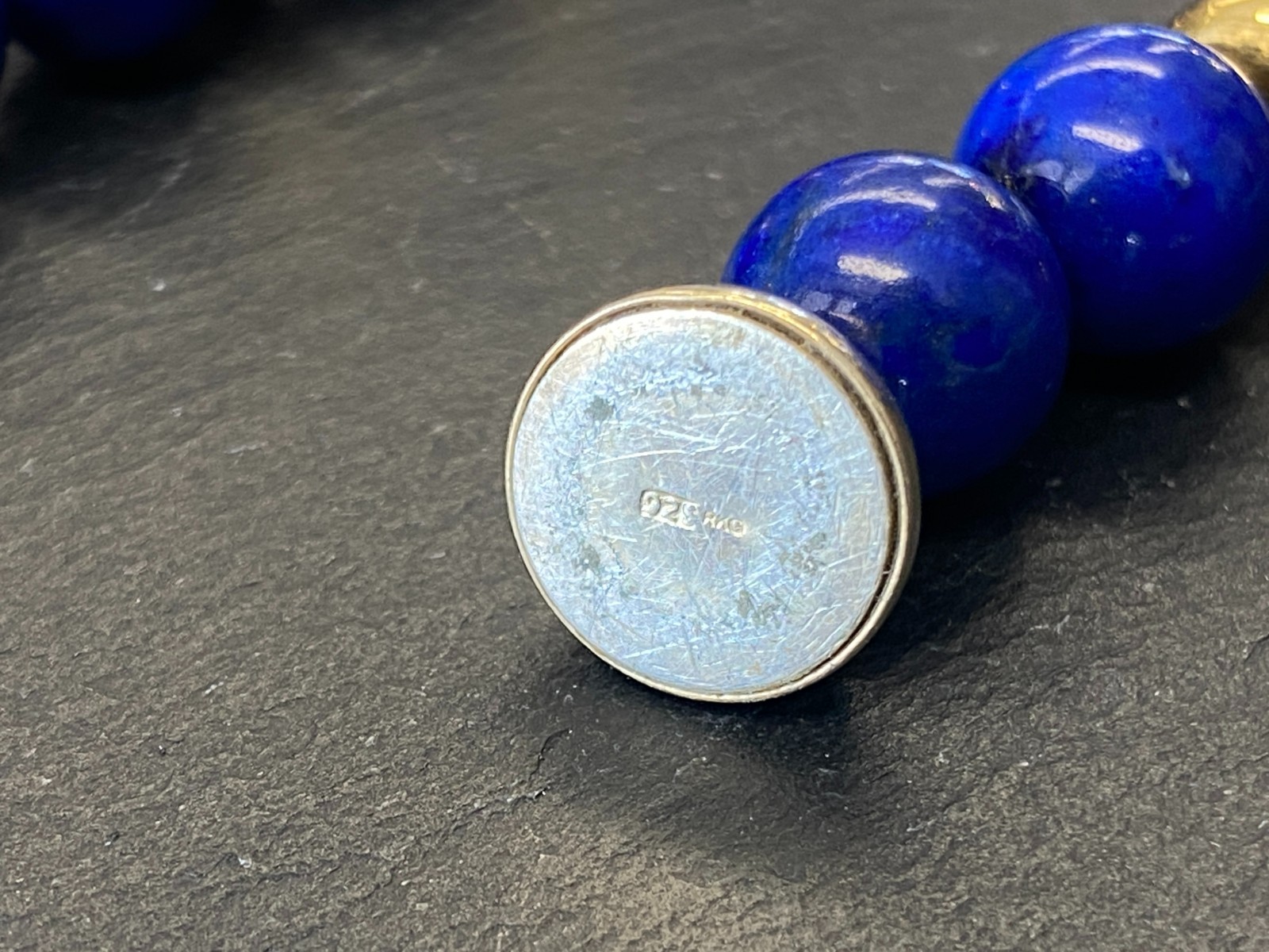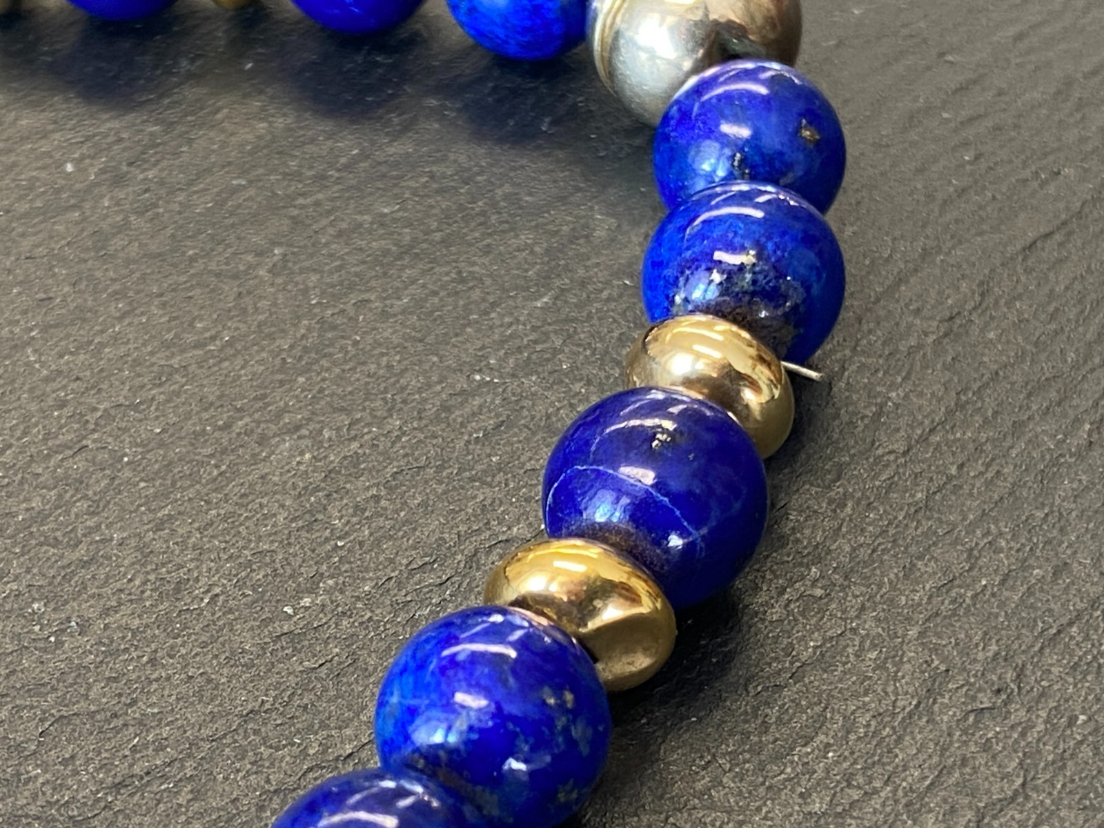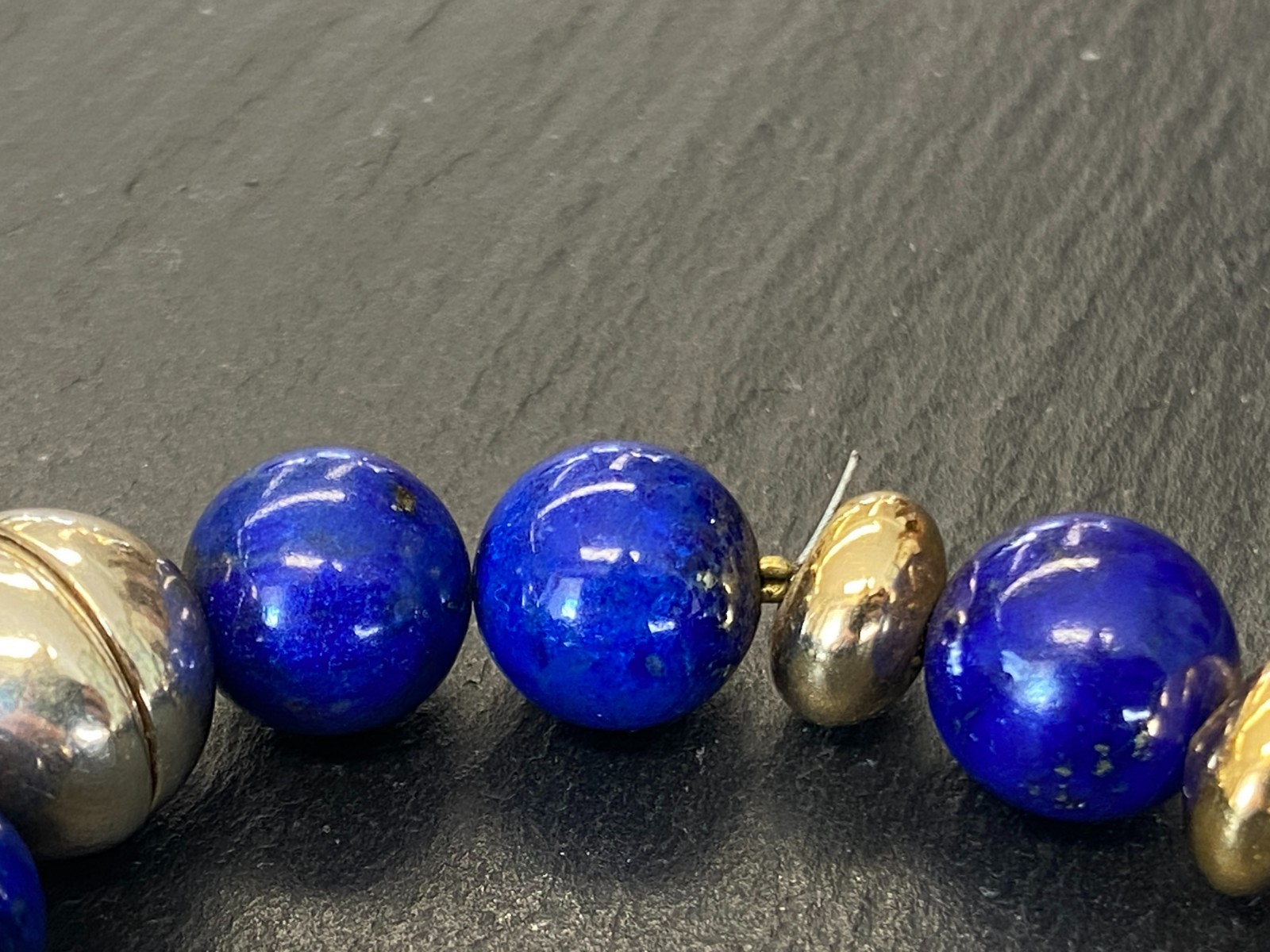 Massive Halskette mit großen Perlen aus Lapis Lazuli, diese haben je einen Durchmesser von ca. 1,2cm. Am Verschluss mit 925 gestempelt, die Dekoelemente zwischen den Perlen sind ebenfalls aus vergoldetem Metall, mit Niton DXL getestet – diese haben zum Teil kleine Dellen. Die Perlen weisen vereinzelt kleinere Strukturrisse auf, an keiner ist etwas abgebrochen. Das Metall ist oxydiert und leicht berieben. Gesamtlänge ca. 44cm, Gesamtgewicht ca. 88,61g. Die Begutachtung der Stücke wird vorgenommen von einem Fachmitglied der deutschen gemmologischen Gesellschaft E.V.