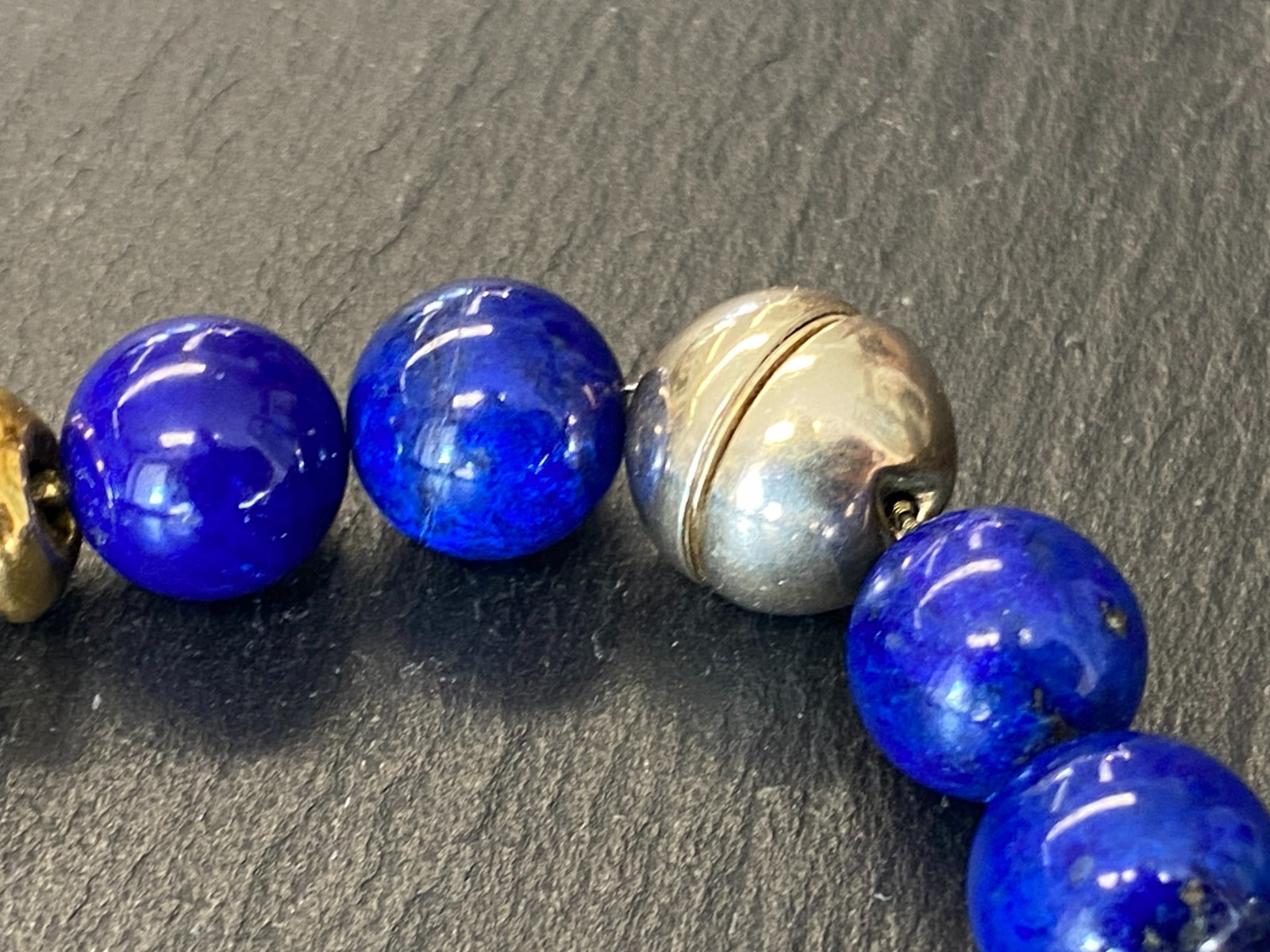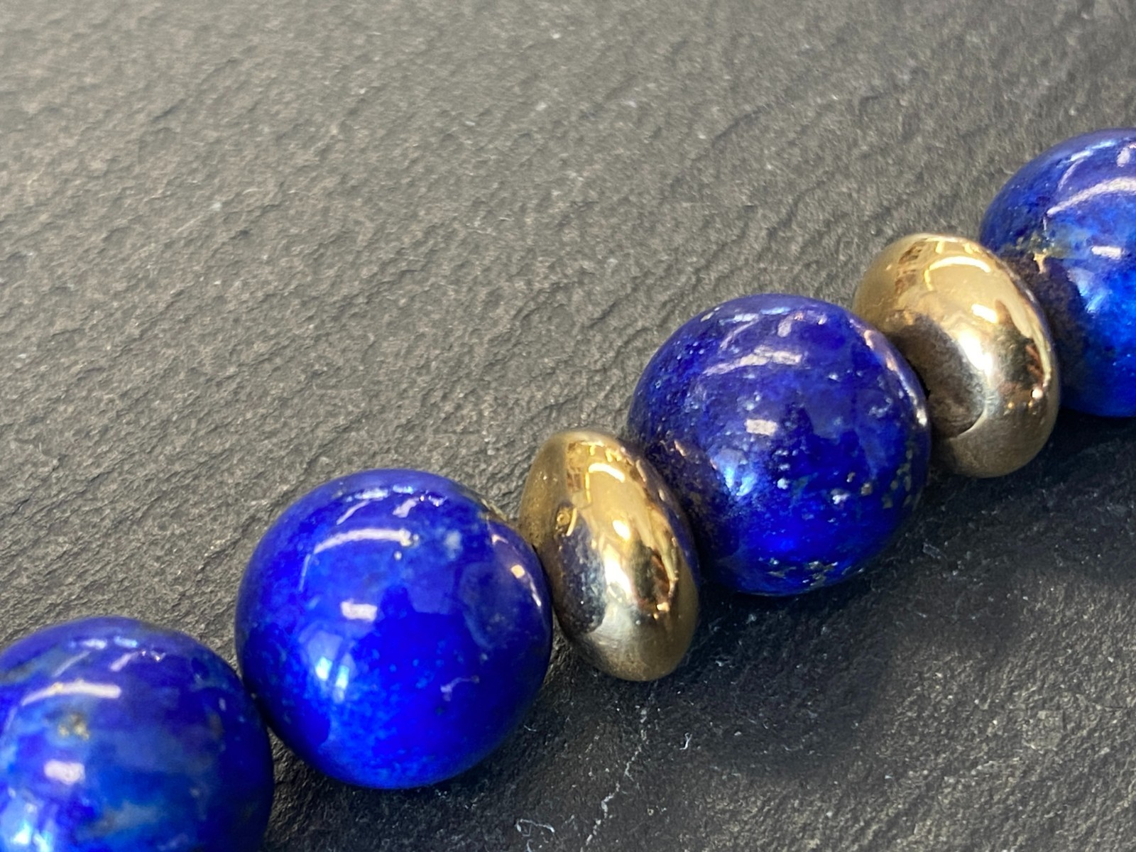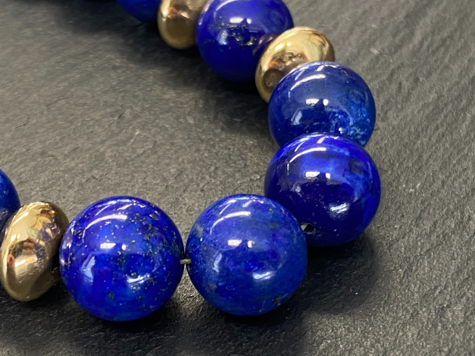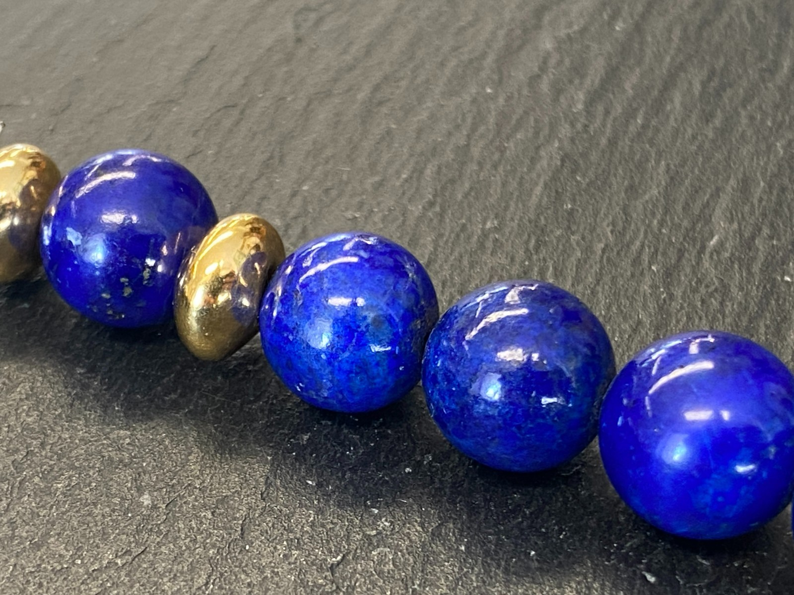 Massive Halskette mit großen Perlen aus Lapis Lazuli, diese haben je einen Durchmesser von ca. 1,2cm. Am Verschluss mit 925 gestempelt, die Dekoelemente zwischen den Perlen sind ebenfalls aus vergoldetem Metall, mit Niton DXL getestet – diese haben zum Teil kleine Dellen. Die Perlen weisen vereinzelt kleinere Strukturrisse auf, an keiner ist etwas abgebrochen. Das Metall ist oxydiert und leicht berieben. Gesamtlänge ca. 44cm, Gesamtgewicht ca. 88,61g. Die Begutachtung der Stücke wird vorgenommen von einem Fachmitglied der deutschen gemmologischen Gesellschaft E.V.