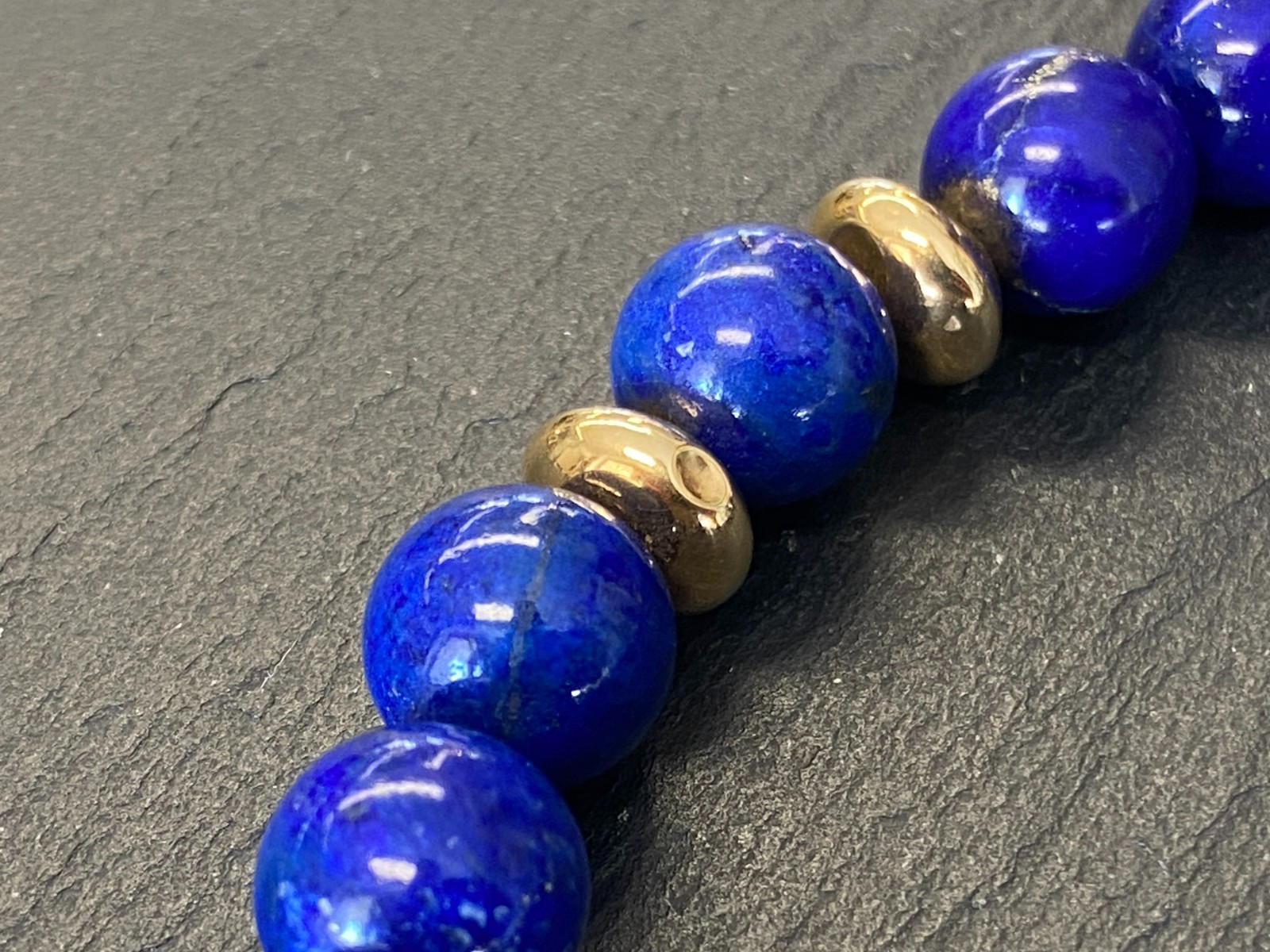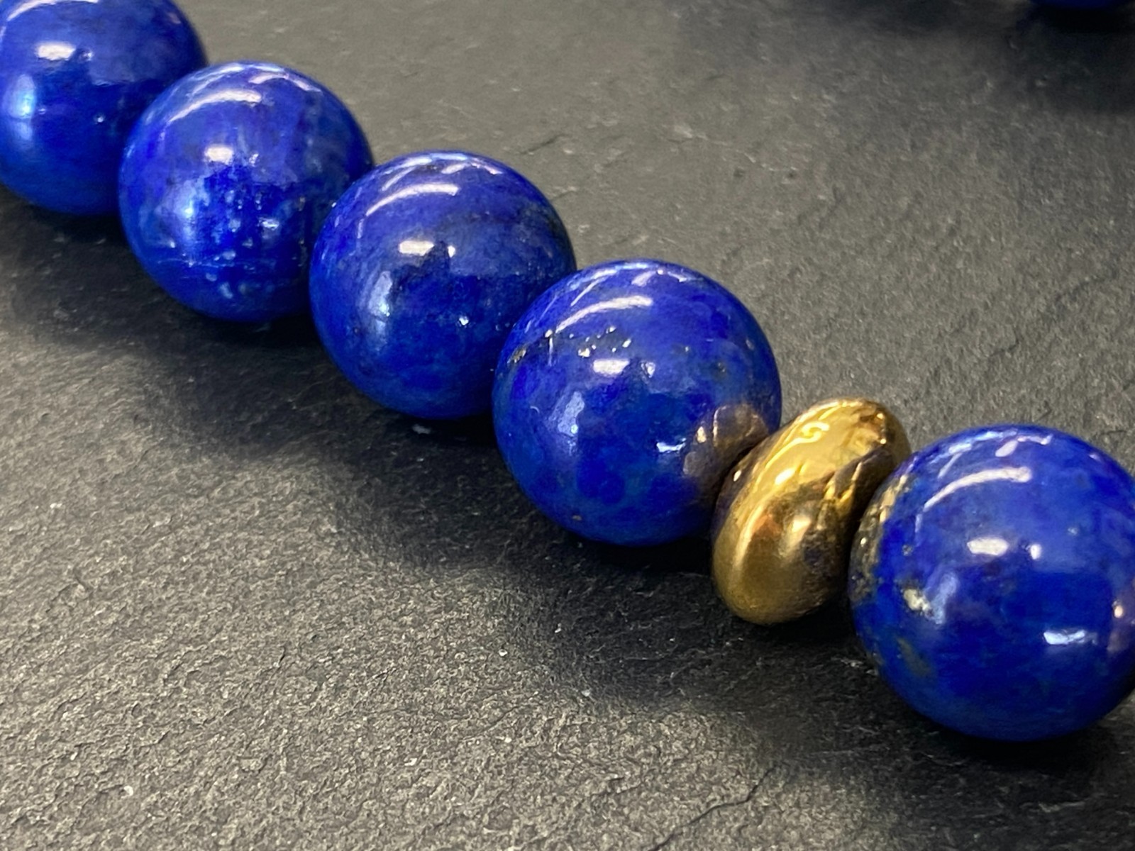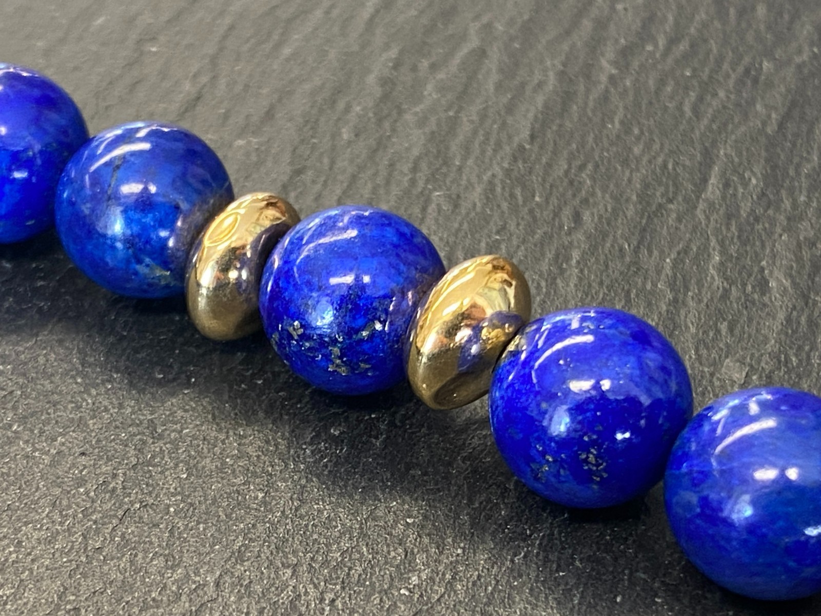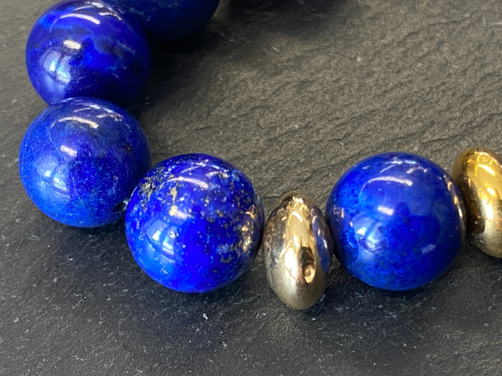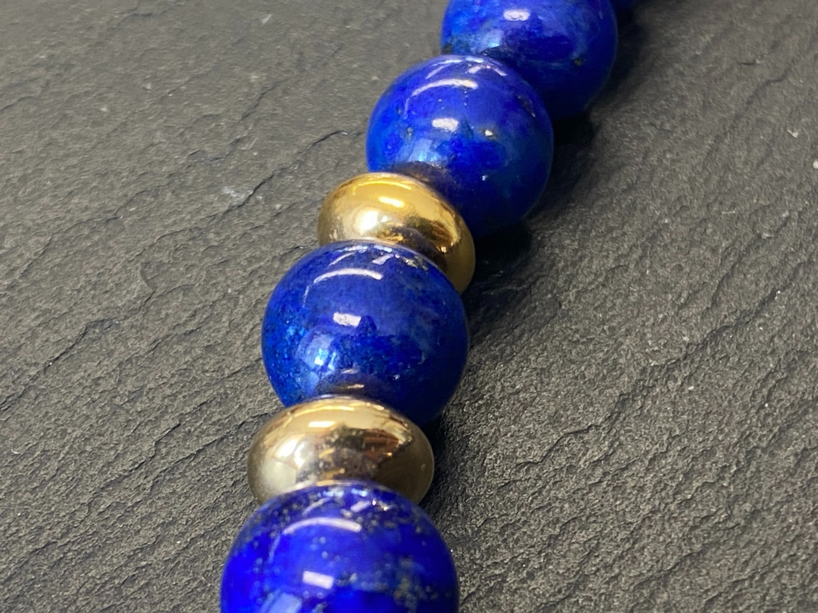 Massive Halskette mit großen Perlen aus Lapis Lazuli, diese haben je einen Durchmesser von ca. 1,2cm. Am Verschluss mit 925 gestempelt, die Dekoelemente zwischen den Perlen sind ebenfalls aus vergoldetem Metall, mit Niton DXL getestet – diese haben zum Teil kleine Dellen. Die Perlen weisen vereinzelt kleinere Strukturrisse auf, an keiner ist etwas abgebrochen. Das Metall ist oxydiert und leicht berieben. Gesamtlänge ca. 44cm, Gesamtgewicht ca. 88,61g. Die Begutachtung der Stücke wird vorgenommen von einem Fachmitglied der deutschen gemmologischen Gesellschaft E.V.