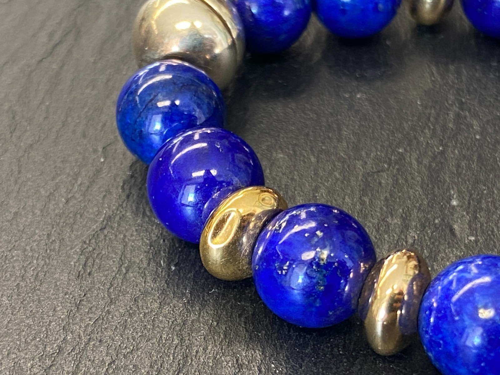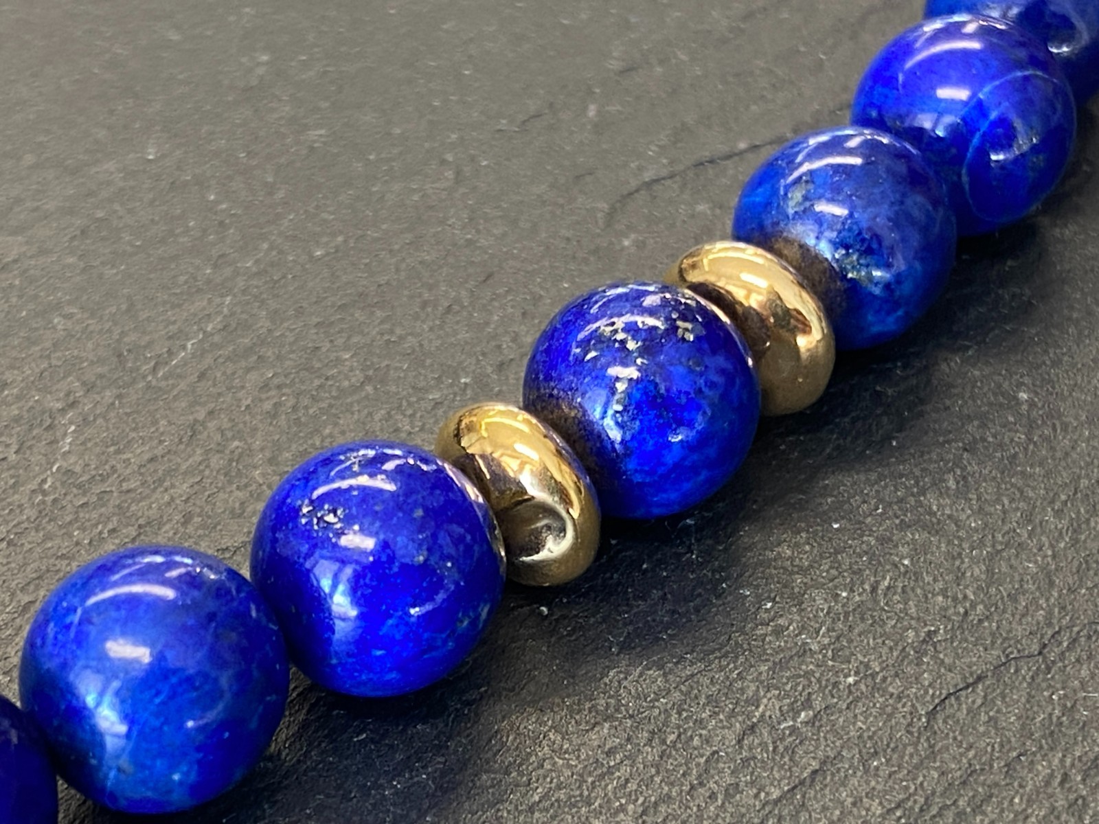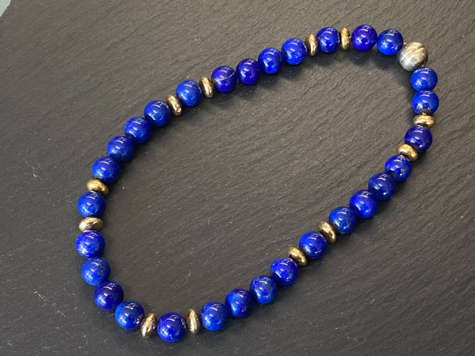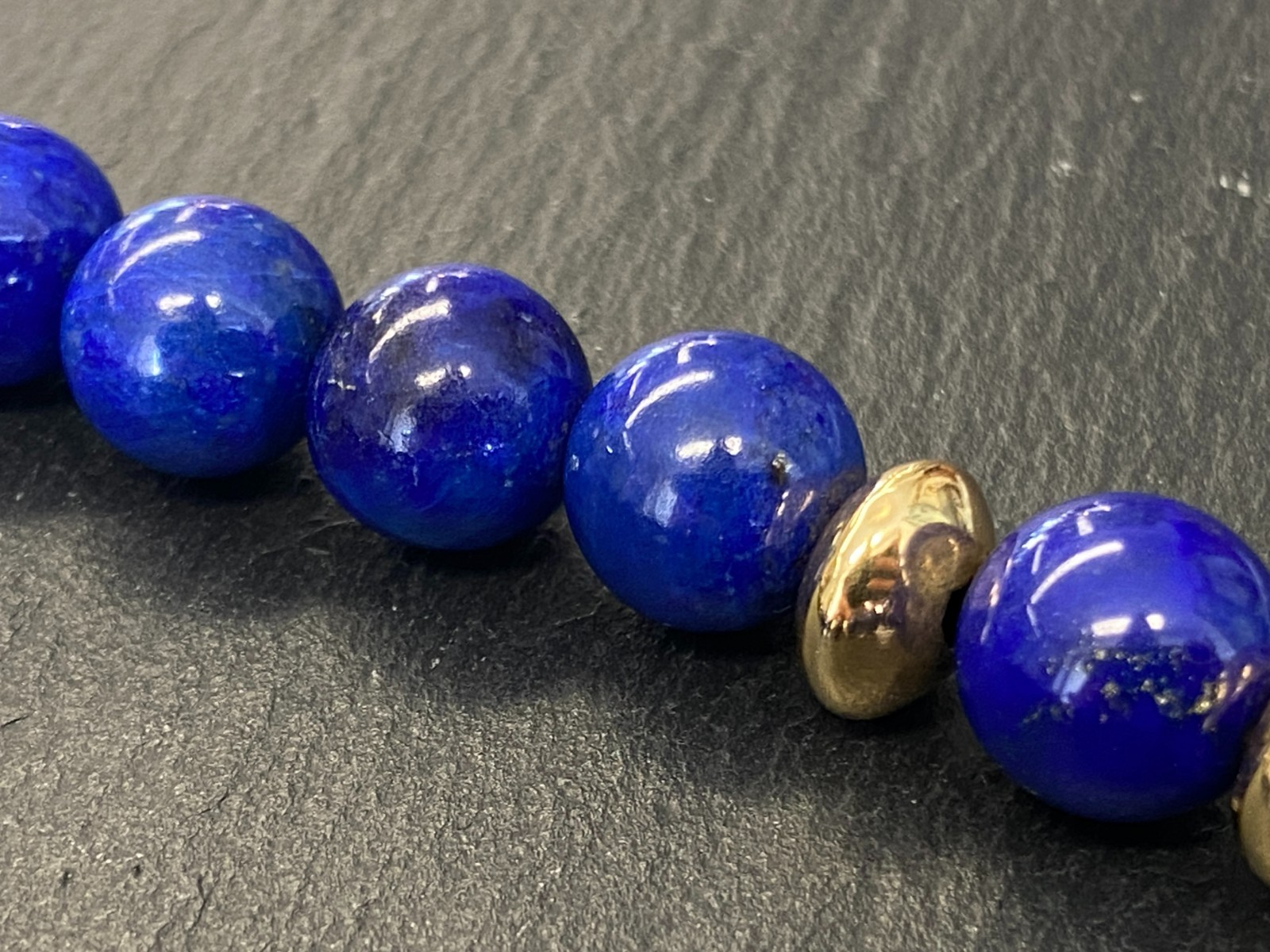 Massive Halskette mit großen Perlen aus Lapis Lazuli, diese haben je einen Durchmesser von ca. 1,2cm. Am Verschluss mit 925 gestempelt, die Dekoelemente zwischen den Perlen sind ebenfalls aus vergoldetem Metall, mit Niton DXL getestet – diese haben zum Teil kleine Dellen. Die Perlen weisen vereinzelt kleinere Strukturrisse auf, an keiner ist etwas abgebrochen. Das Metall ist oxydiert und leicht berieben. Gesamtlänge ca. 44cm, Gesamtgewicht ca. 88,61g. Die Begutachtung der Stücke wird vorgenommen von einem Fachmitglied der deutschen gemmologischen Gesellschaft E.V.